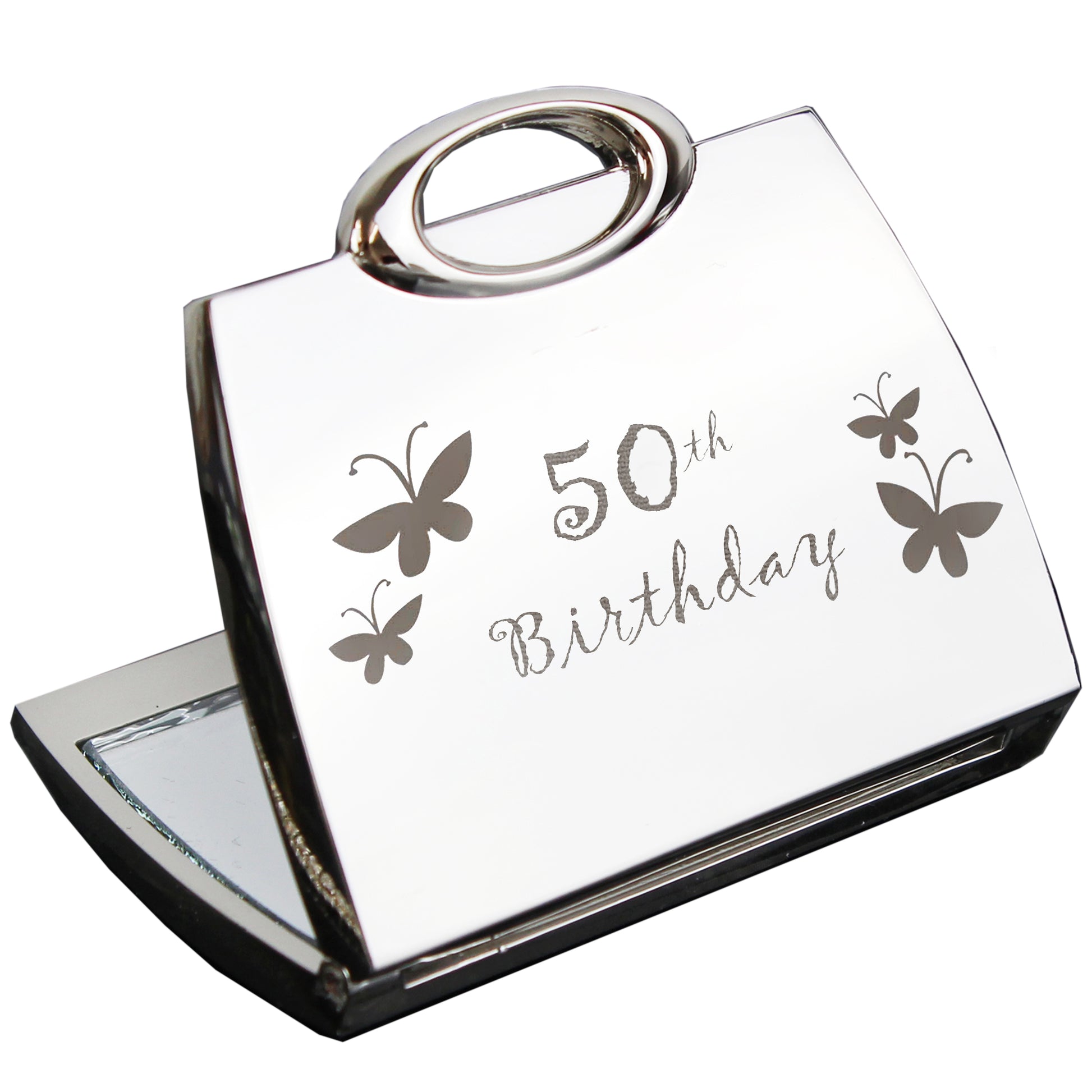 This silver finish handbag compact mirror features a butterfly motif and the wording '50th Birthday' as standard text.