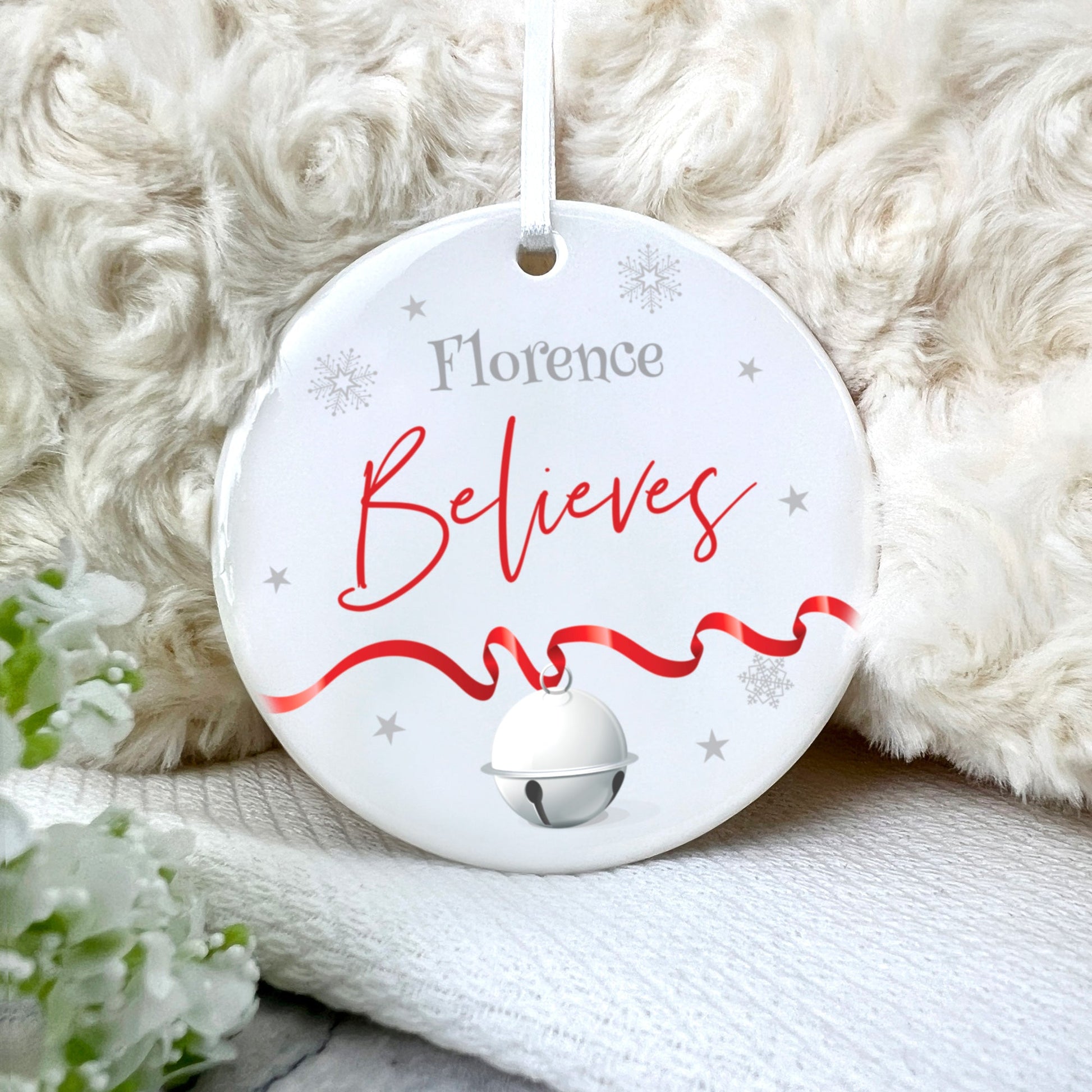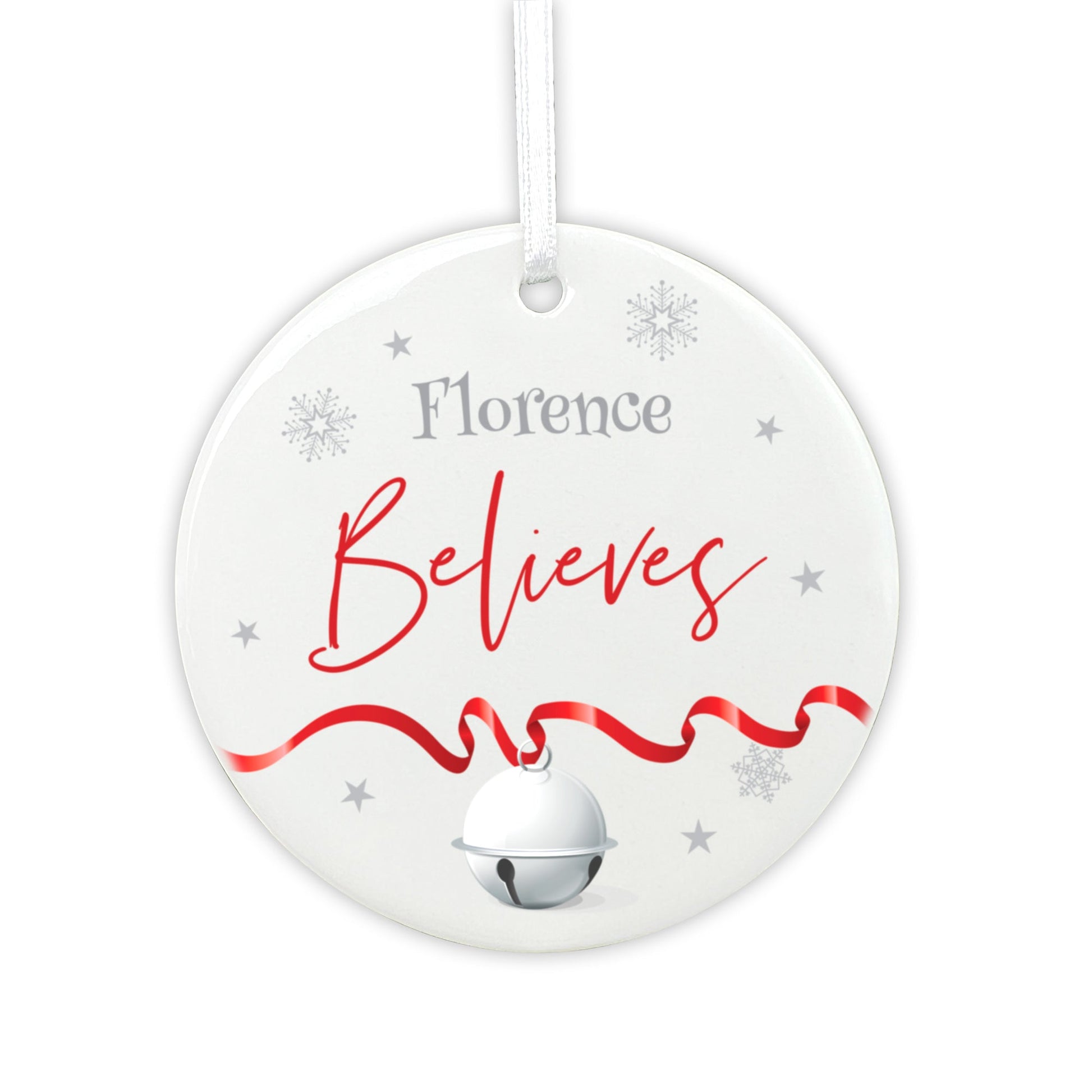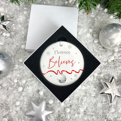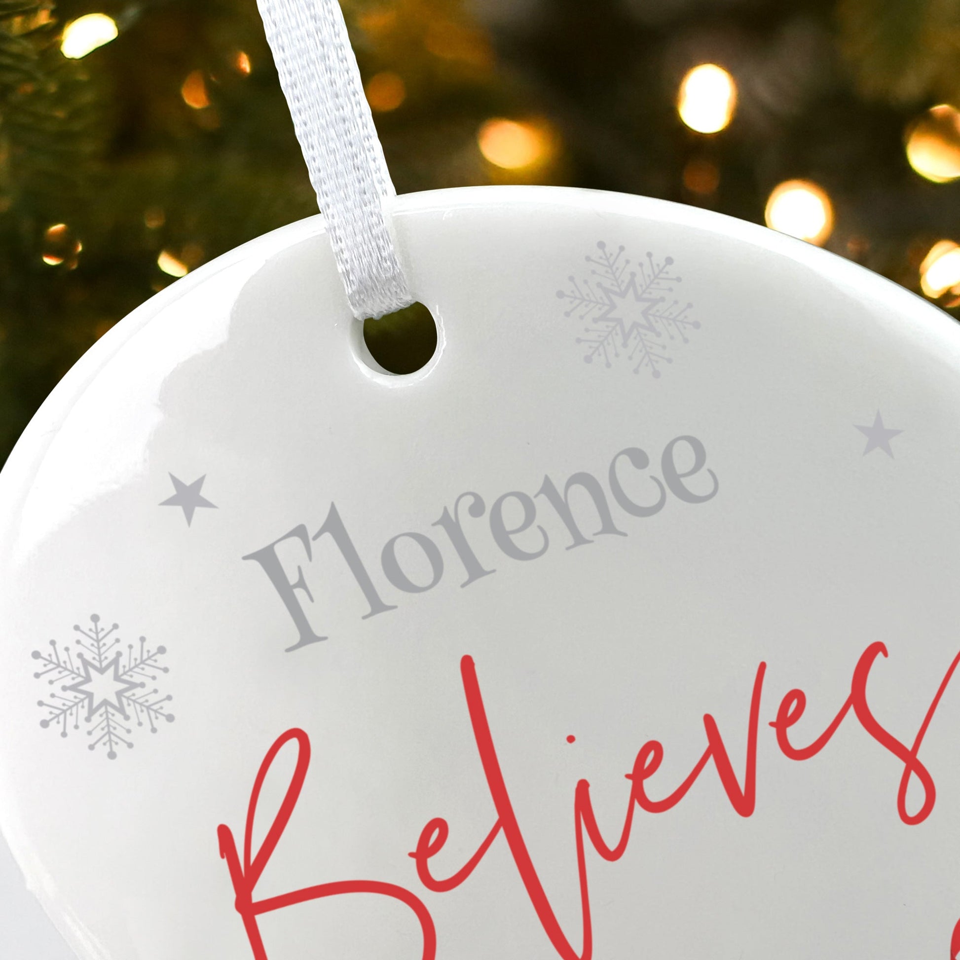 This personalised ceramic Christmas decoration can be personalised with any name up to 15 characters. "Believes" is fixed text.