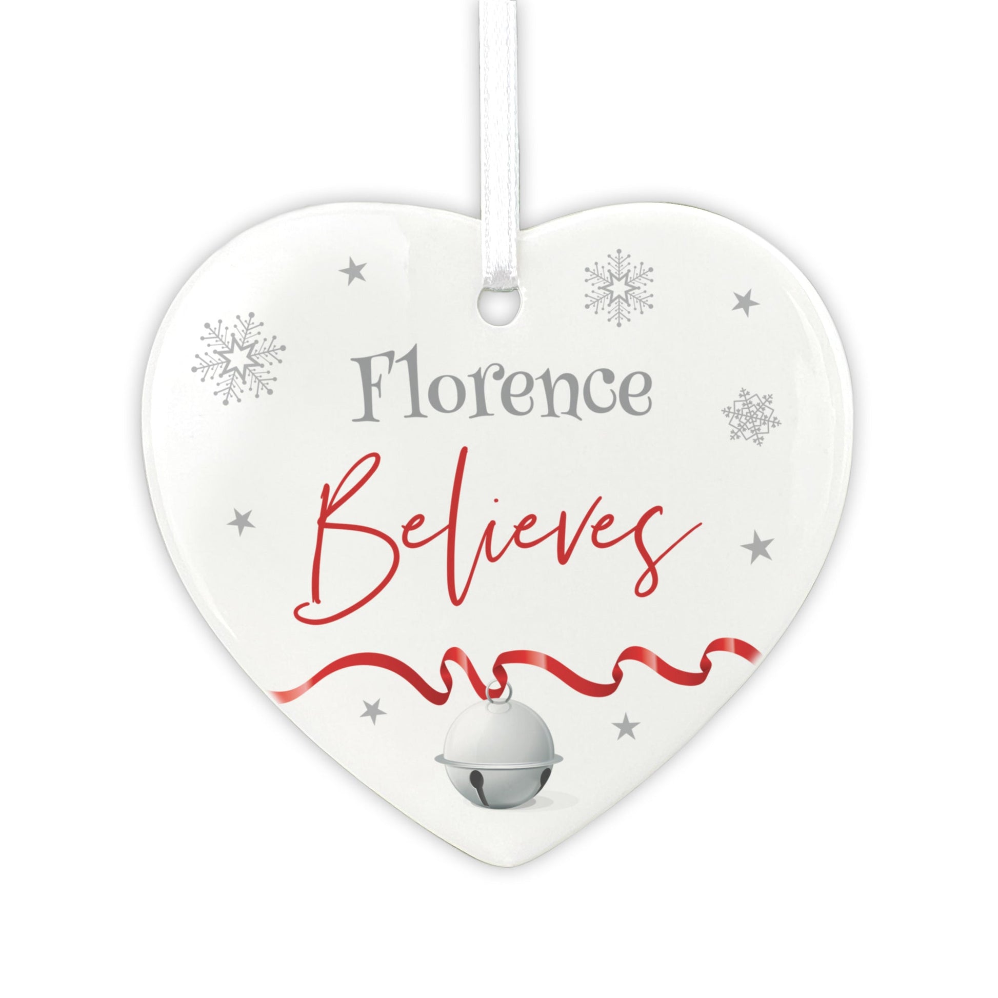 This personalised ceramic Christmas decoration can be personalised with any name up to 15 characters. "Believes" is fixed text.