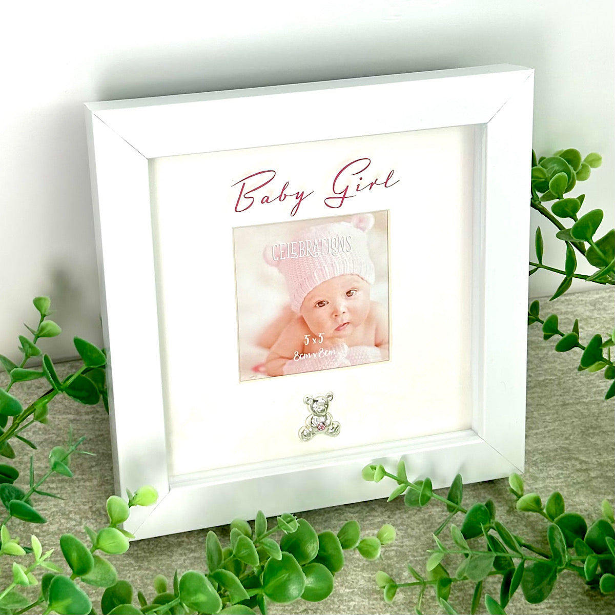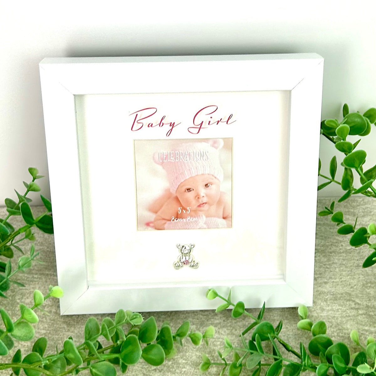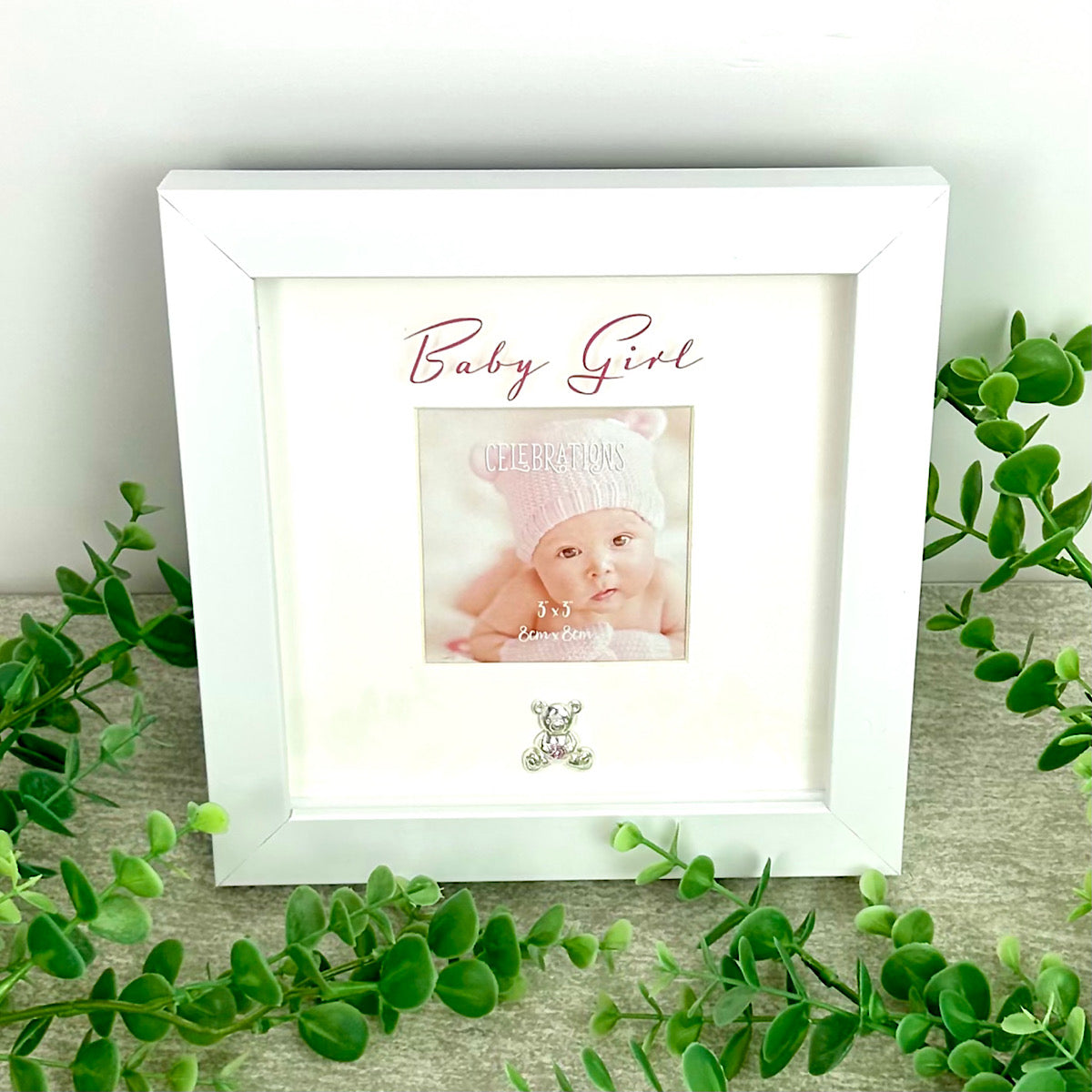 Capture the perfect early memory of your 'Baby Girl' with this silver-plated box photo frame. The frame displays a glossy white border around the photo and a silver-plated teddy bear icon with a pink crystal accent. The glass is adorned with a pink script title, giving it a special touch.