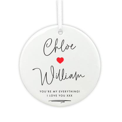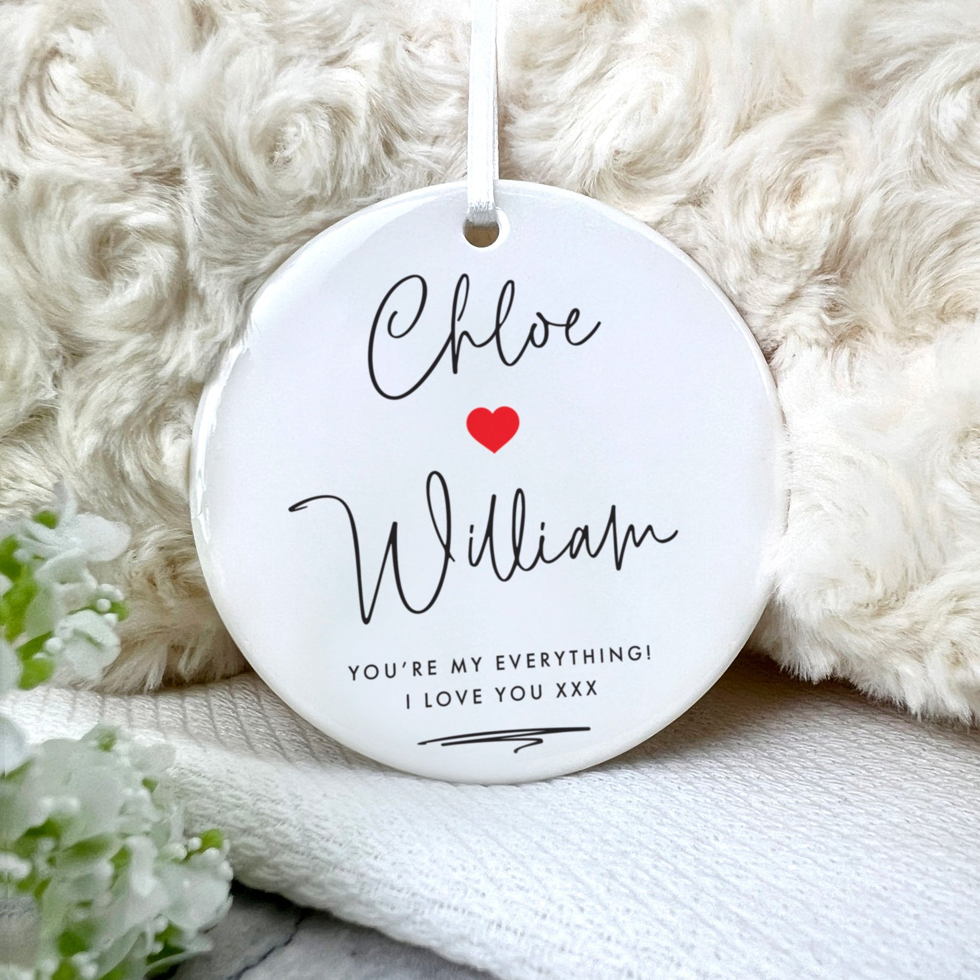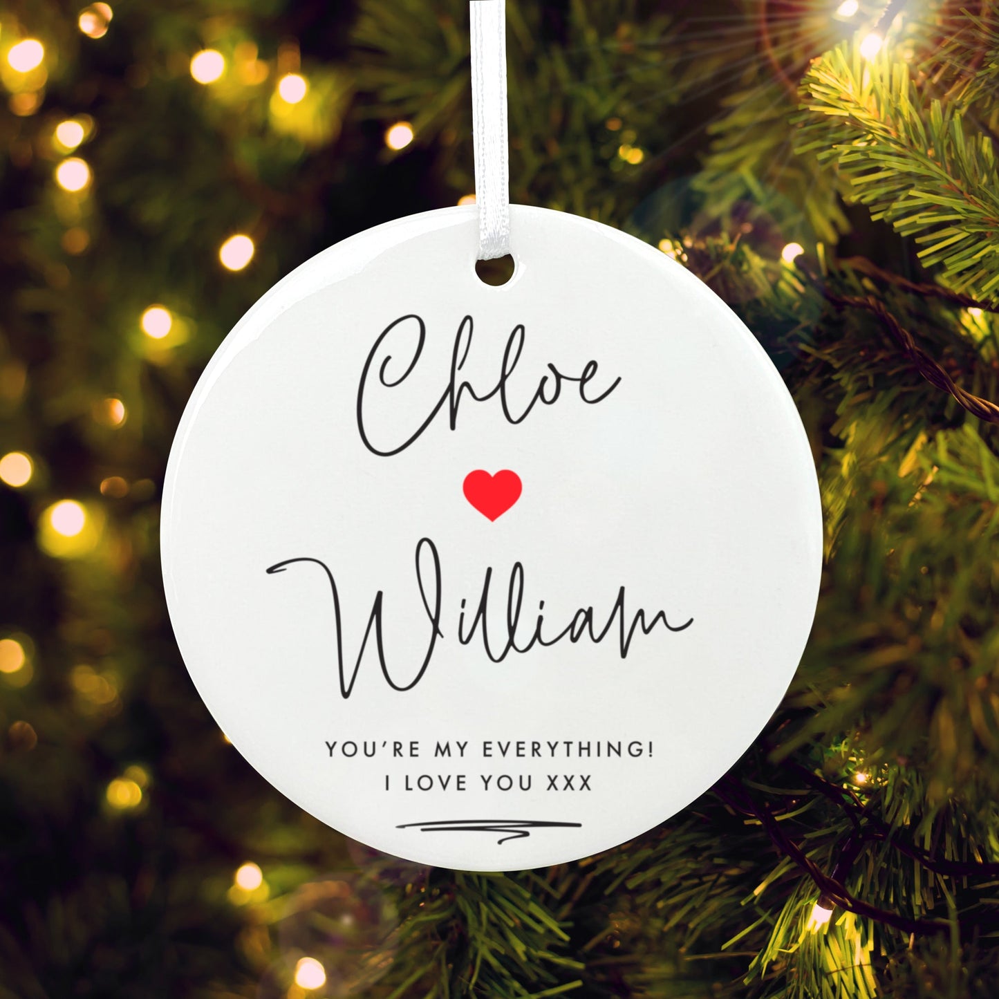 Perfect for couples or your loved one this Christmas, this custom ceramic ornament commemorates their first holiday season together or any Christmas anniversary. Presented in a white gift box with a protective foam insert, it makes a heartfelt Christmas gift for couples. You can personalise this ceramic decoration with two names and two lines of text to add a special touch.