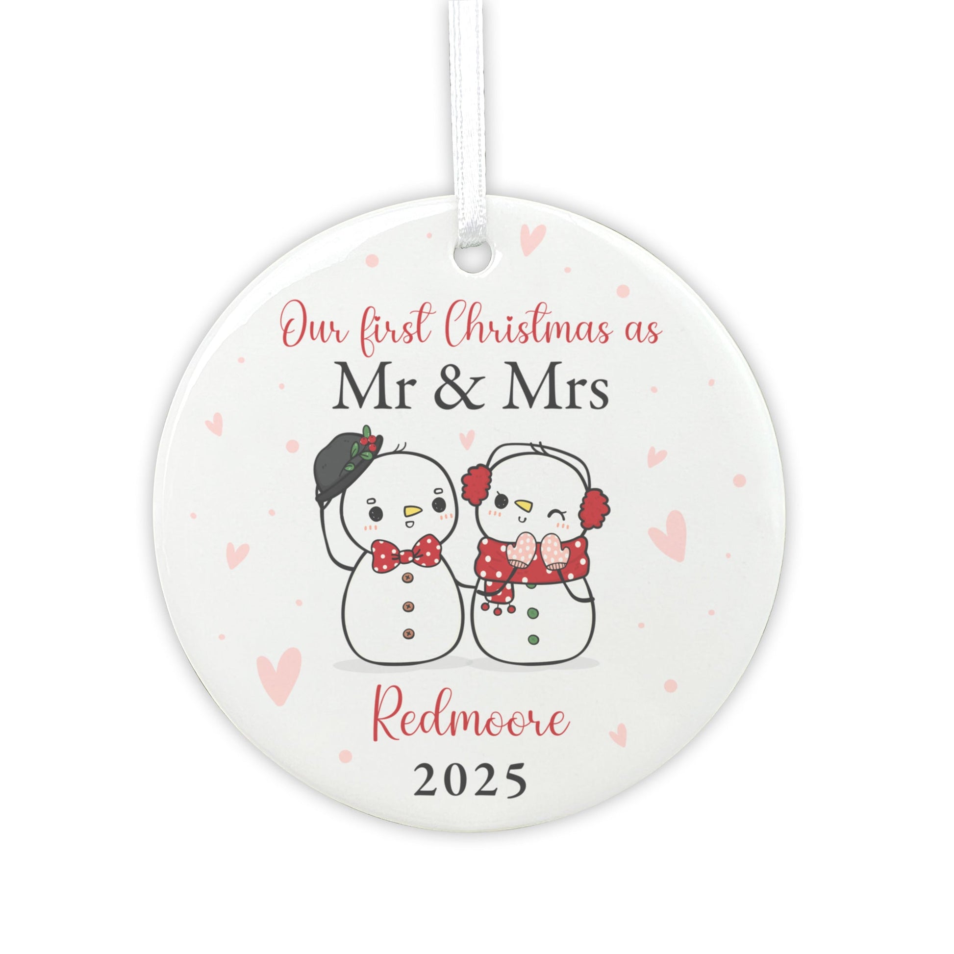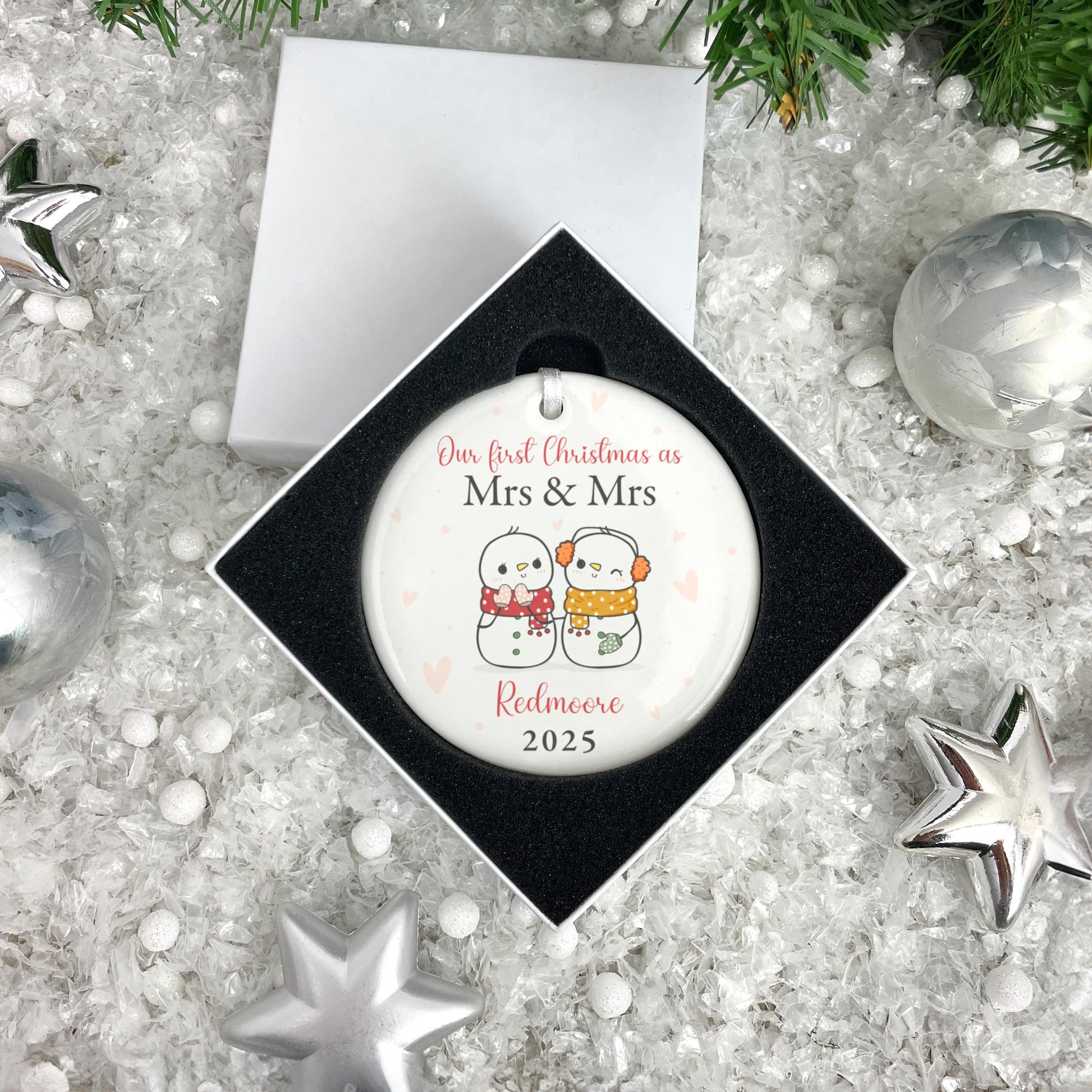 This delightful ceramic ornament showcases a lovable snowman couple, ideal for your partner or a cherished pair this Christmas. Customised to commemorate their first holiday season together or any Christmas anniversary, it is presented in a white box with a protective foam insert. A meaningful gift to celebrate love throughout the festive season. This personalised ceramic Christmas decoration can be customised with two names and two lines of text.
