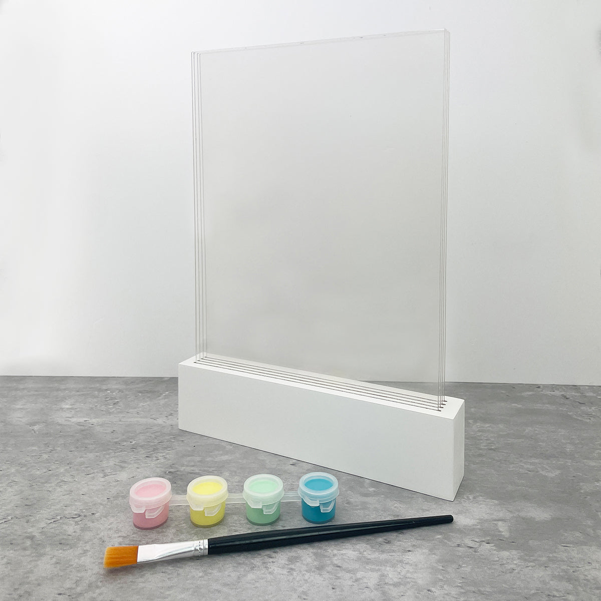 All-in-One Kit: Includes base, 4 sheets of acrylic (17.5 x 22.5cm), four non-toxic paints, paintbrush and step-by-step instructions
