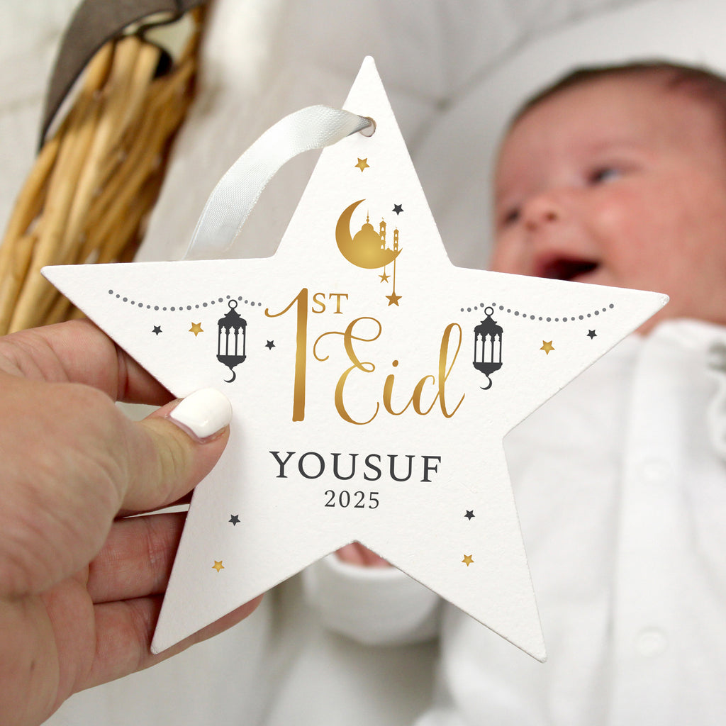 This personalised wooden star decoration is a lovely gift to celebrate baby's first Eid!