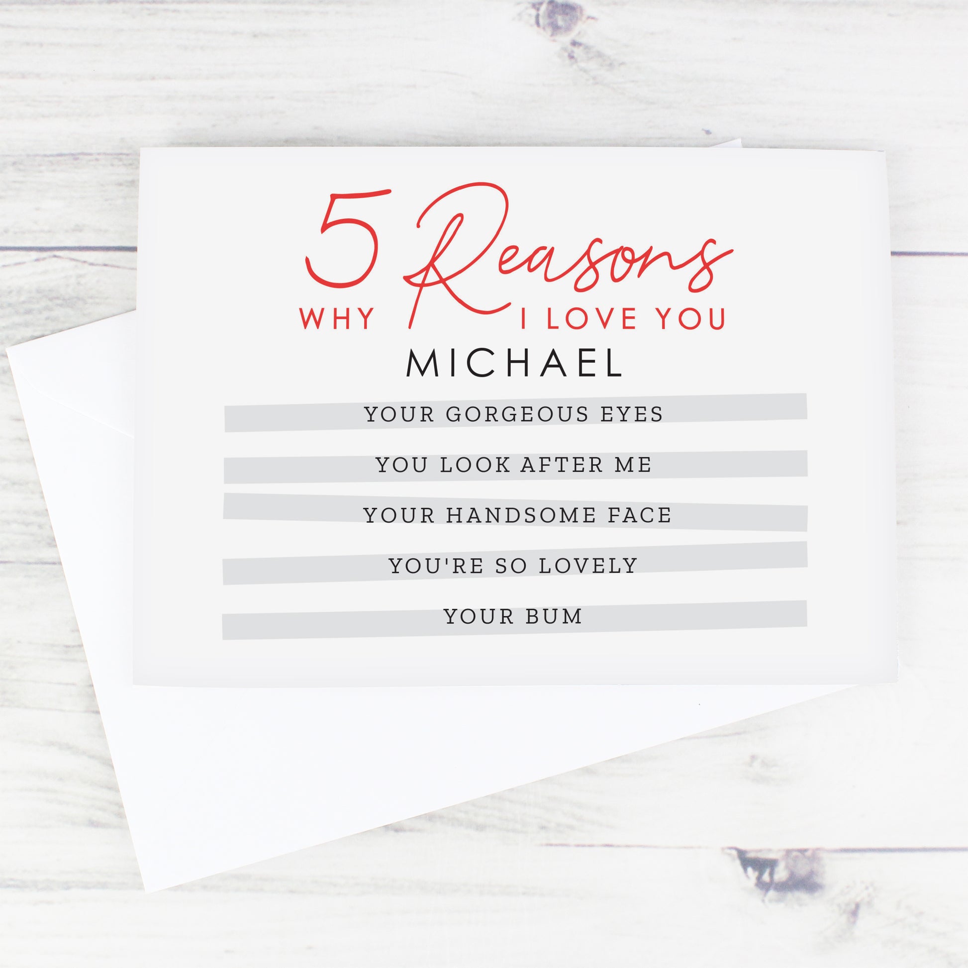 The text "5 Reasons why I love you" to the front is a fixed part of the design. Personalise with your 5 reasons to the front plus your own special message to the inside.