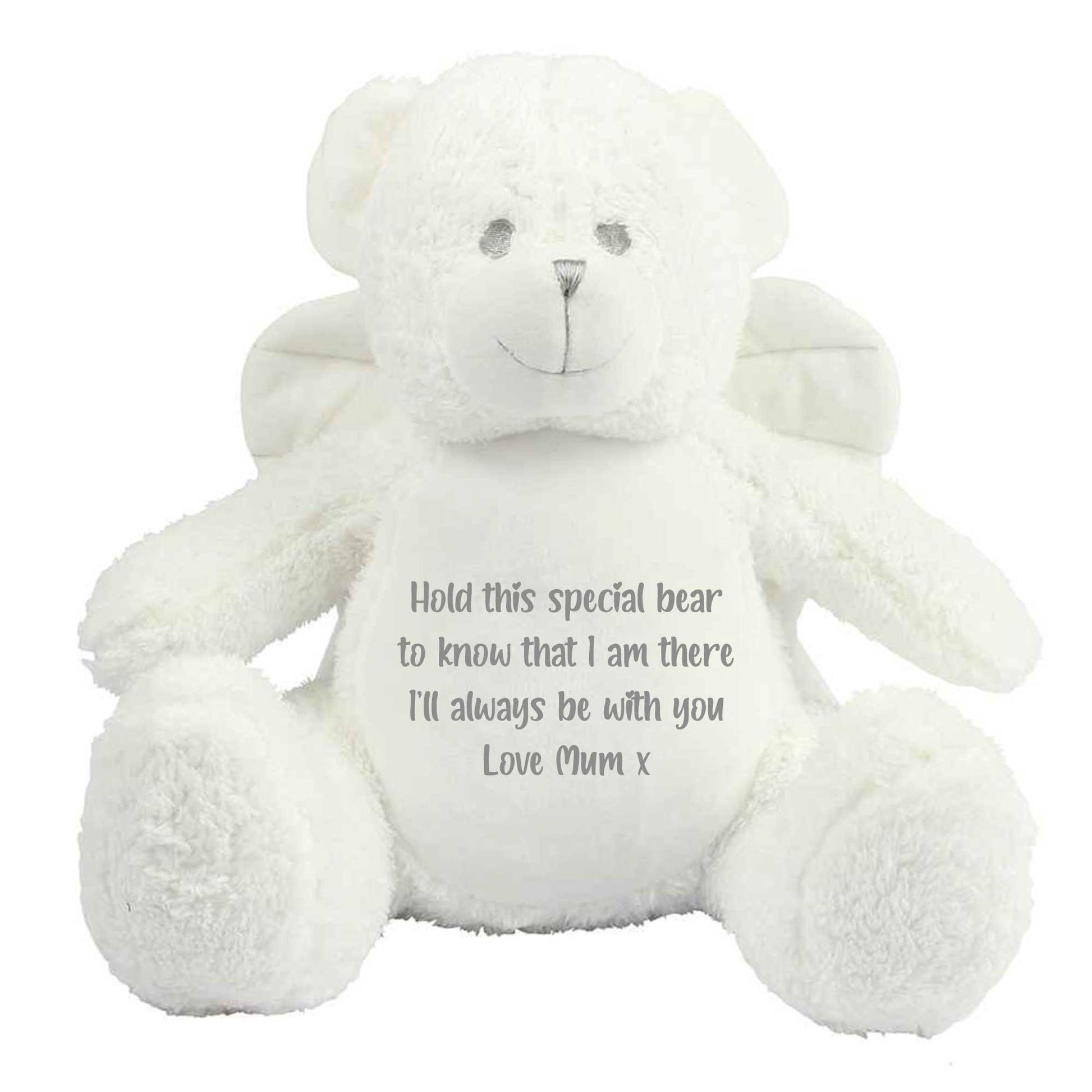 Offer comfort with this super-soft white teddy bear with angel wings, a lovely gift for someone grieving the loss of a loved one. Customise this charming bear with a photo and a heartfelt message of up to three lines.