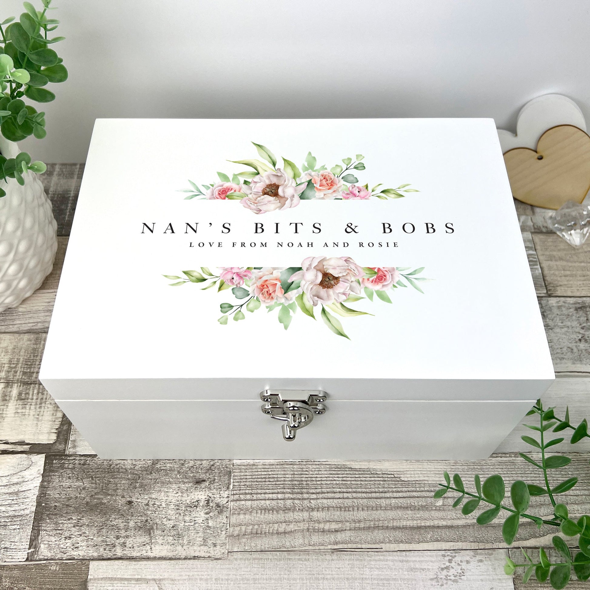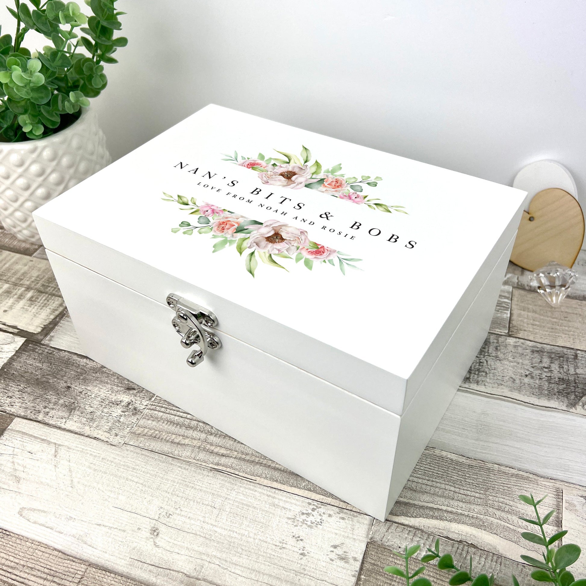Capture precious moments with this exquisite memory box, handcrafted from solid pine and finished in a serene white. A delicate, soft pink floral design, paired with two lines of personal text, makes this keepsake a perfect gift for any celebration. Ideal for birthdays, Mother's Day, anniversaries, or as a cherished wedding treasure.