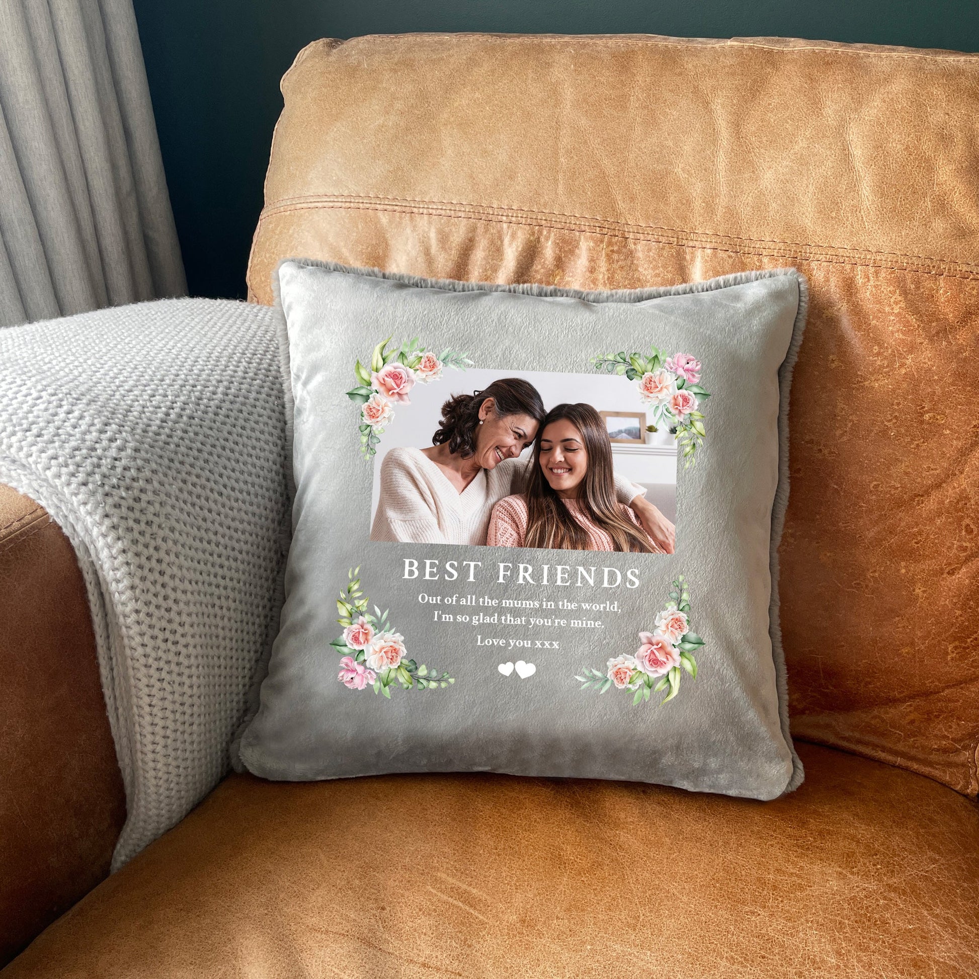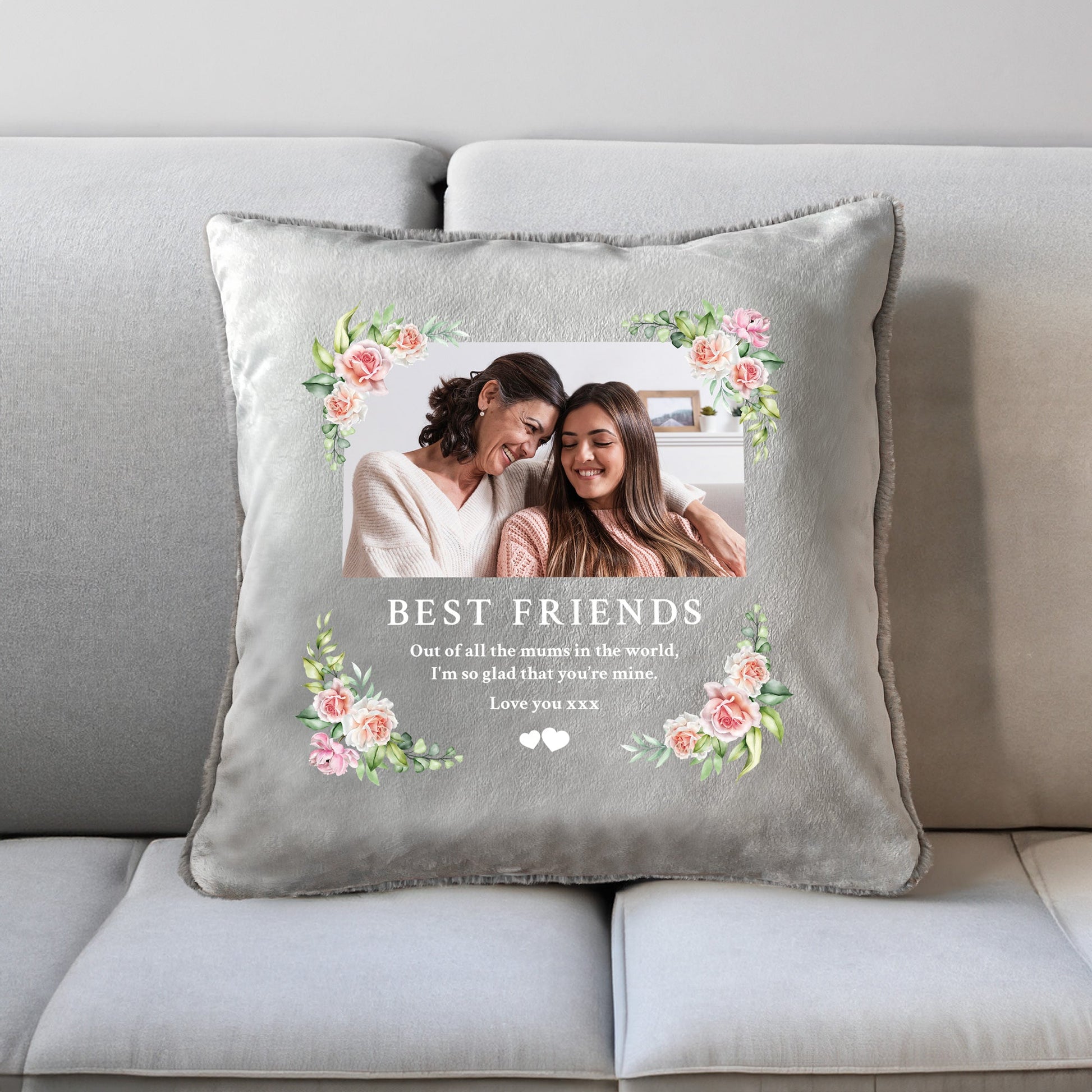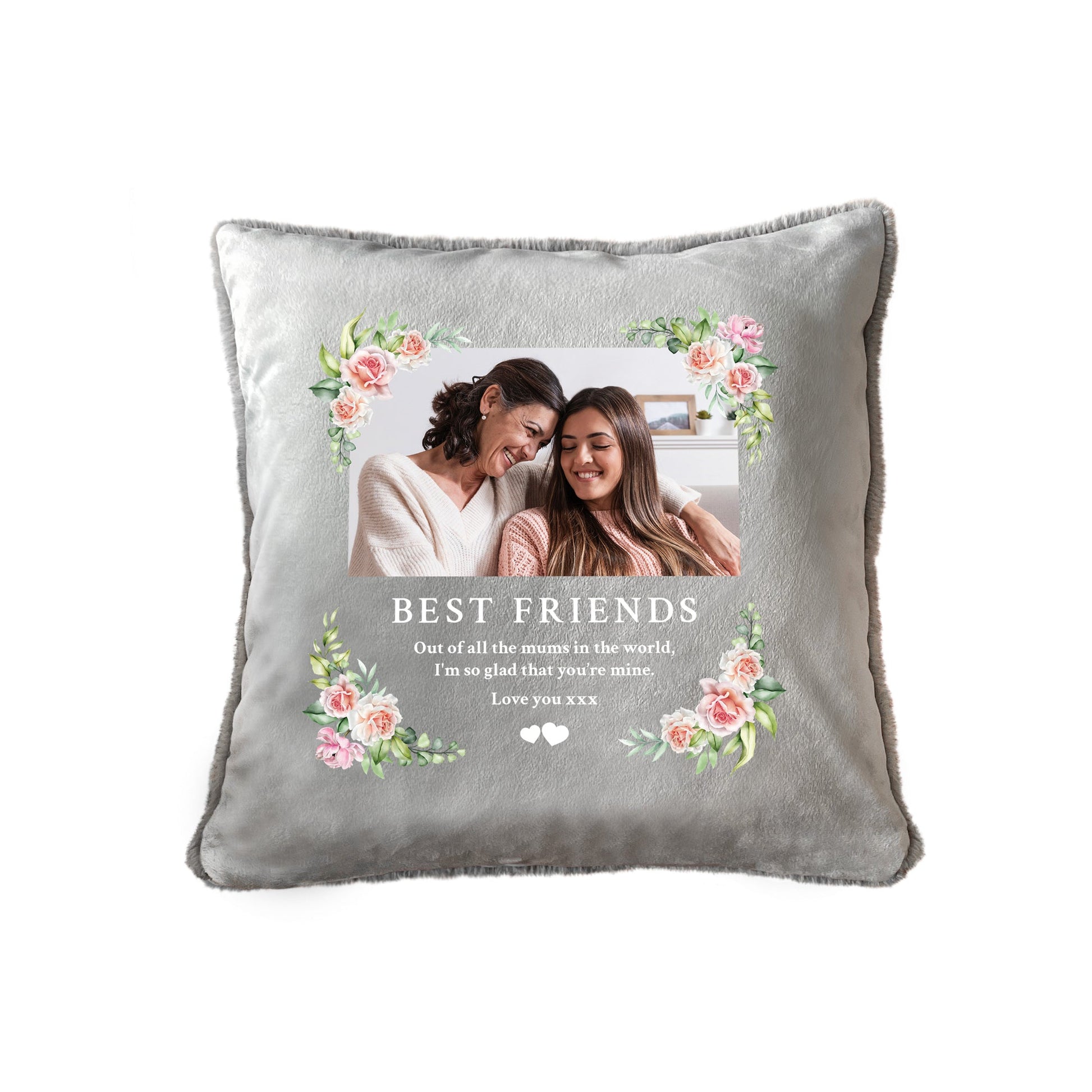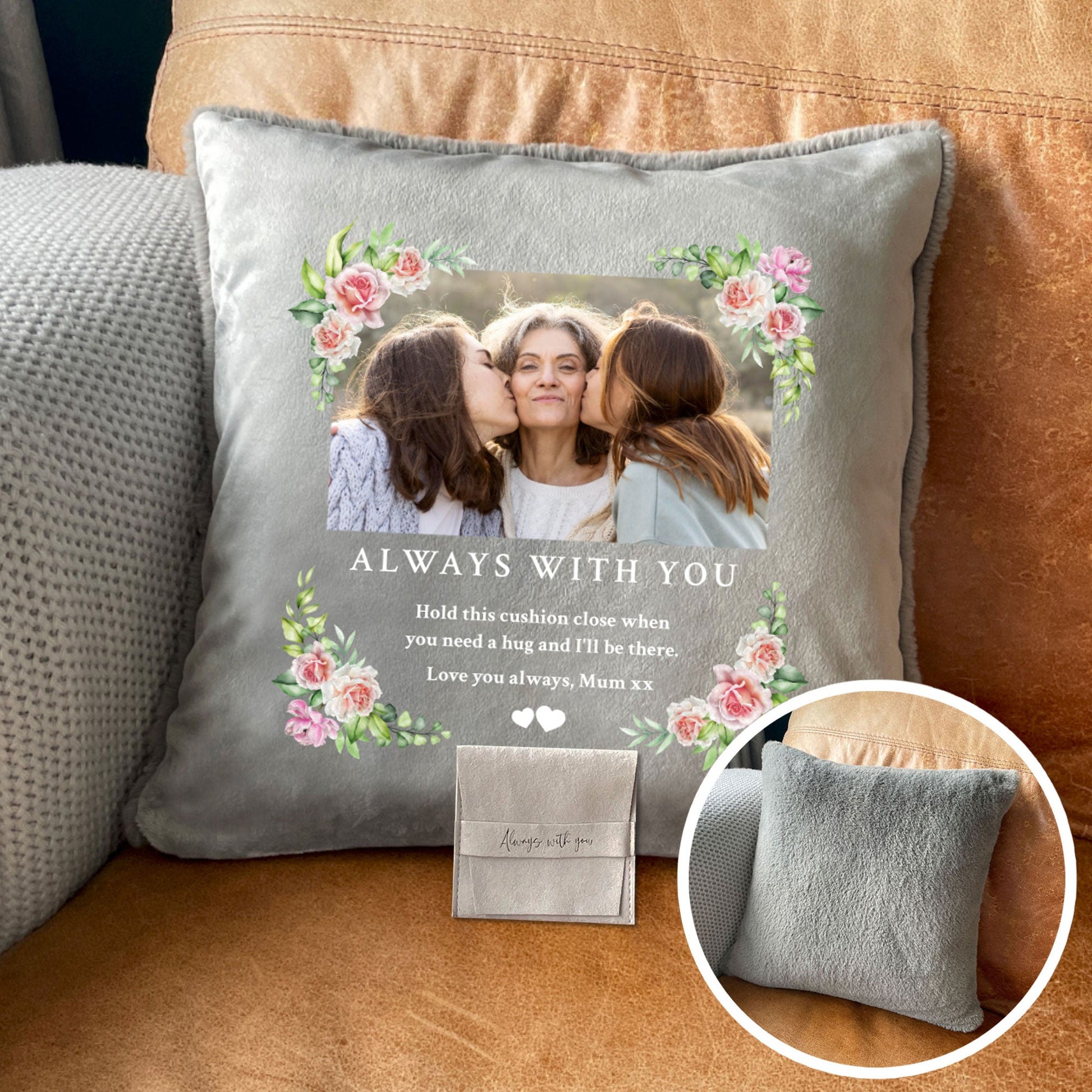Personalise the front of this grey cushion with your favourite photo of your missed loved one and four lines of a heartfelt message. A delicate pink floral design surrounds the photo and words, and small white hearts are included as standard. The back of the cushion is made with the softest plush material, perfect for cuddling.