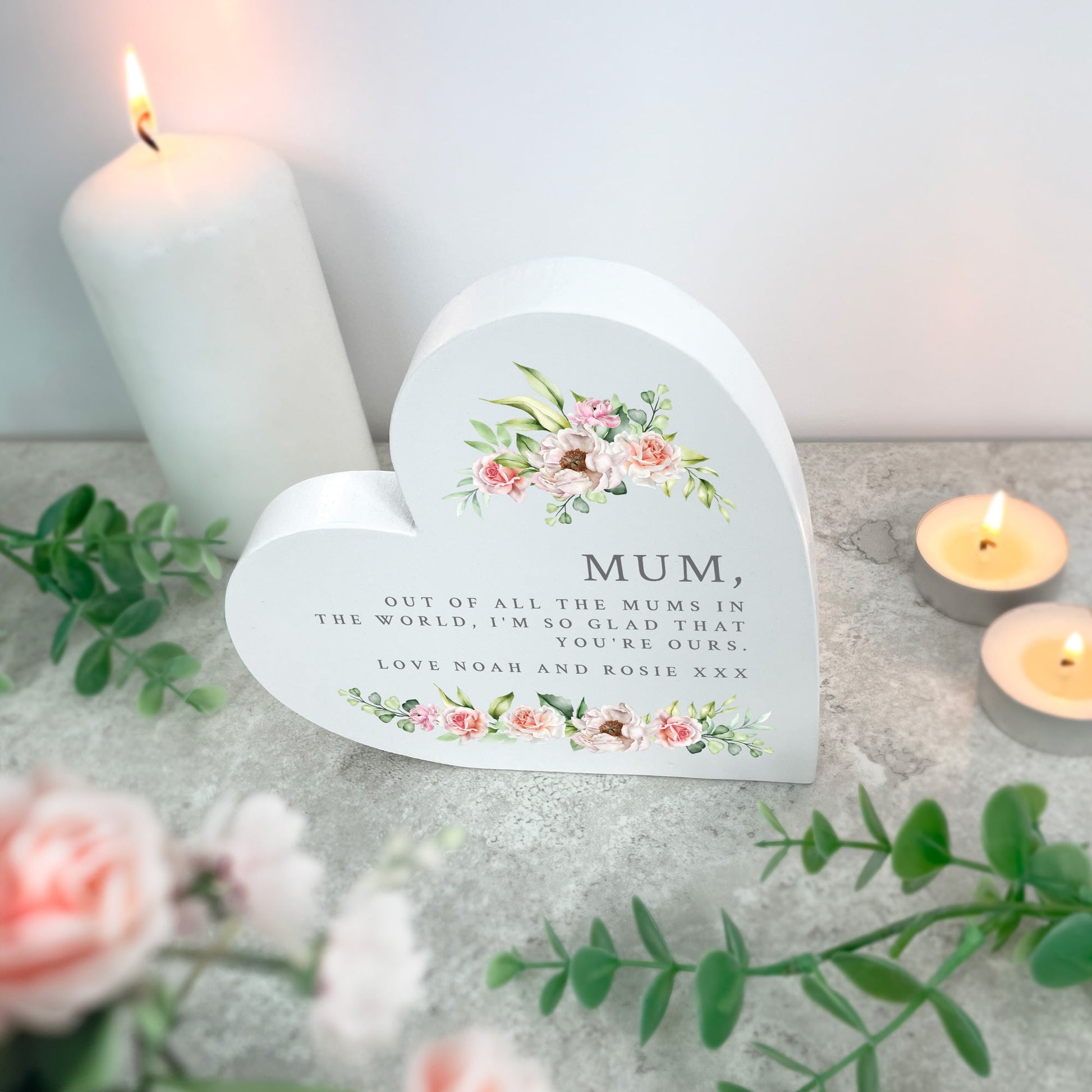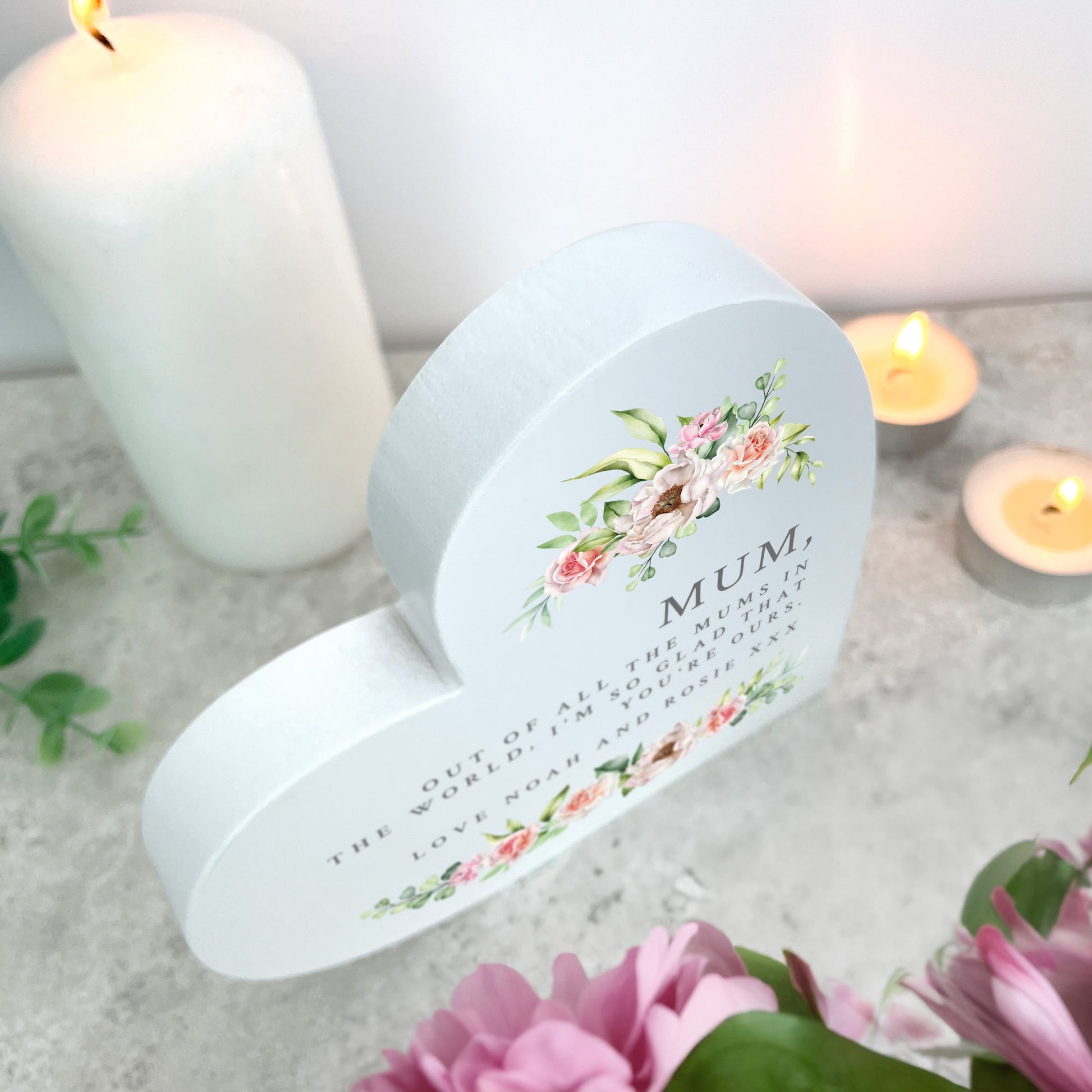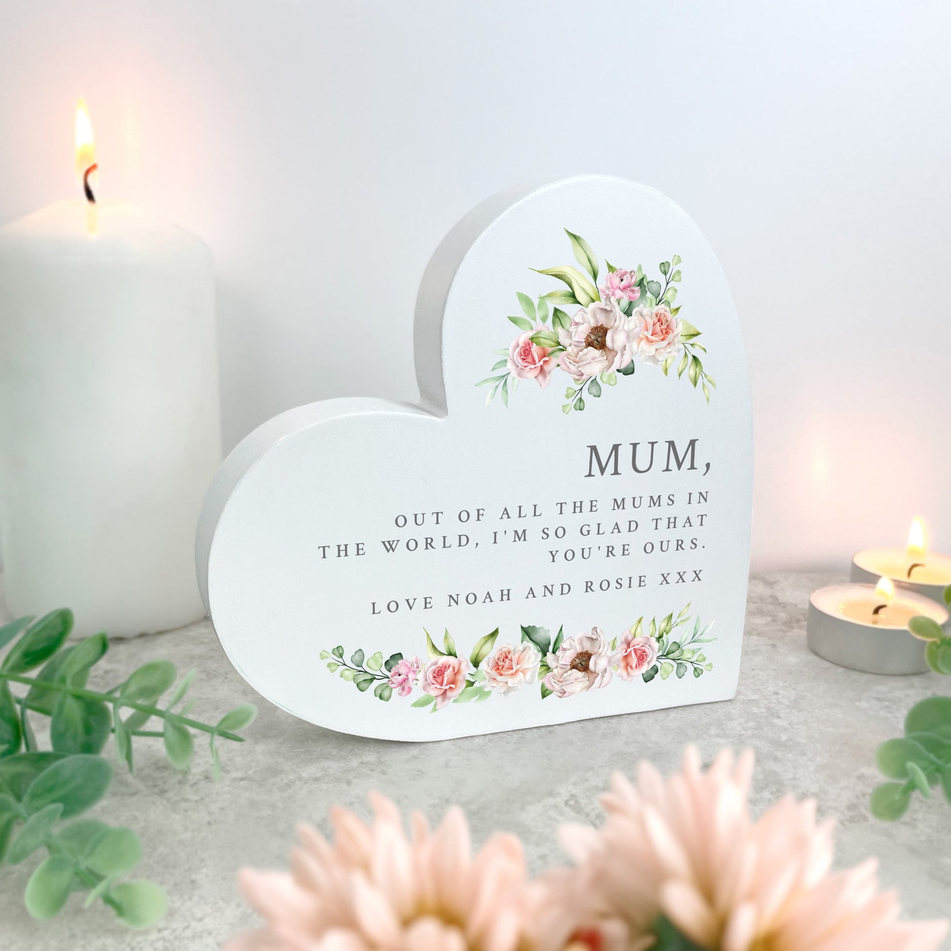 Express your love and gratitude to Mum, Grandma, or Step Mum with this beautiful white wooden heart ornament. This special gift, featuring a lovely pink floral design, can be personalised with a message of your choice in 5 lines. It's a keepsake that will be cherished for years!