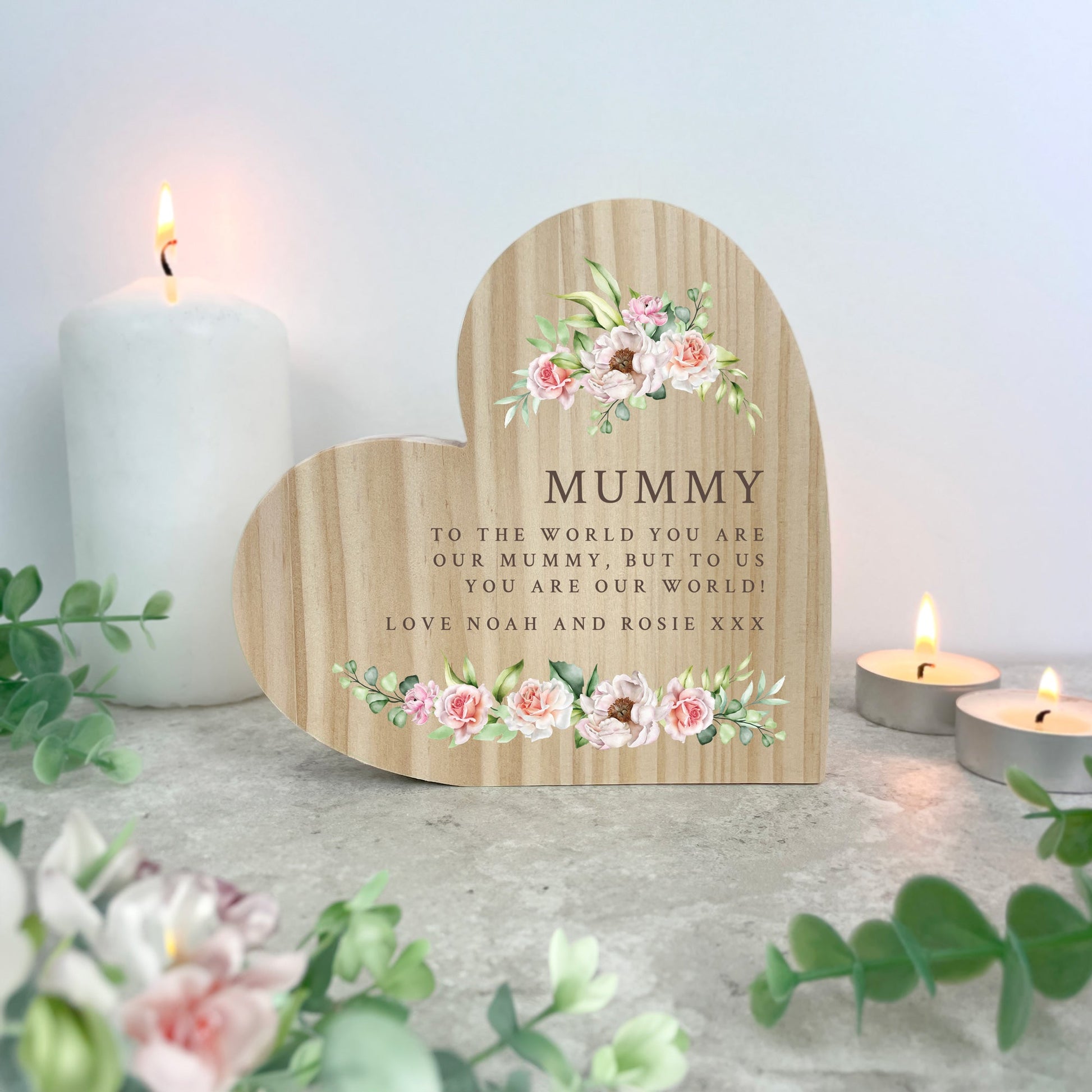 Express your love and appreciation with the charming Personalised Any Message Pink Floral Wooden Freestanding Heart. This lovely keepsake features a gorgeous floral design and allows you to add a custom message across 5 lines. A truly cherished gift for Mum, Grandma, or Step Mum.