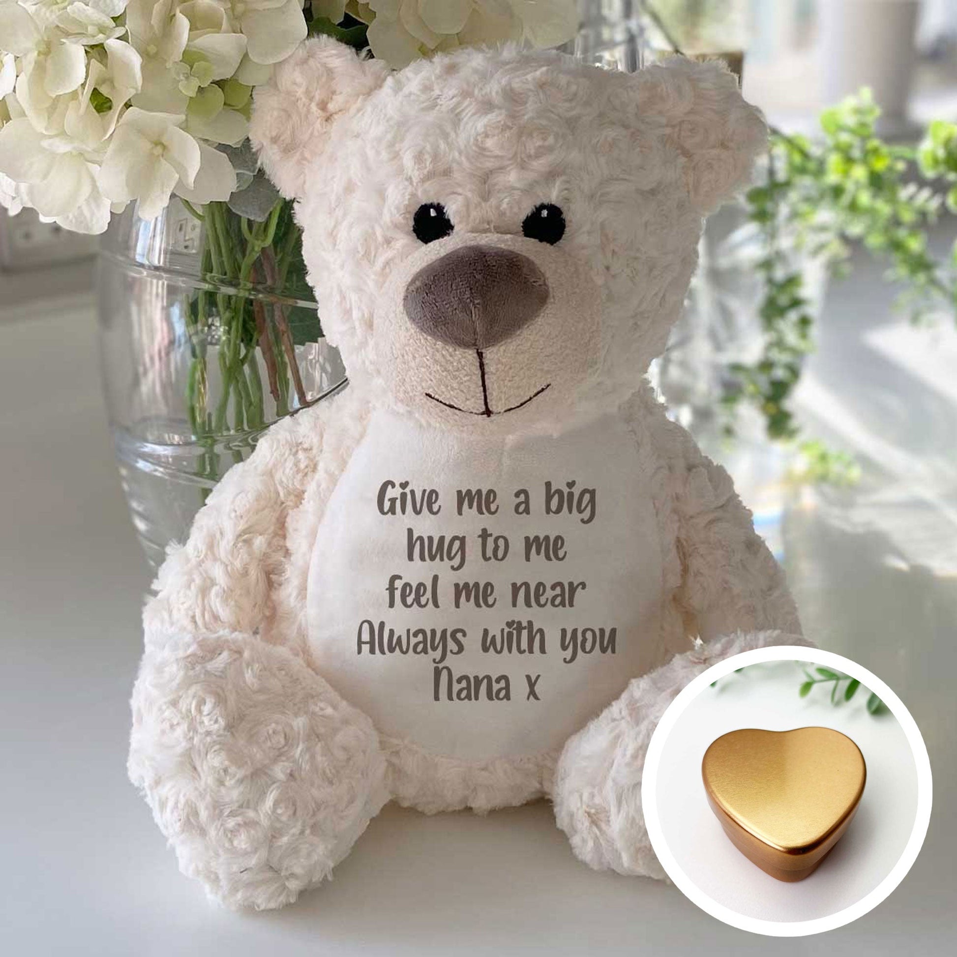 Our Ashes Memory Teddies offer a comforting way to hold a small amount of ashes inside a heart-shaped metal container. This container fits snugly in a bag at the back of our cuddly teddy.