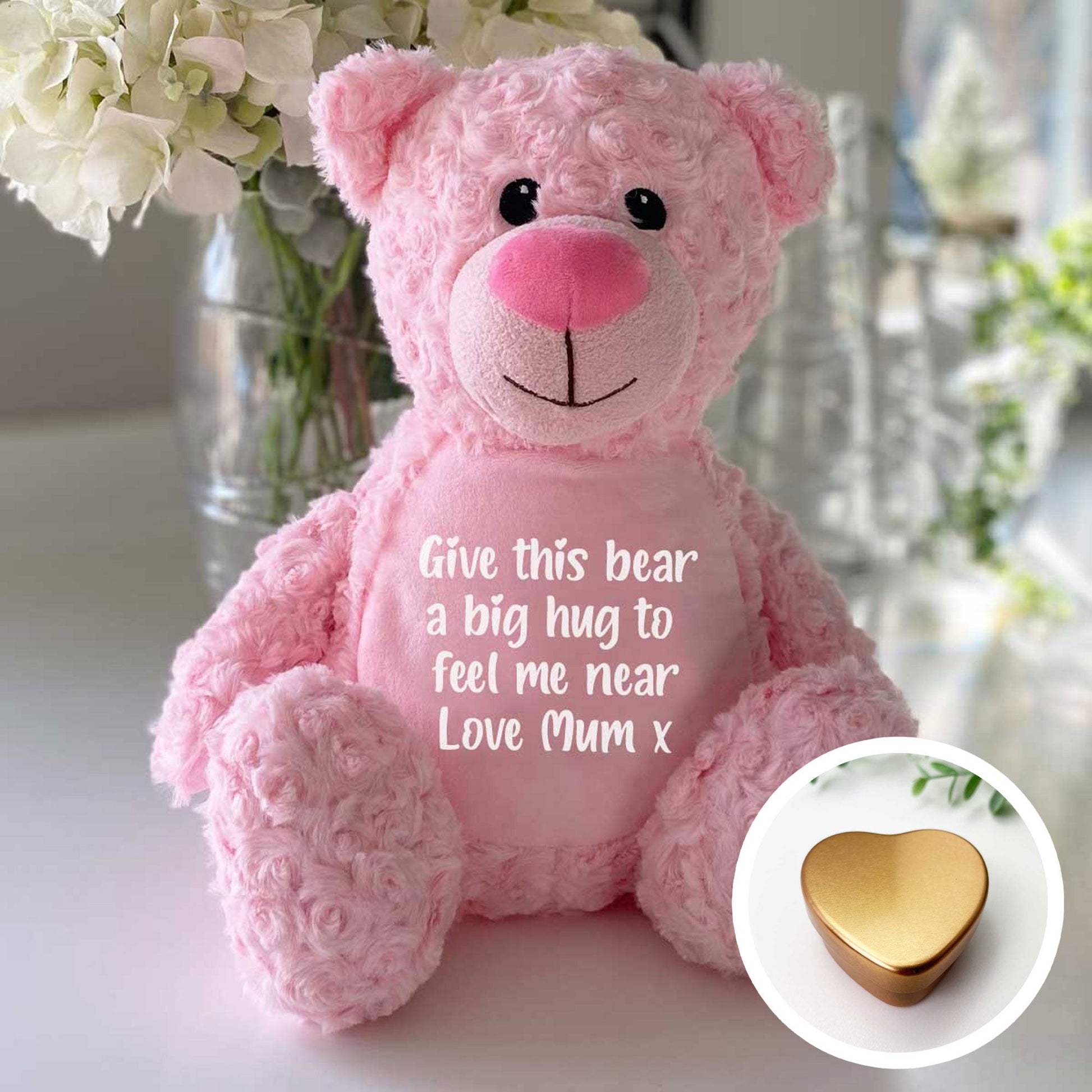Our Ashes Memory Teddies offer a comforting way to hold a small amount of ashes inside a heart-shaped metal container. This container fits snugly in a bag at the back of our cuddly teddy.