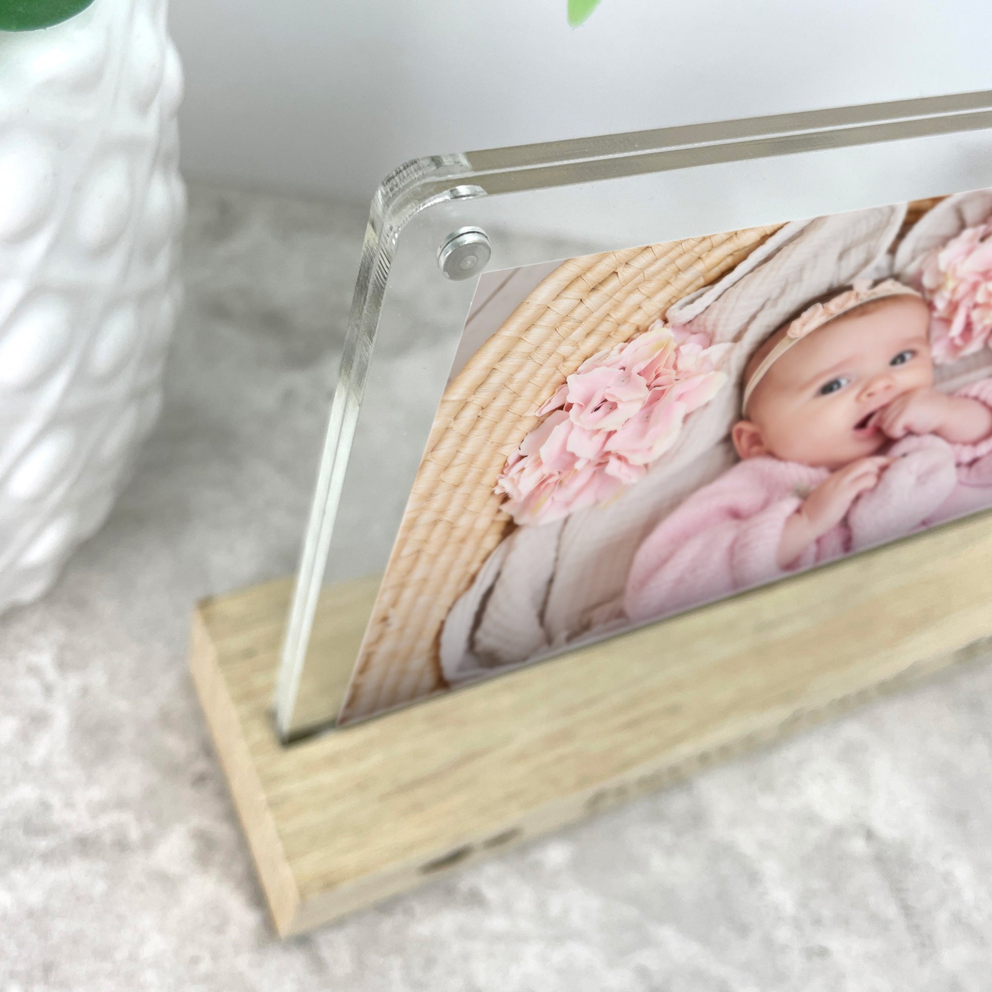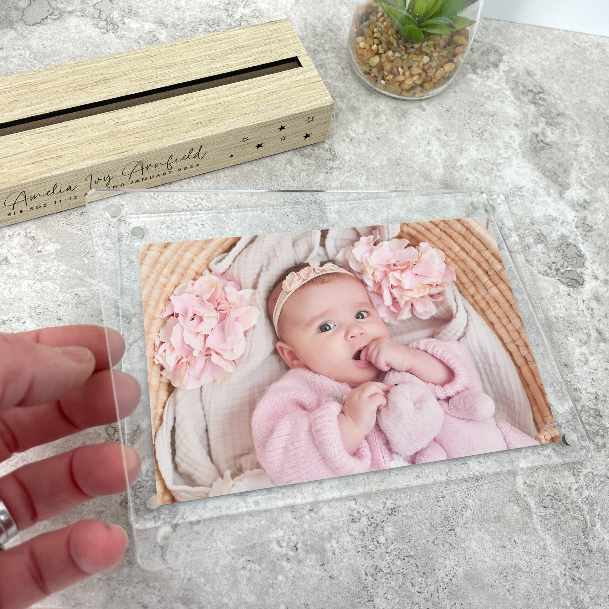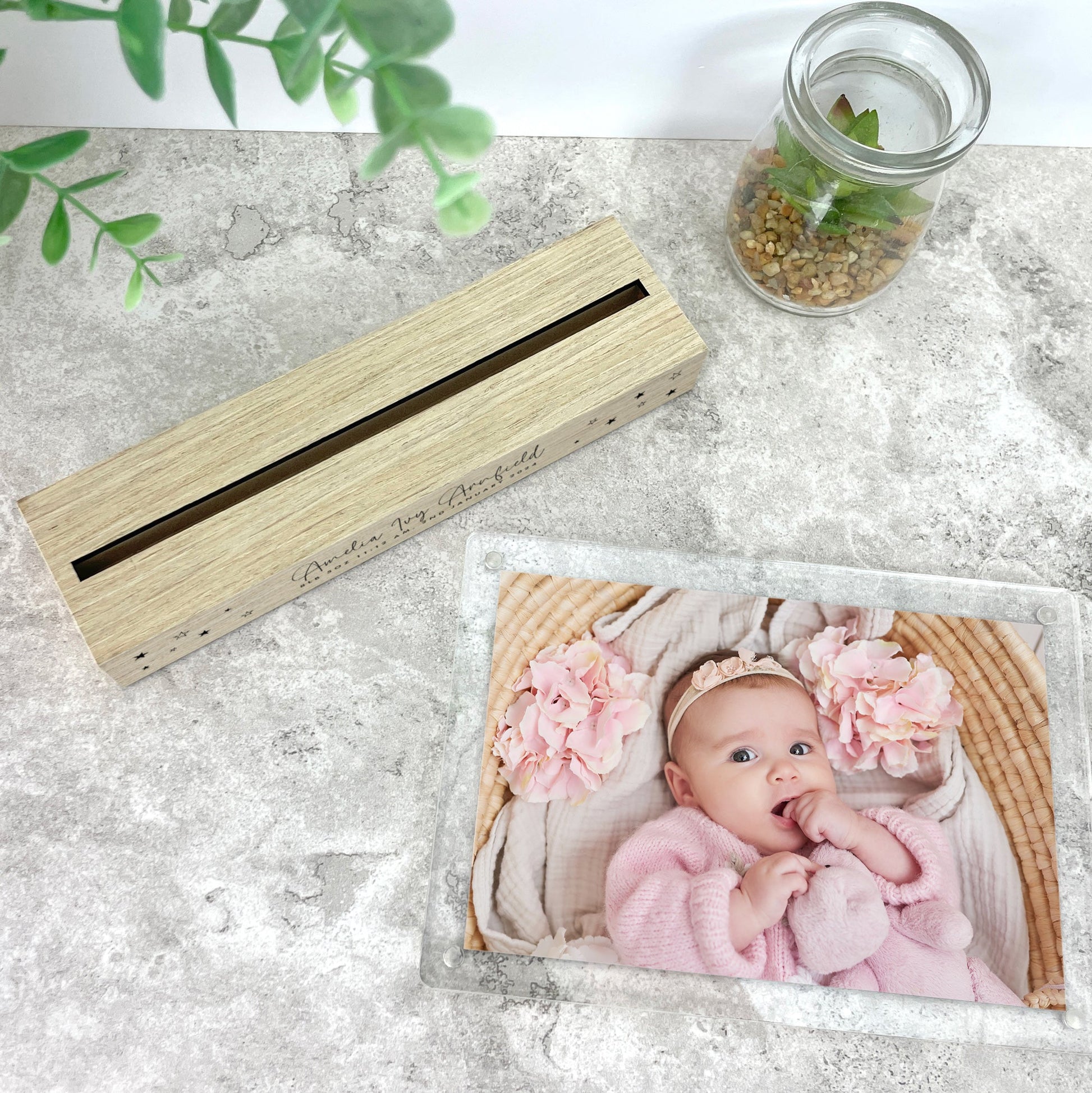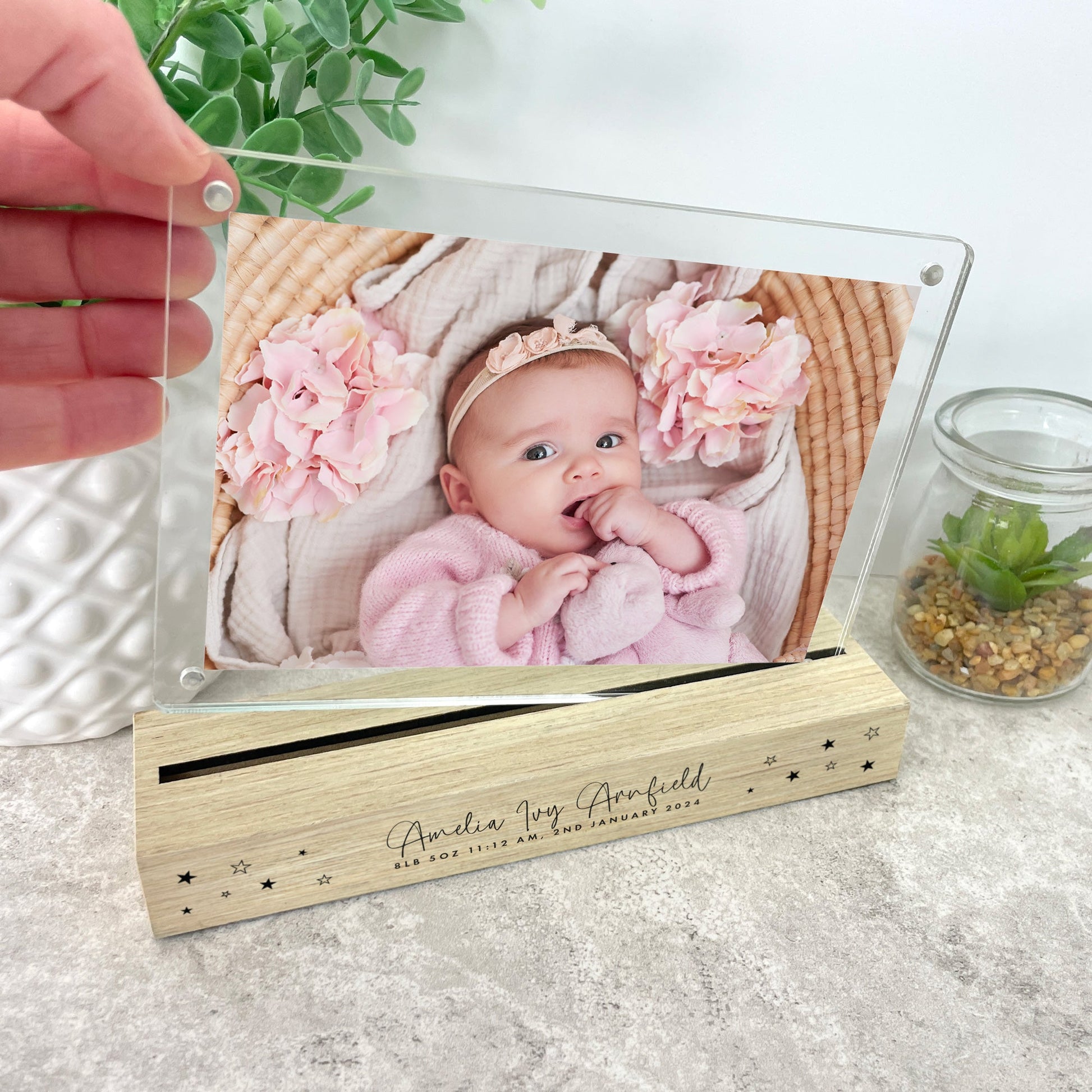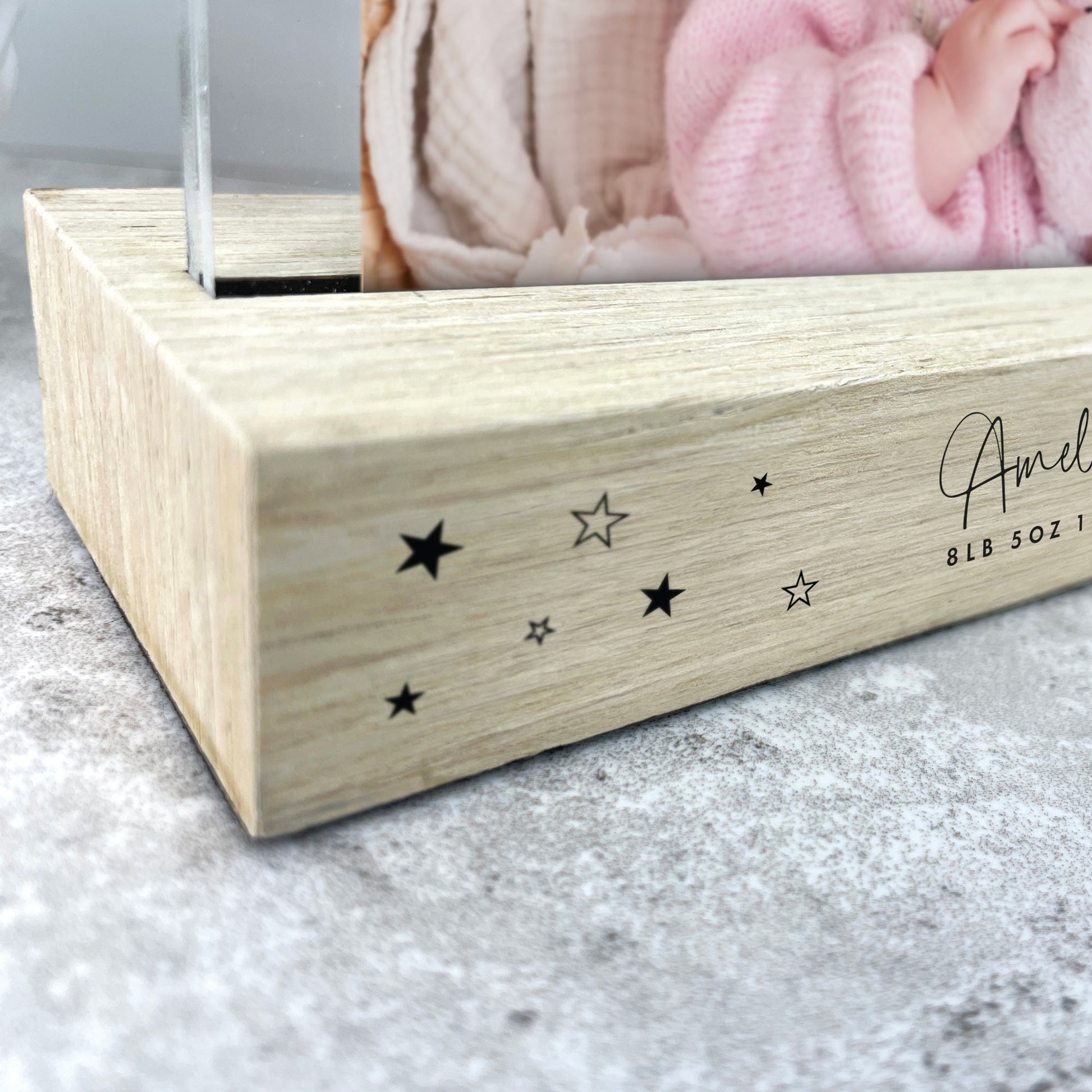 The solid wood base can be personalised with a line of text and your baby's name, date of birth, time of birth, and birth weight. You can easily insert your favourite photograph into the detachable acrylic photo holder.