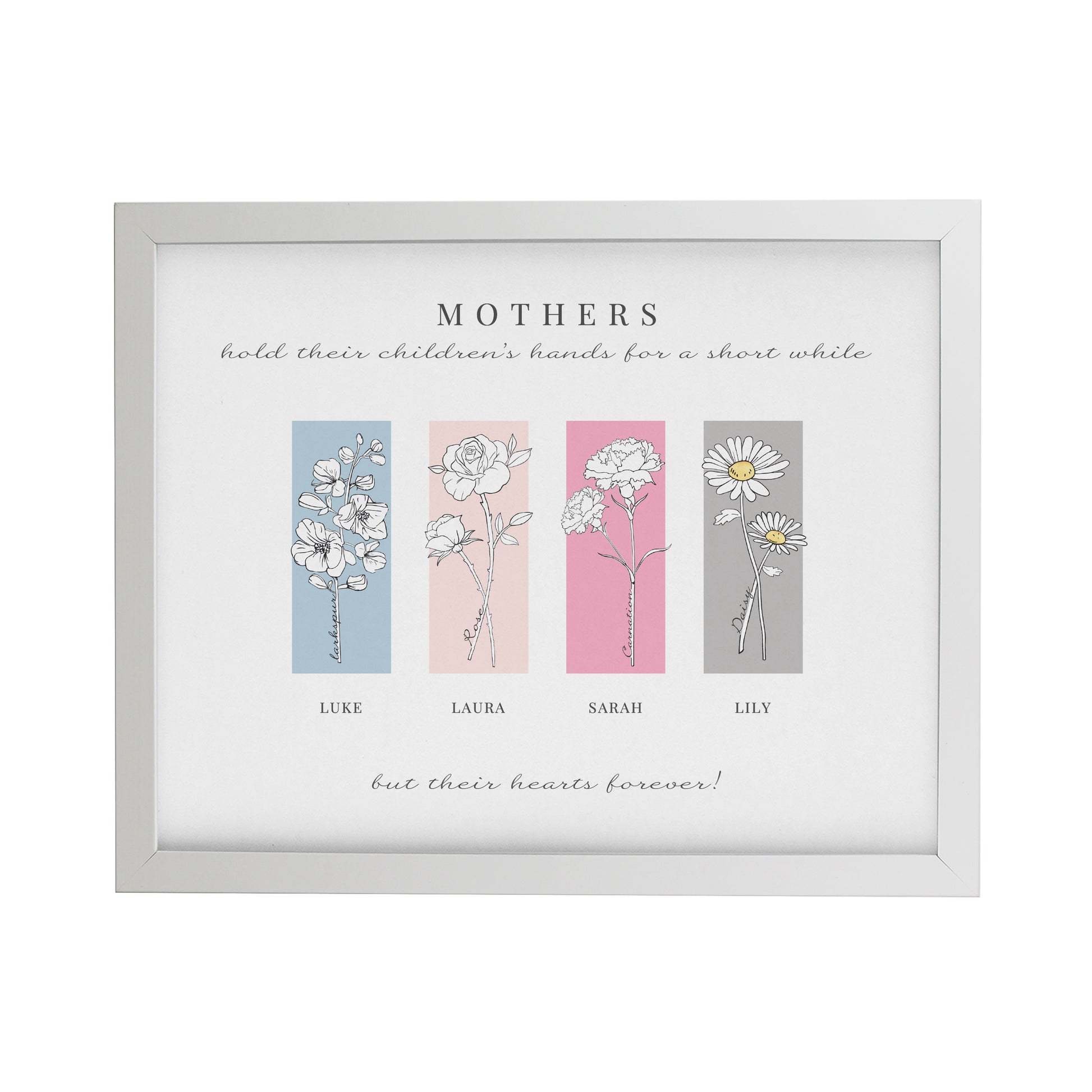 This unique framed print can be personalised with 2 message lines along the top, 4 flowers below, each with a name underneath and finally a message underneath of up to 50 characters.