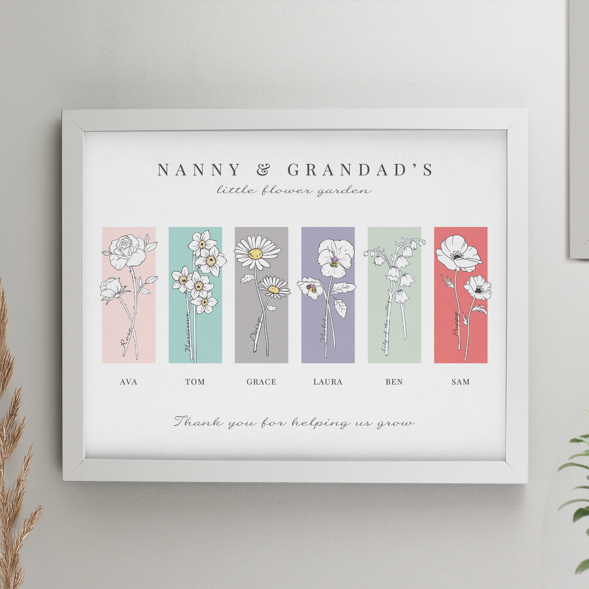 This unique framed print can be personalised with 2 message lines along the top, 6 flowers below, each with a name underneath and finally a message underneath of up to 50 characters.