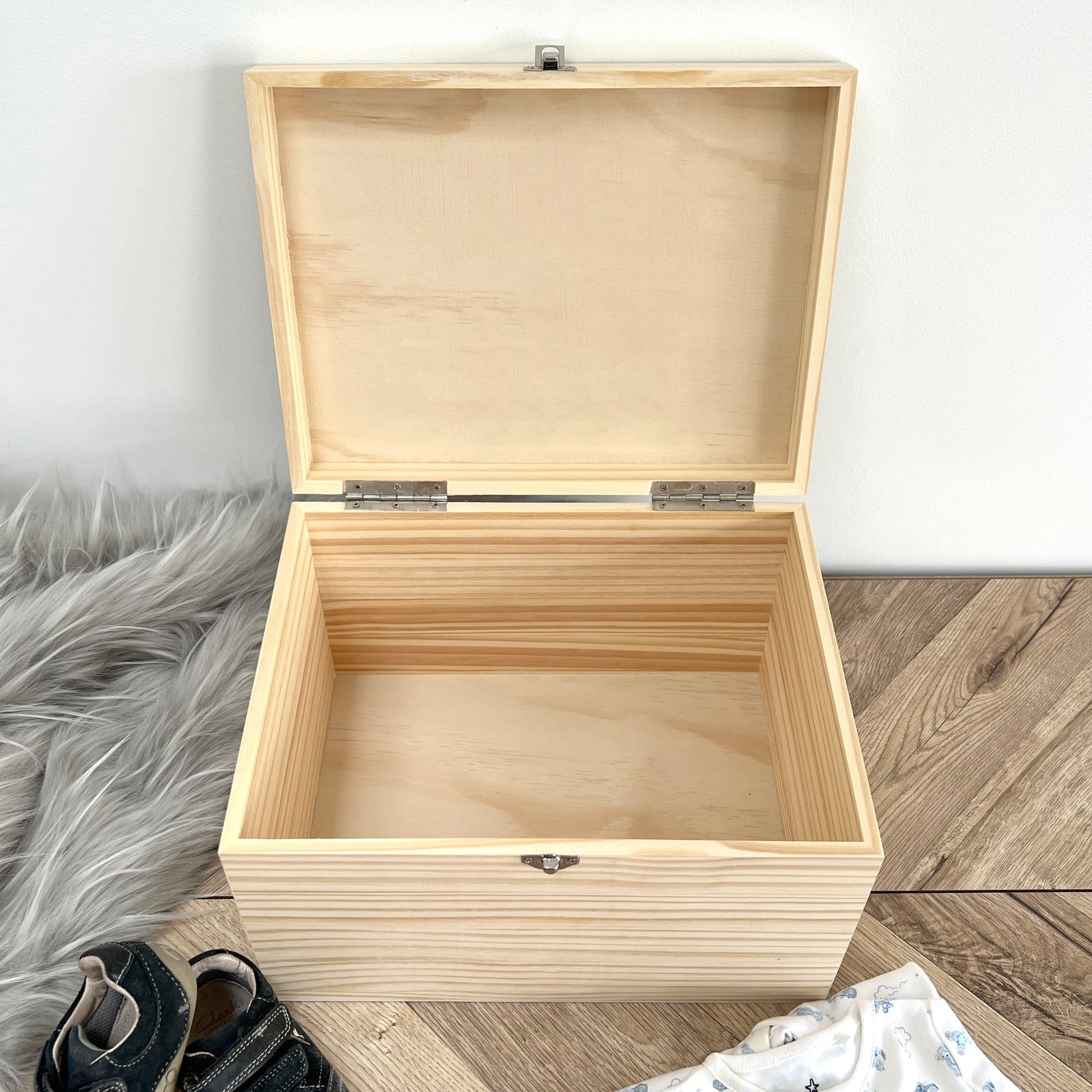 Choose from 5 sizes. It's a great gift for new parents. Made of natural pine wood with metal hinges and a silver clasp to keep things safe.