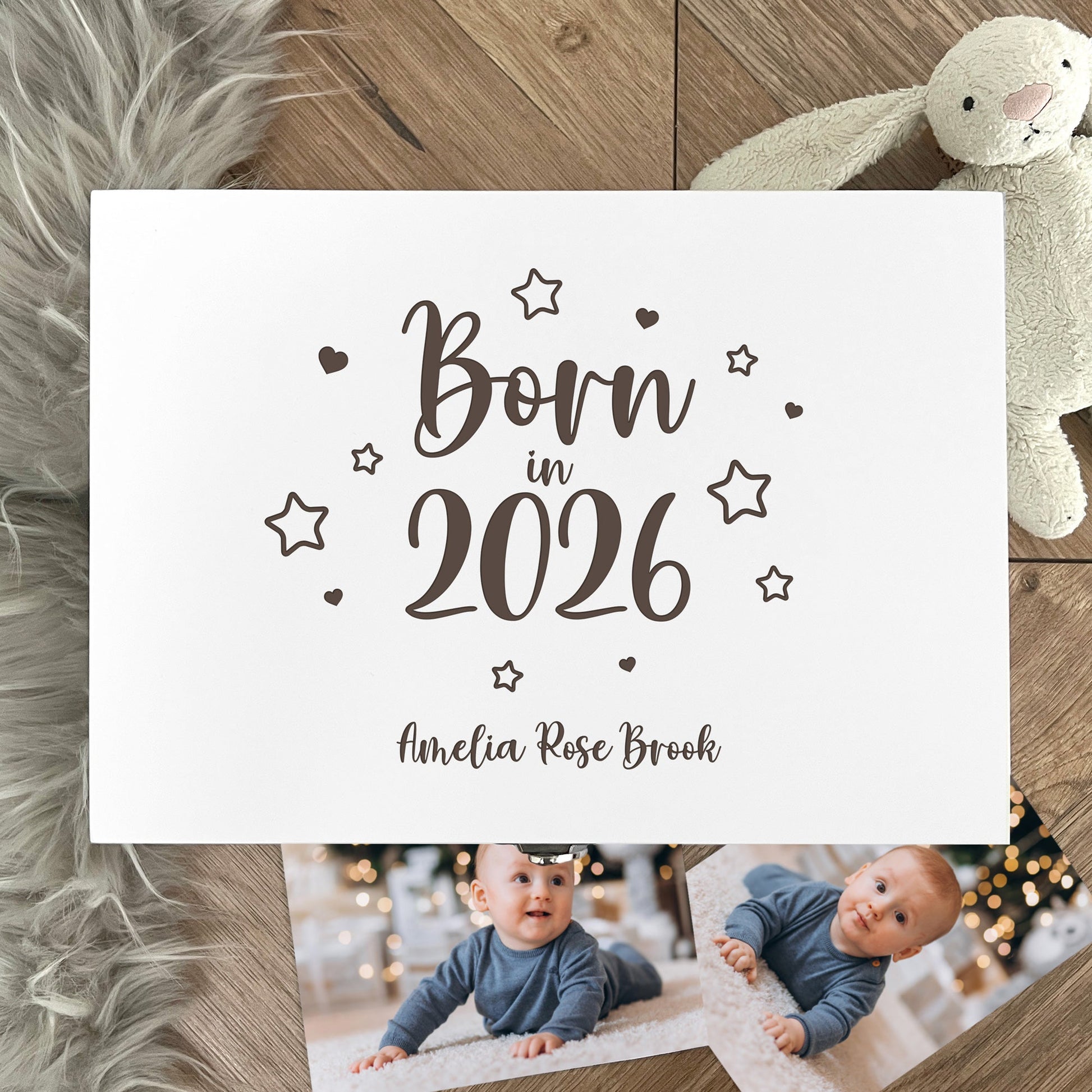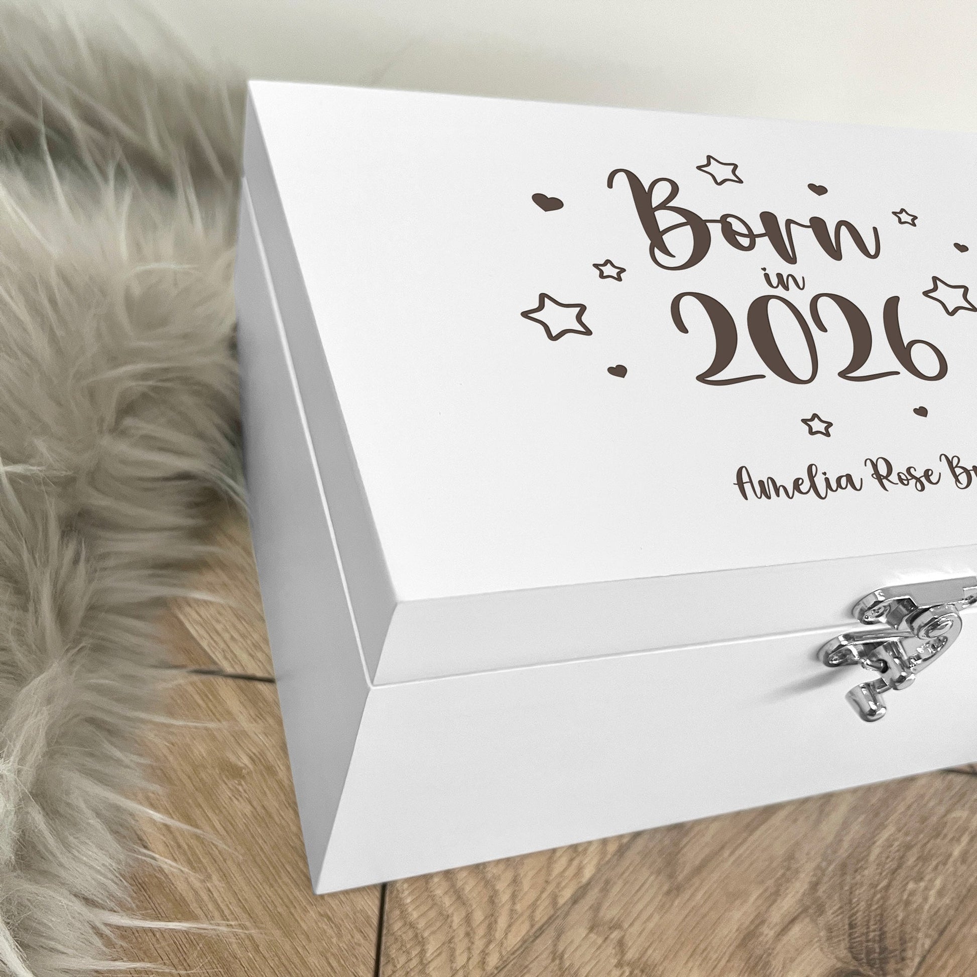 Celebrate a 2026 arrival with this charming white baby keepsake box, adorned with a delicate stars design and the wording "Born in 2026" professionally laser-engraved with your personal touch of a single line of text that you can customise.