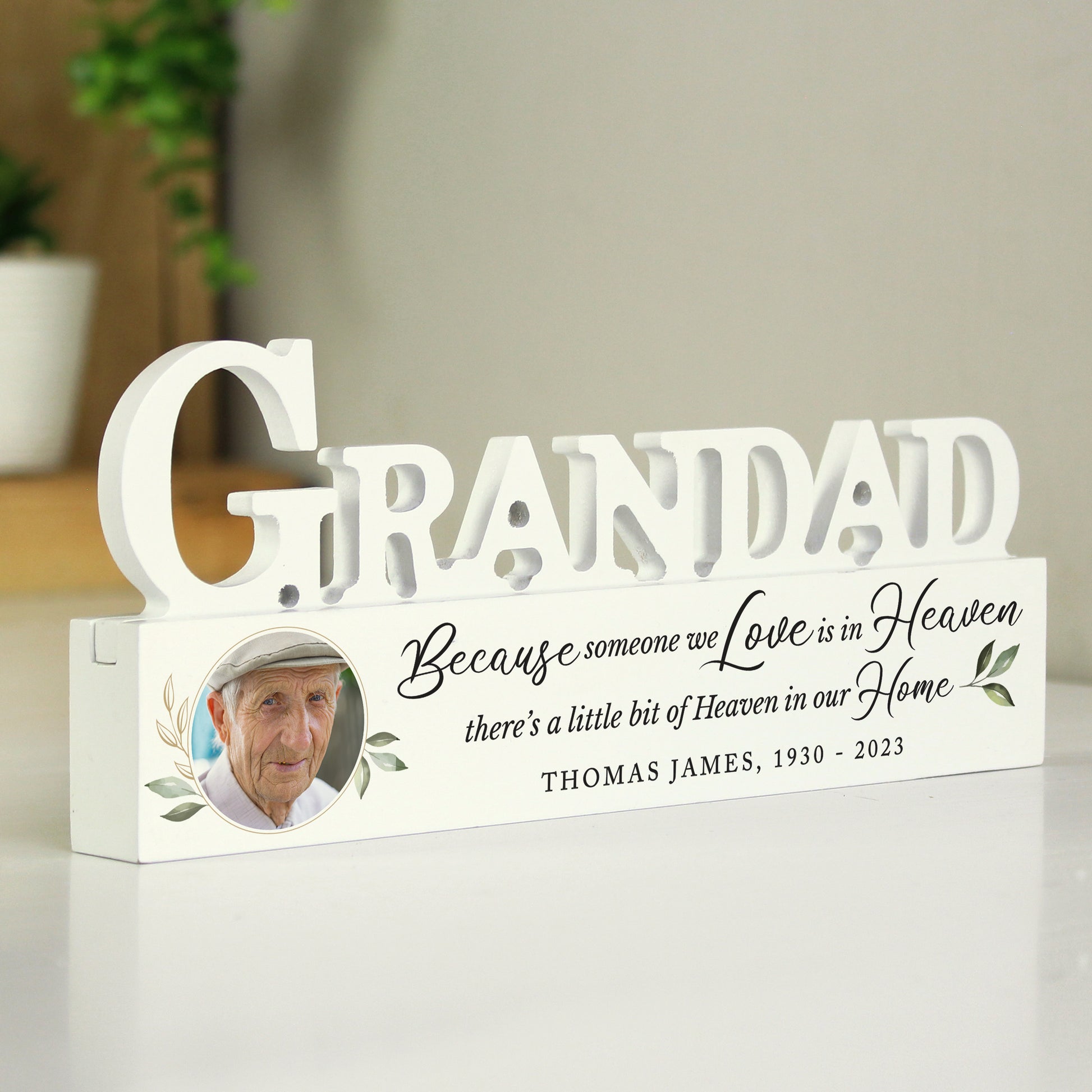 This Personalised Botanical Memorial Photo Upload Wooden Grandad Ornament is perfect for remembering a loved one.