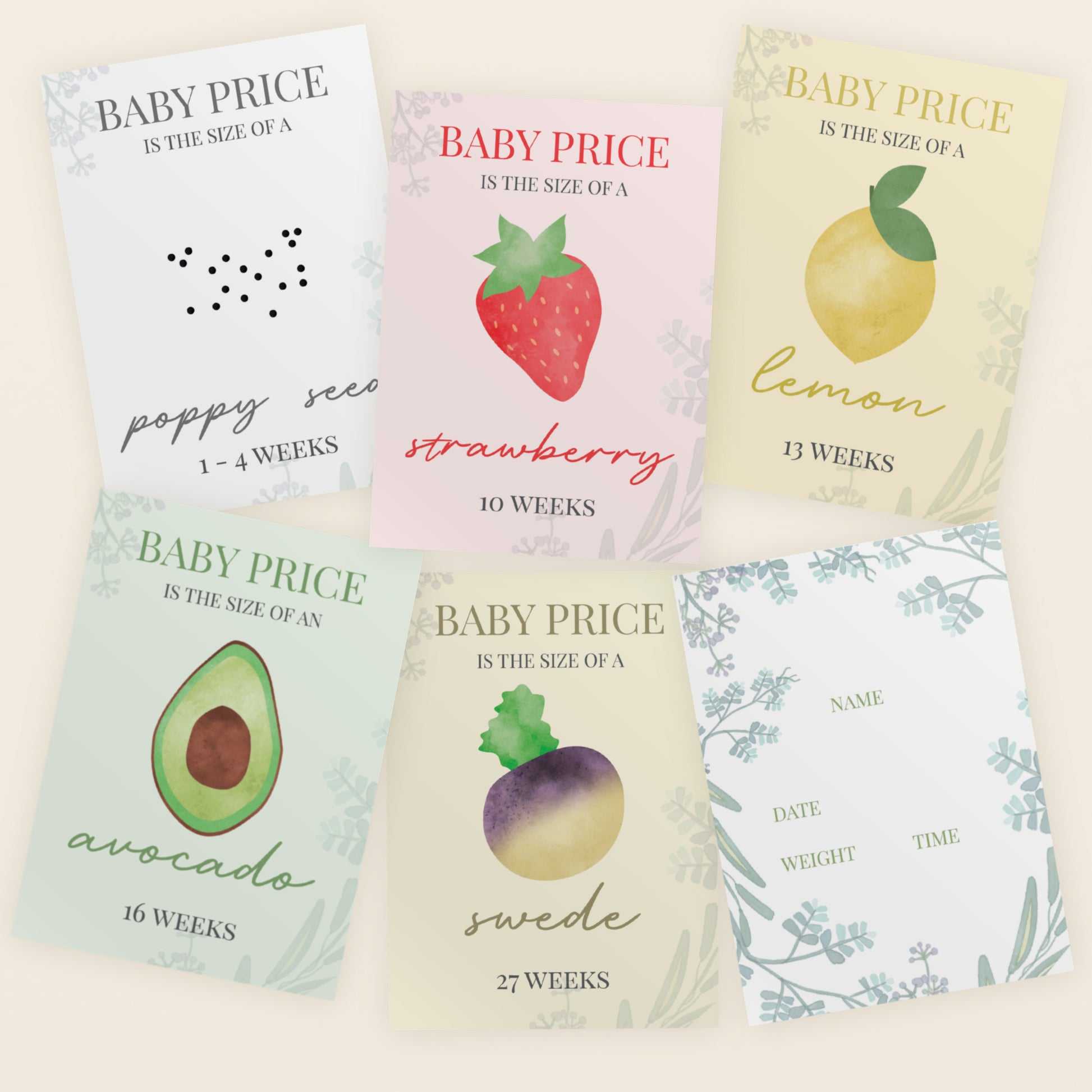 They make a lovely gift for an expecting mum. Each card features a fruit or vegetable design to show how big you baby is at which stage.