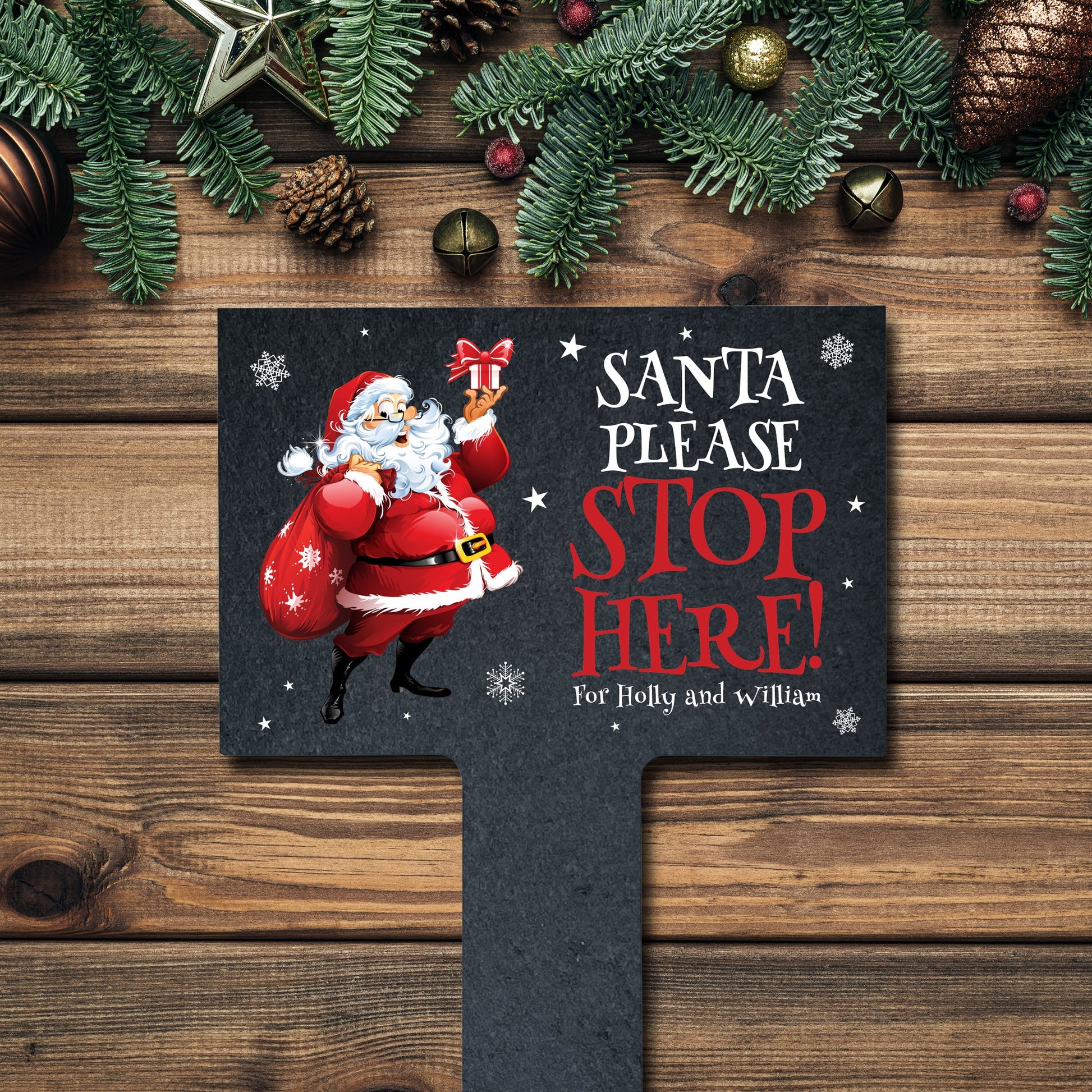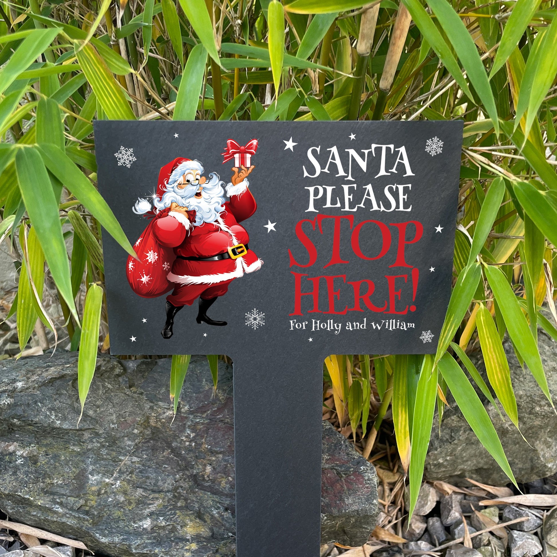Make your festive decorations last for years with this personalised "Santa Please Stop Here" sign! This lovely slate Christmas keepsake is perfect for displaying outside your home and, unlike traditional wooden signs, it won't rot over time.