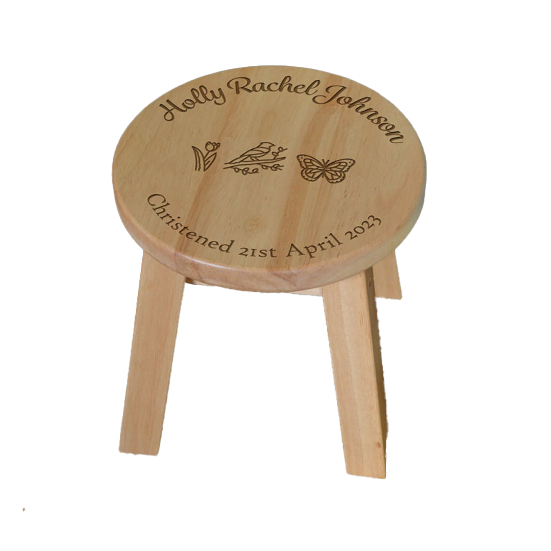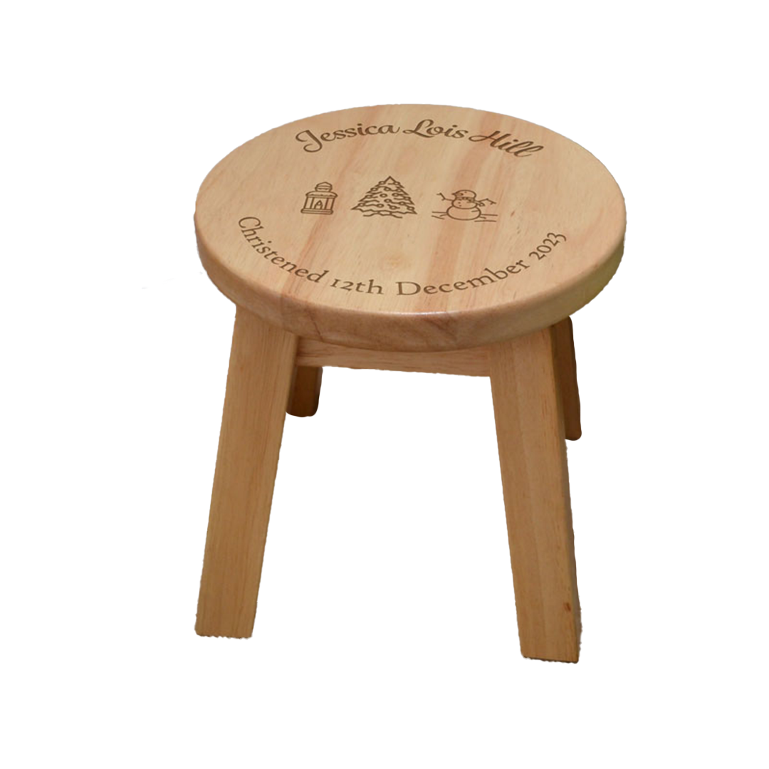 The stools feature an engraved design on the top which can be personalised with the baby’s name and either their date of birth or the date of their christening.