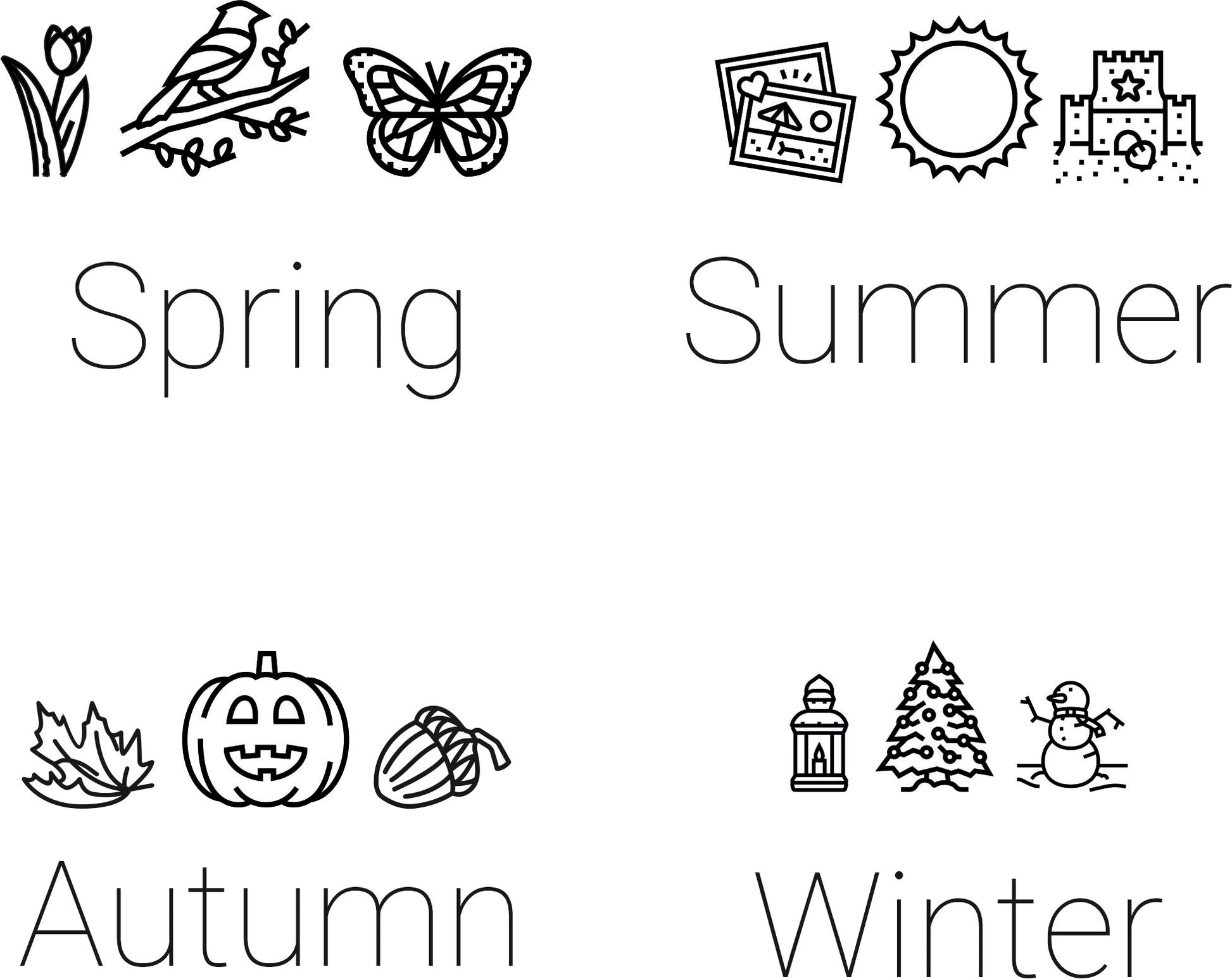 The four season designs each feature 3 icons to represent the time of year. Spring includes a tulip, a bird and a butterfly. Summer features a postcard, a sun and a sandcastle. Autumn has a Halloween pumpkin a falling leaf and an acorn. Winter features a candle in a lantern, a Christmas tree and a snowman.