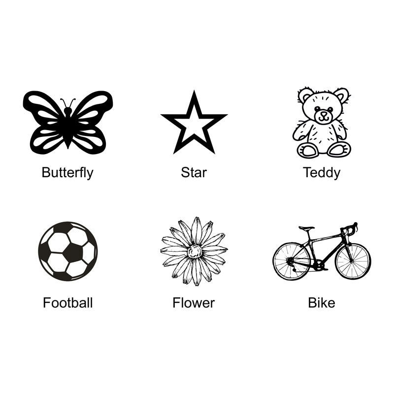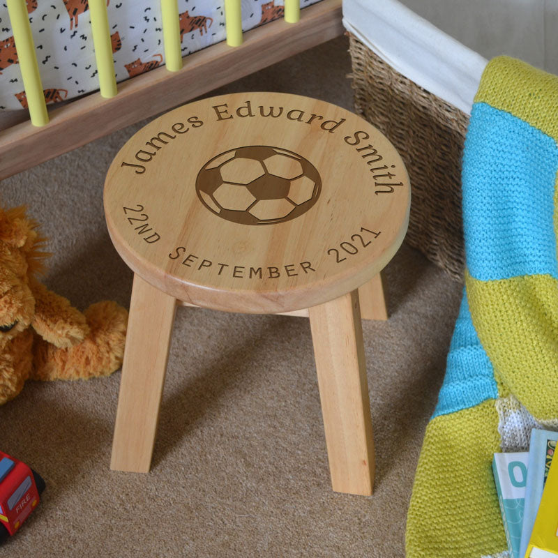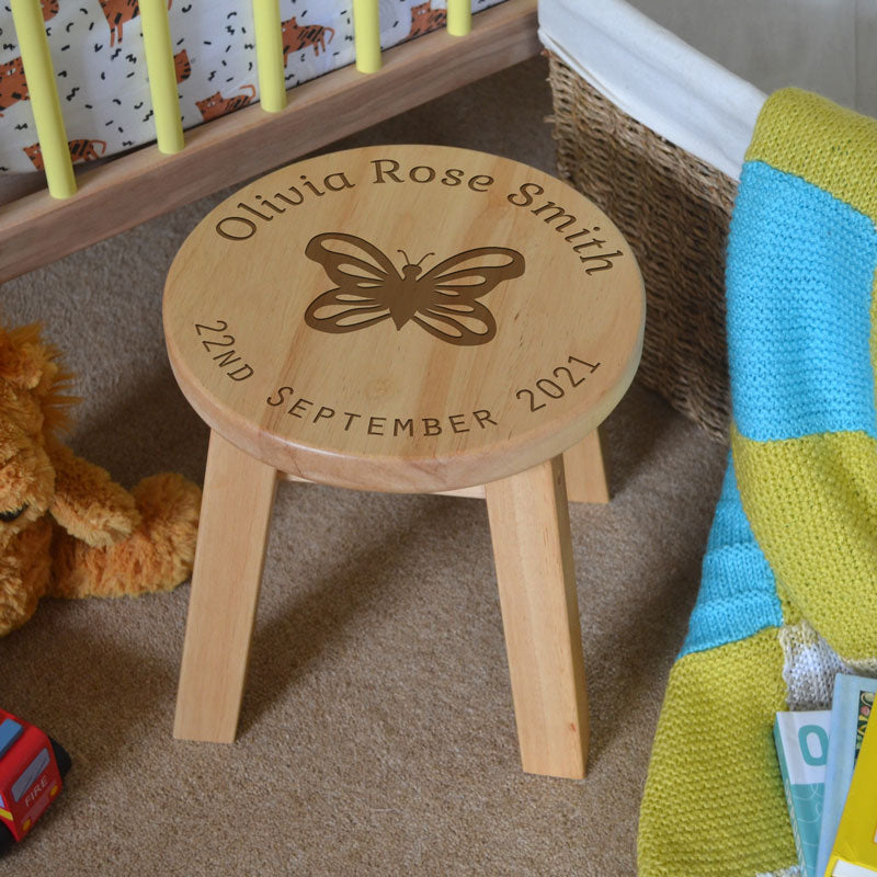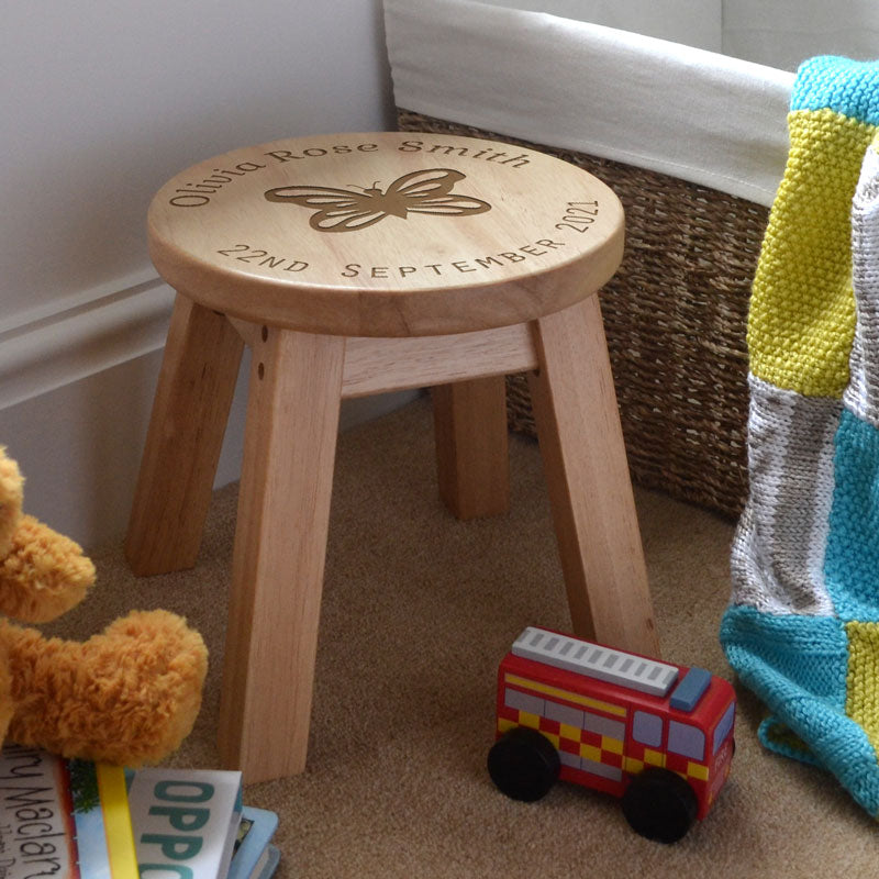 The round seat of the stool is engraved with a name and date of your choice, and one of six designs. Choose from a butterfly, star, football, flower, bicycle or teddy stool picture.