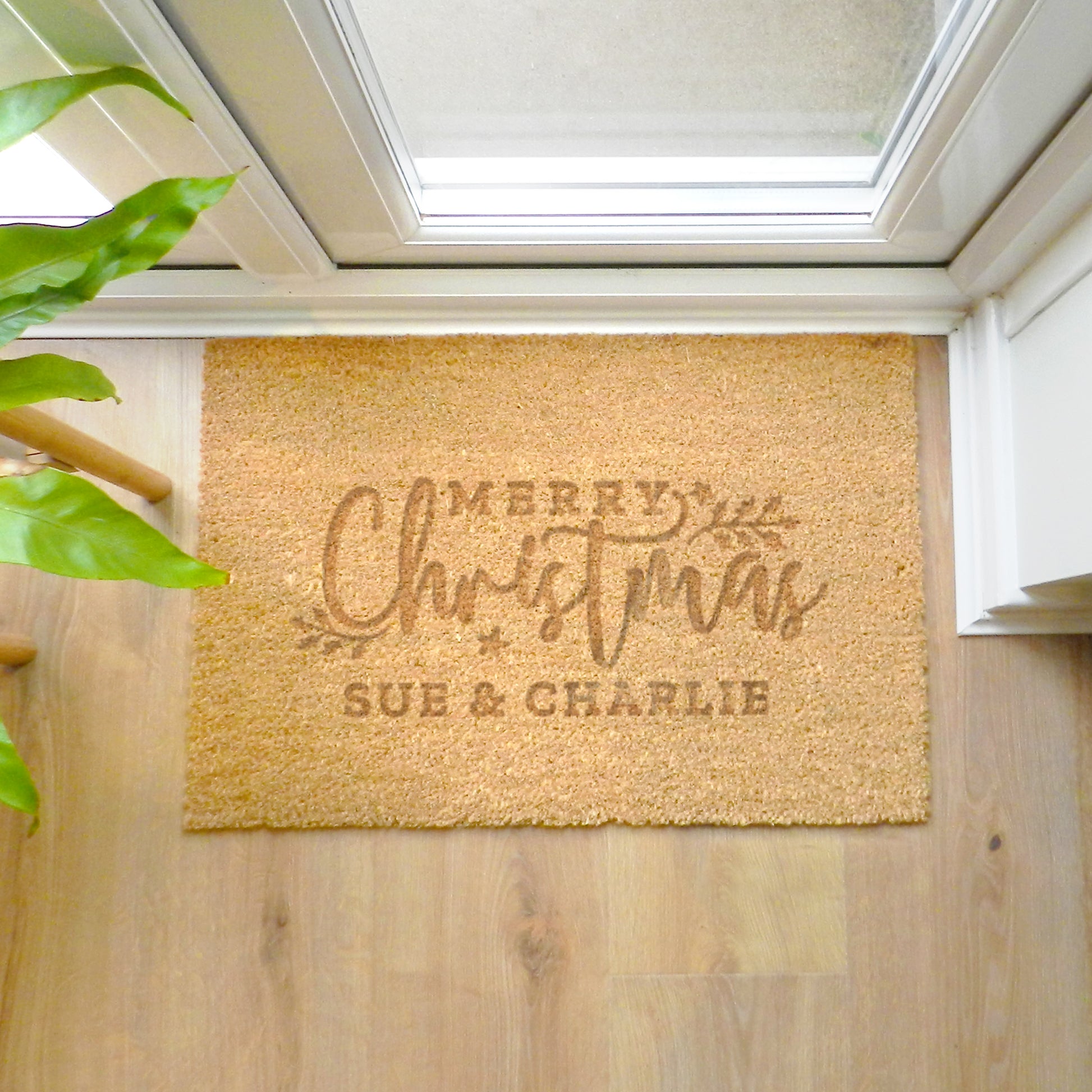 This coir, non-slip rectangle door mat can be personalised below the fixed text 'Merry Christmas' with one line of text containing up to 20 characters.