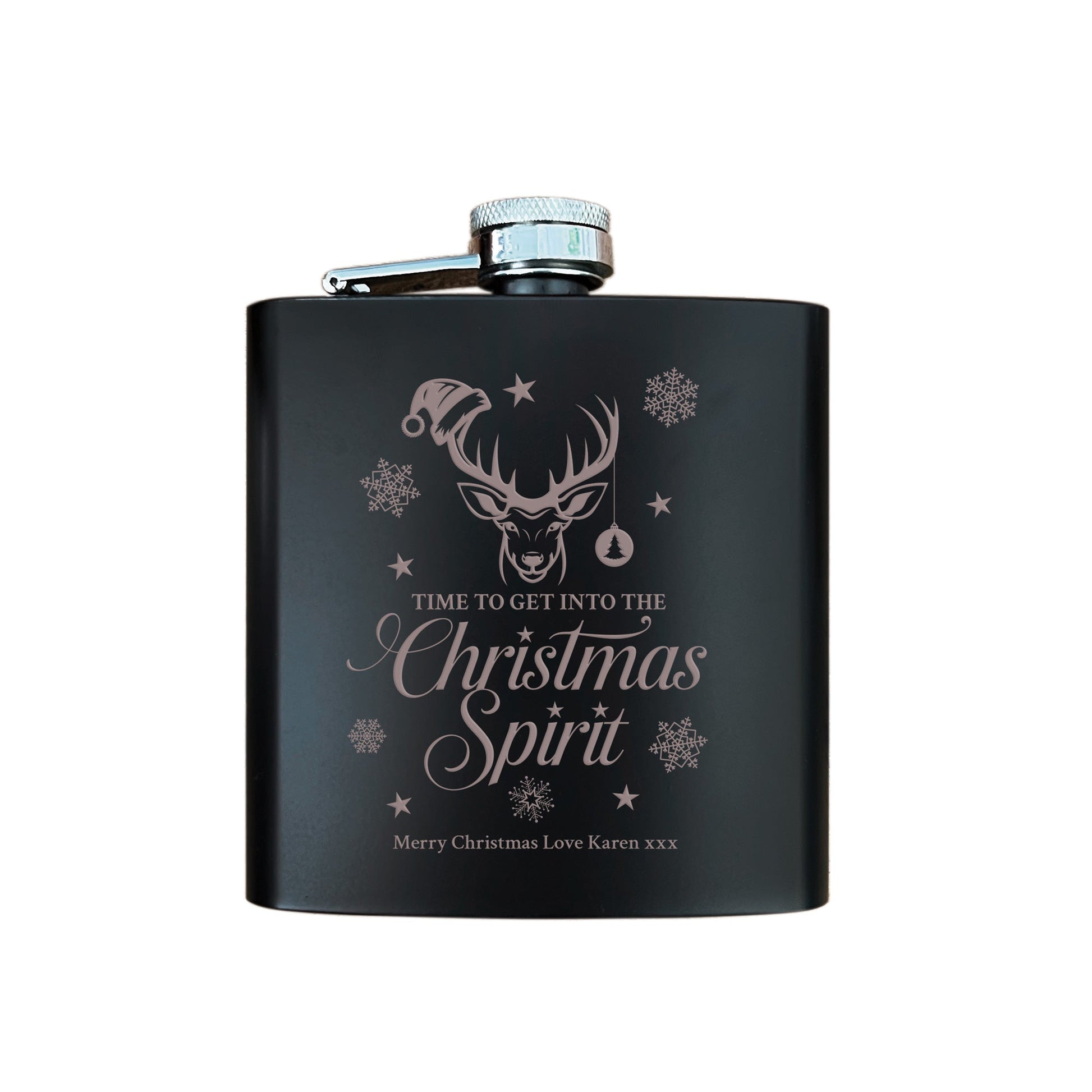 Personalised Christmas Stag Engraved Black Metal Hip Flask 6oz