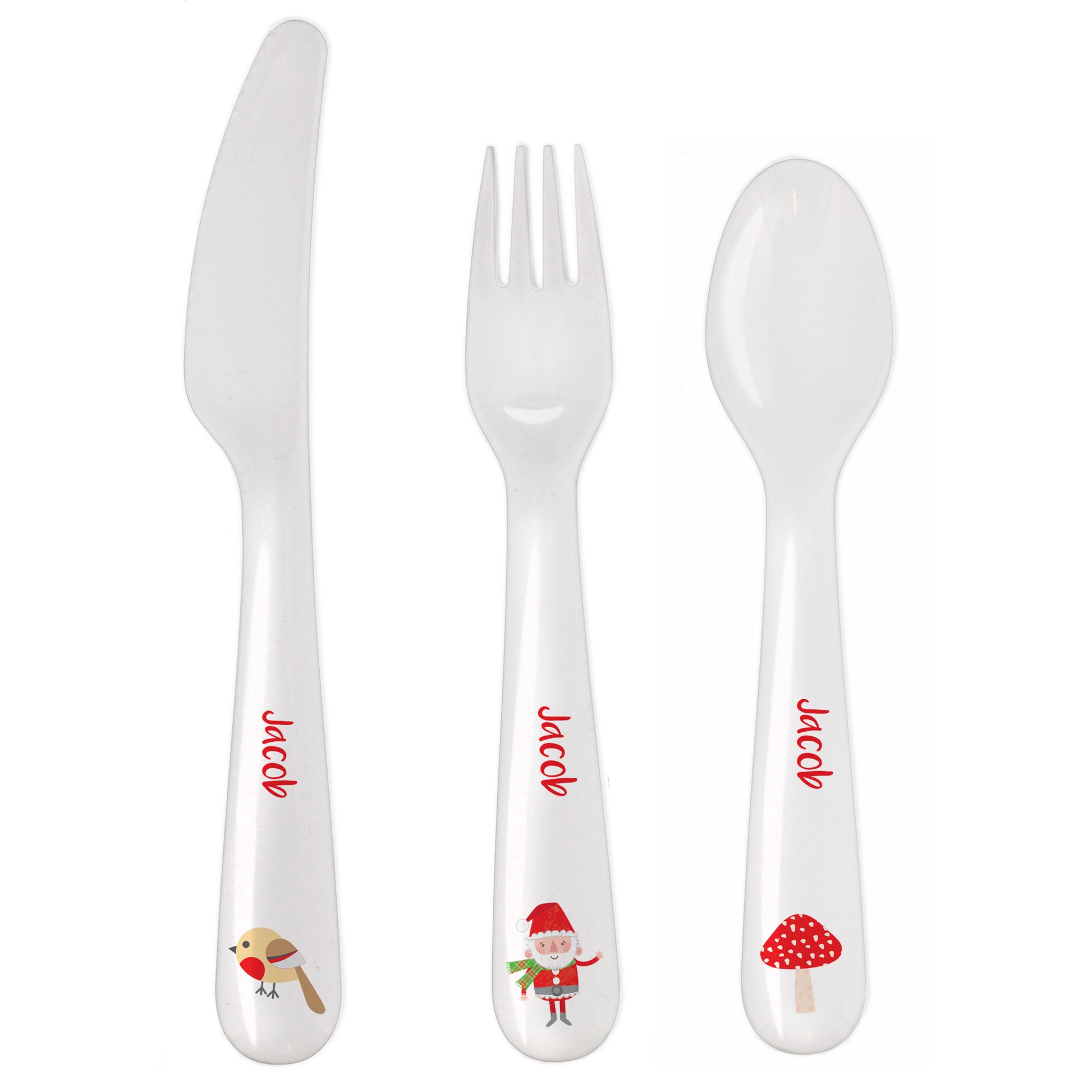 Personalised Christmas Toadstool Santa 3 Piece Plastic Cutlery Set