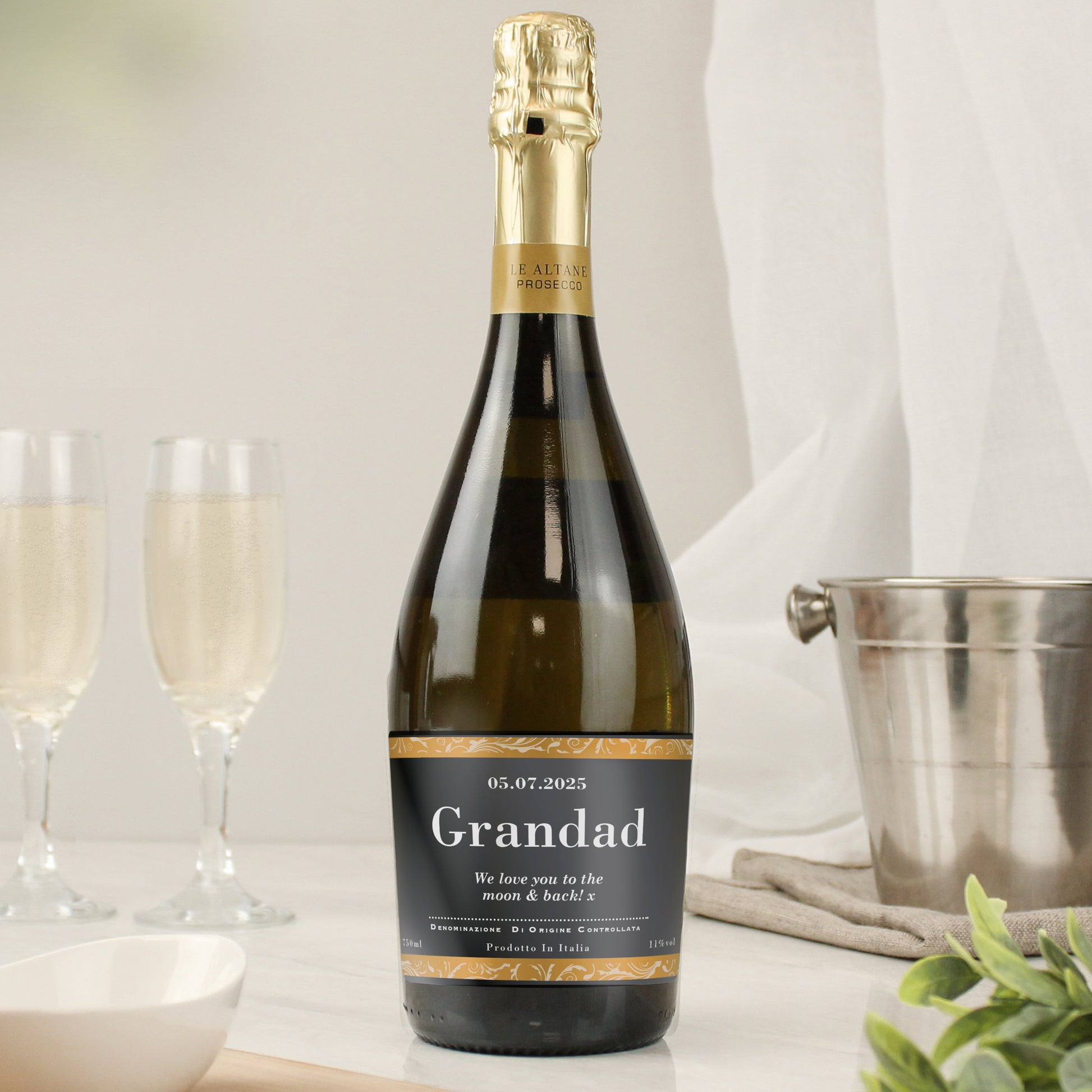 Each personalised bottle contains premium Prosecco imported from Italy. With a crisp taste and delicate bouquet, the bubbles release hints of peach and apple followed by notes of acacia and wisteria creating a fresh and light feel on the palate.