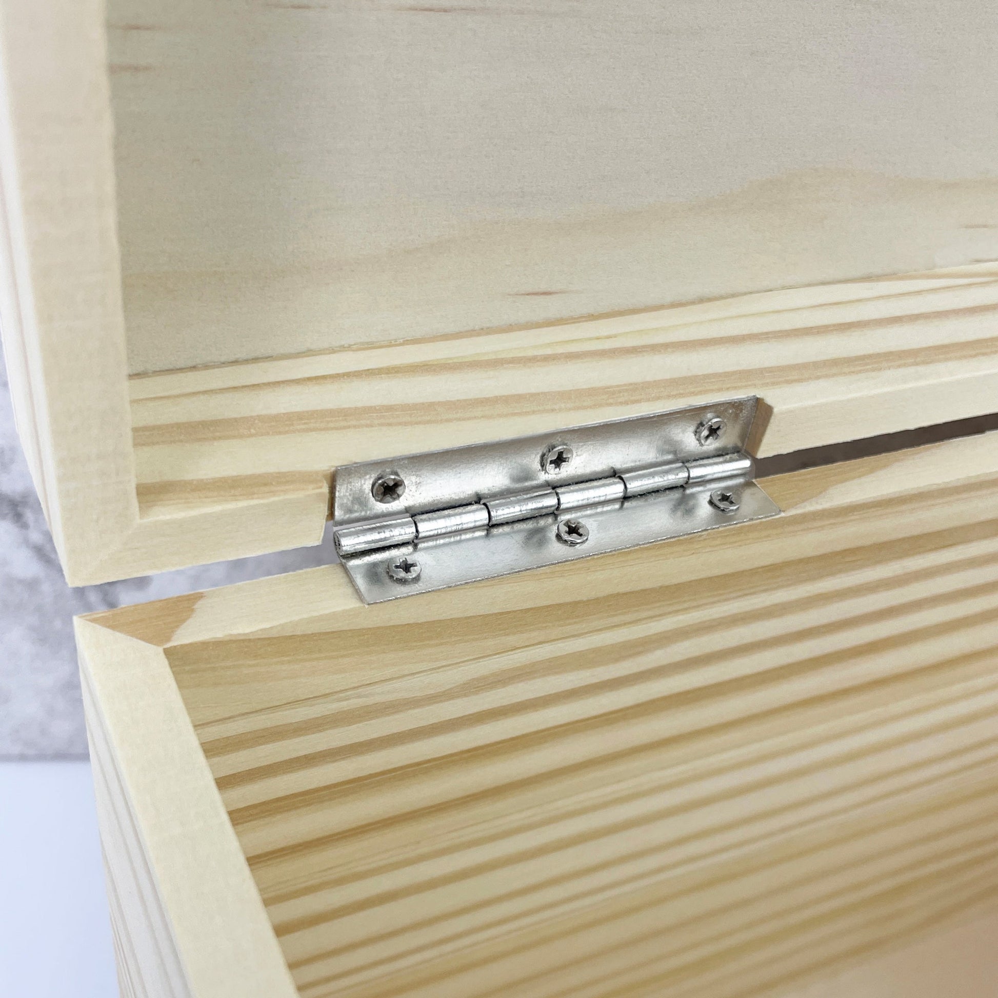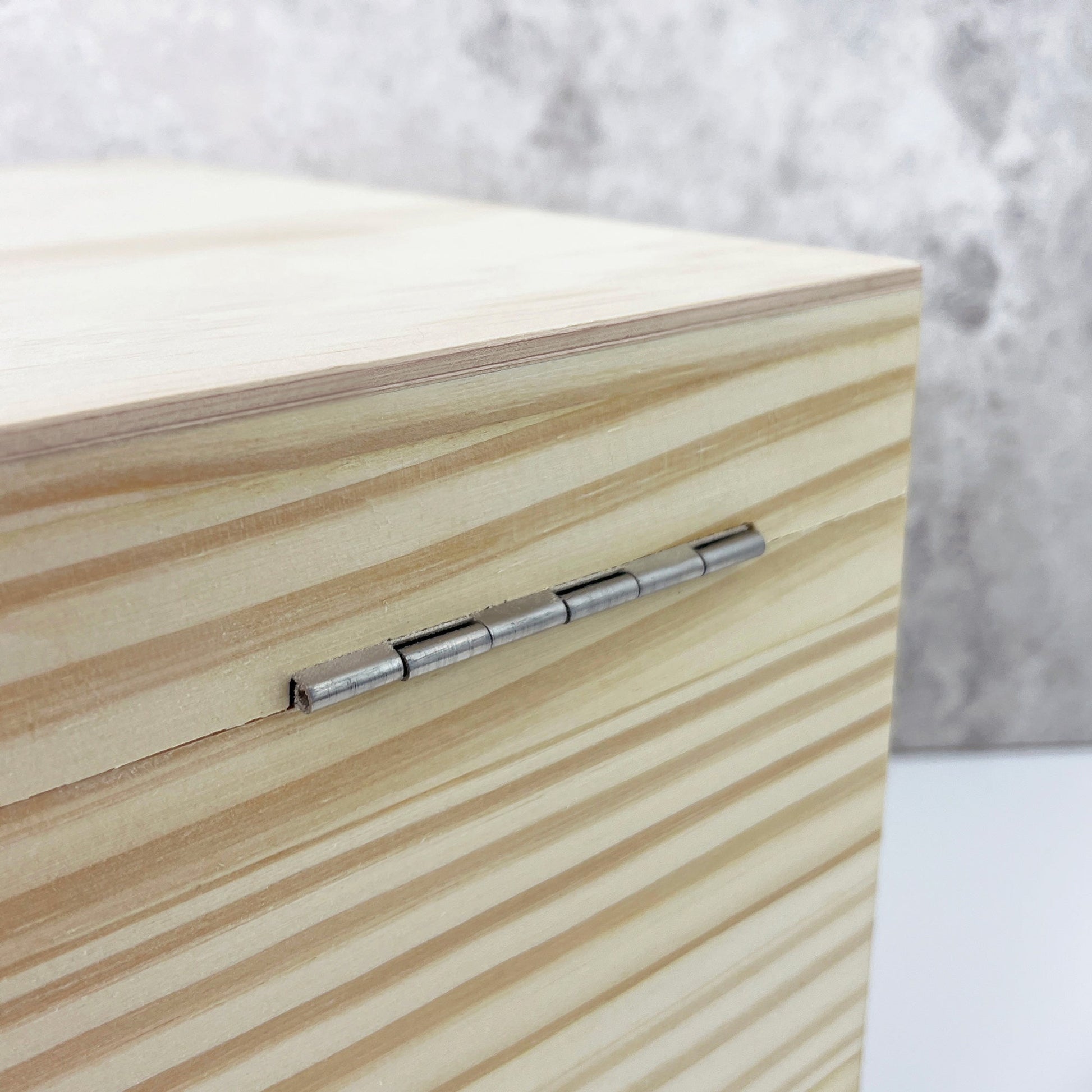 The box is made of natural pine wood and may have slight differences. It has metal hinges and a metal clasp to keep things safe.