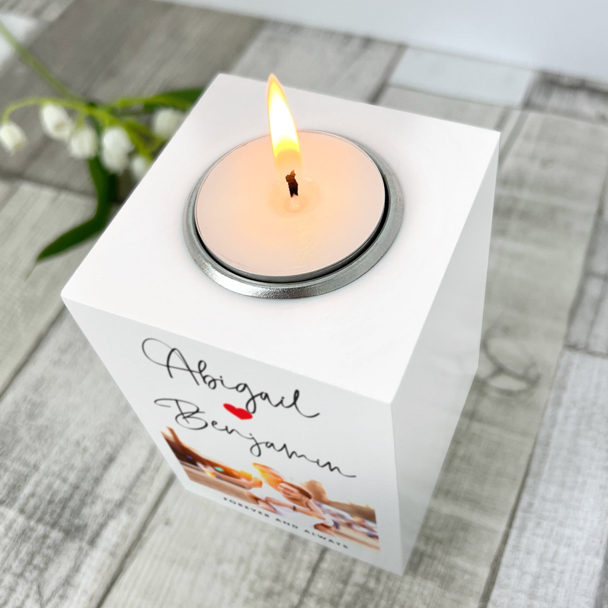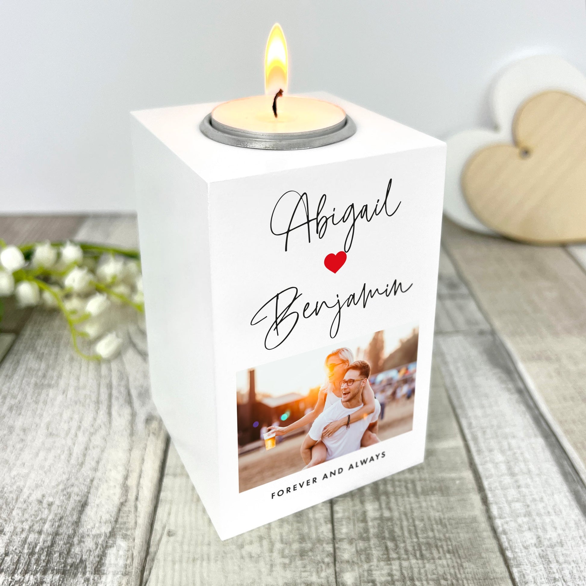 This personalised wooden candle holder is a lovely present for a couple or your partner. It can be personalised with your favourite photo, two names separated by a small red heart, and a message.