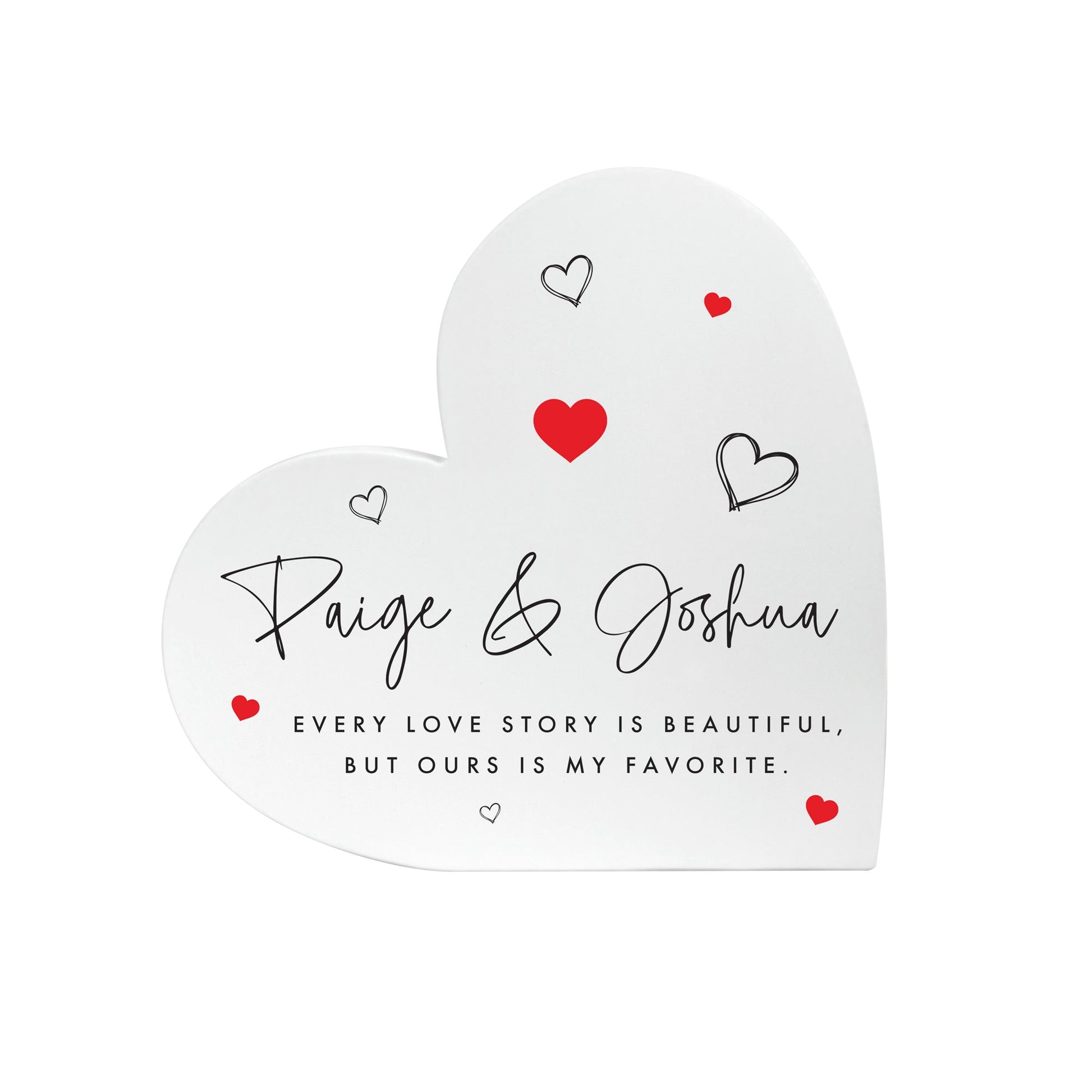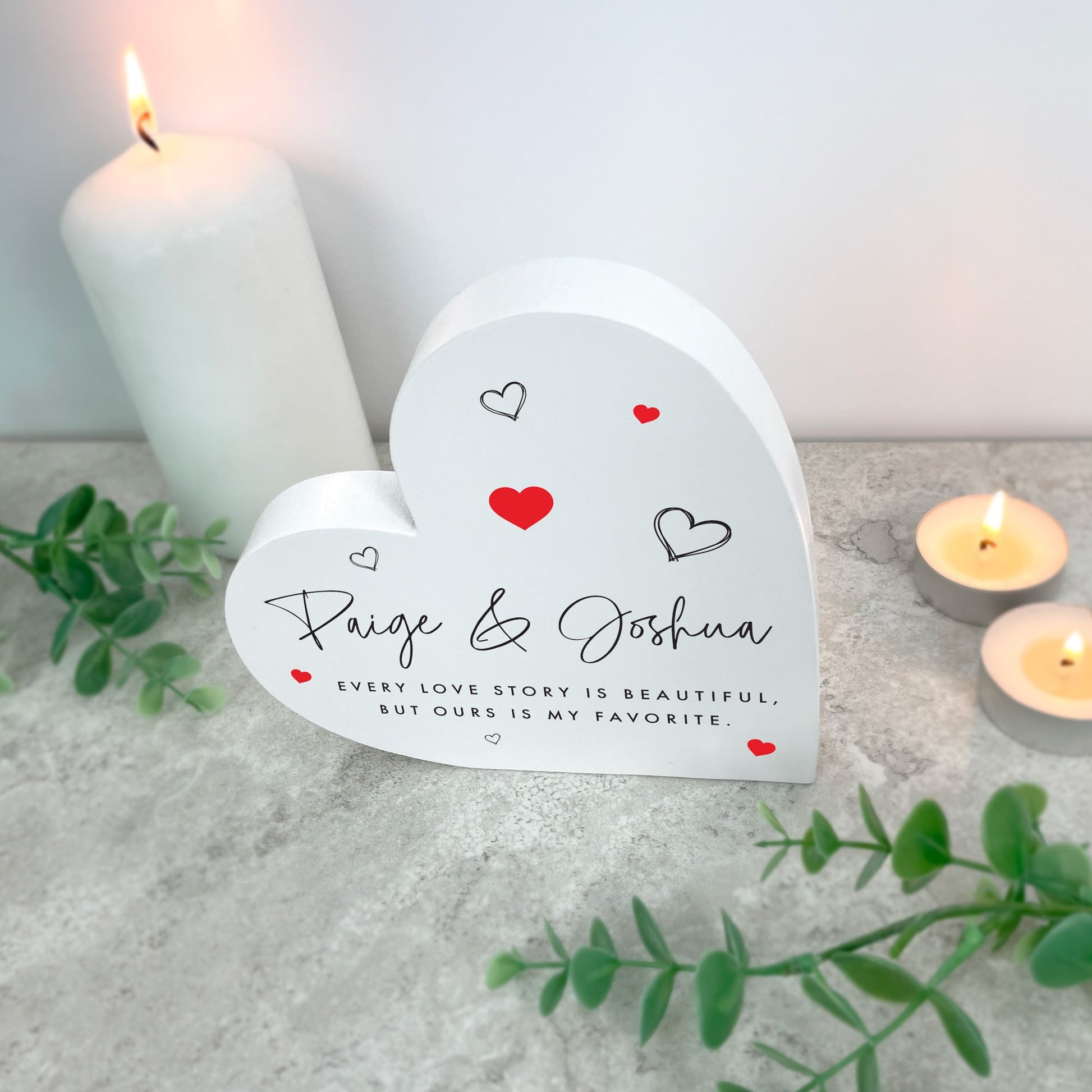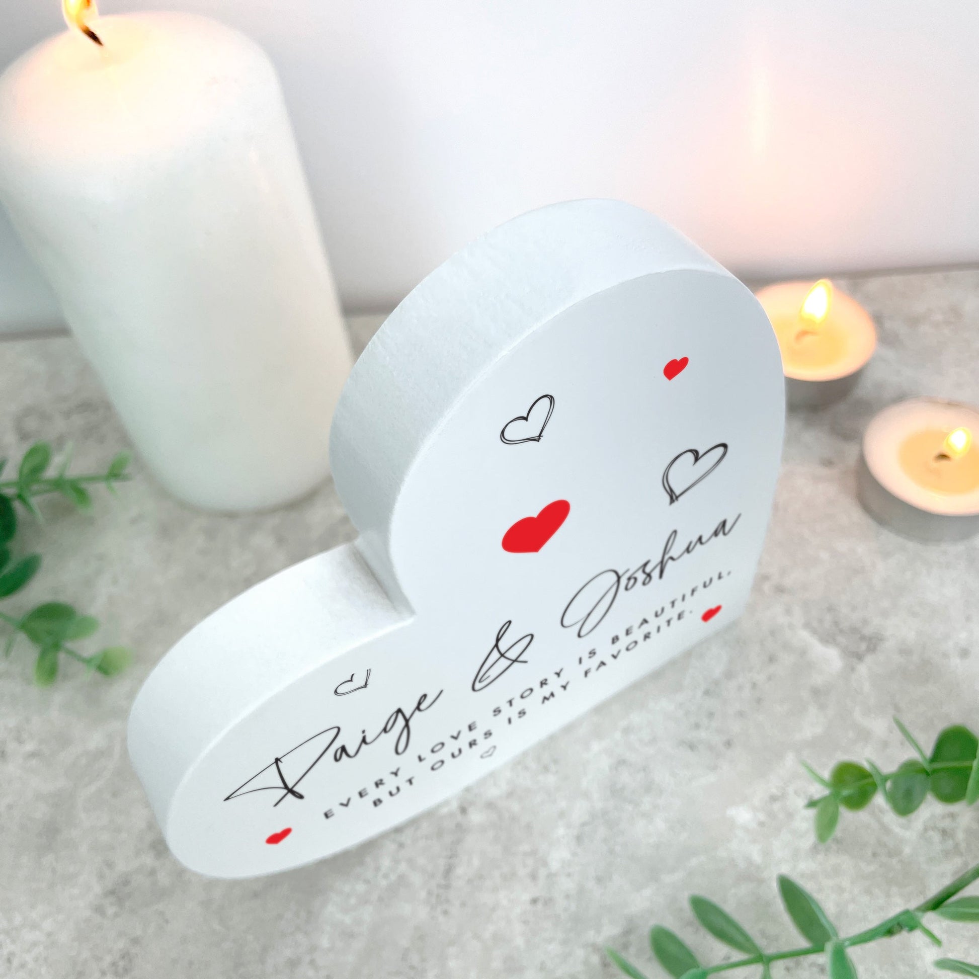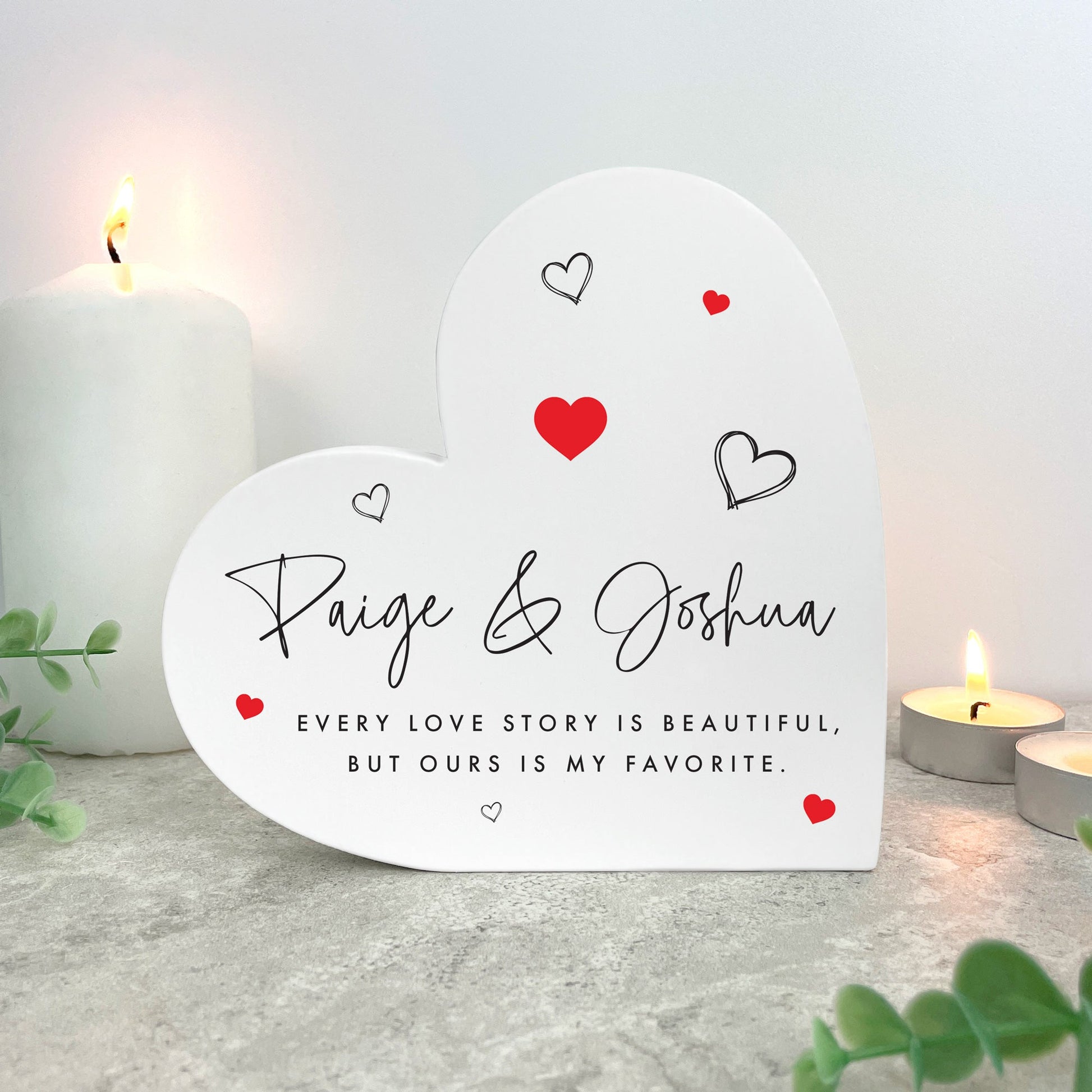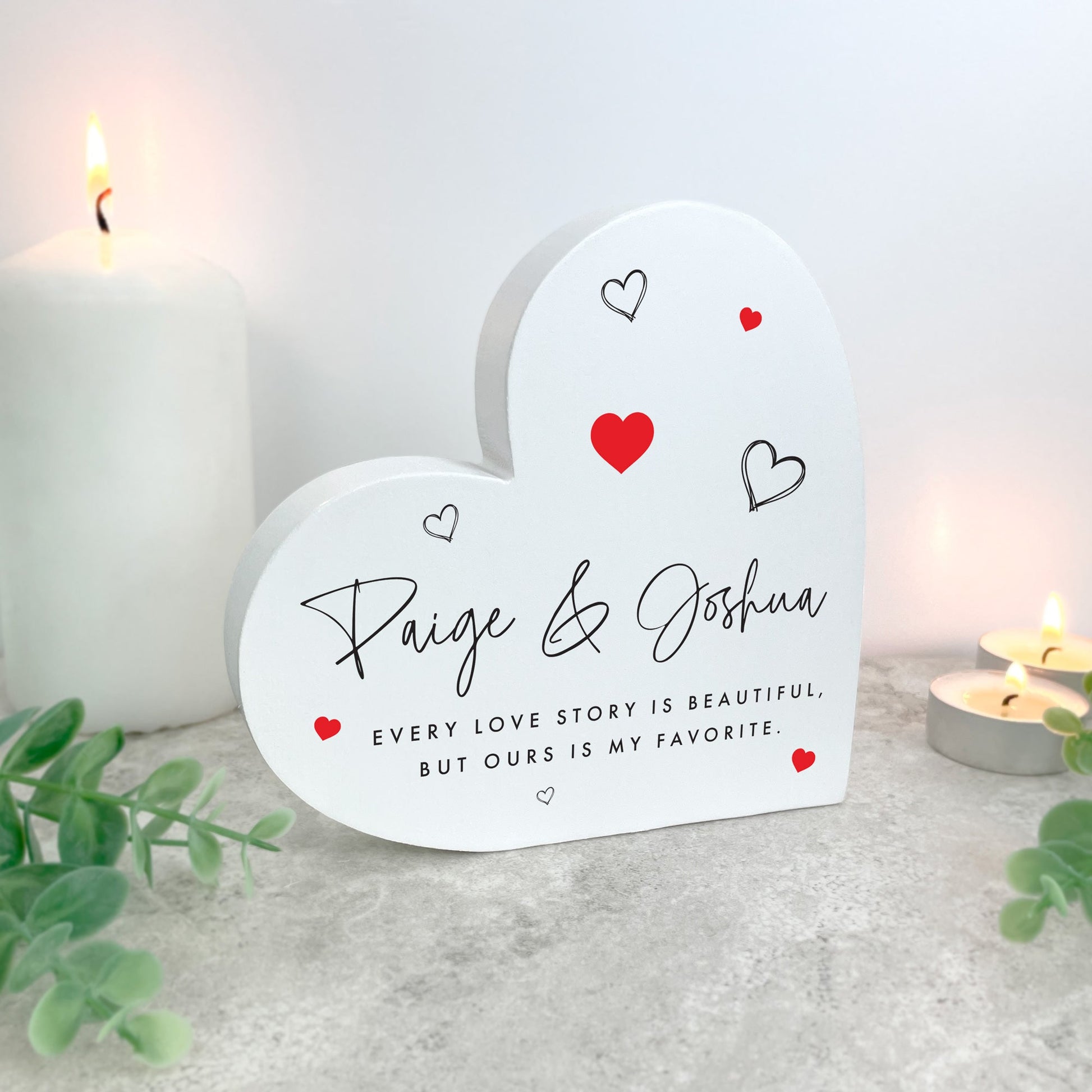 This solid pine wooden heart is a lovely gift for any couple or your partner. It's smoothly painted white and can be personalised with two names and two lines of a special message. Red hearts and sketchy heart designs add a loving touch to this keepsake.