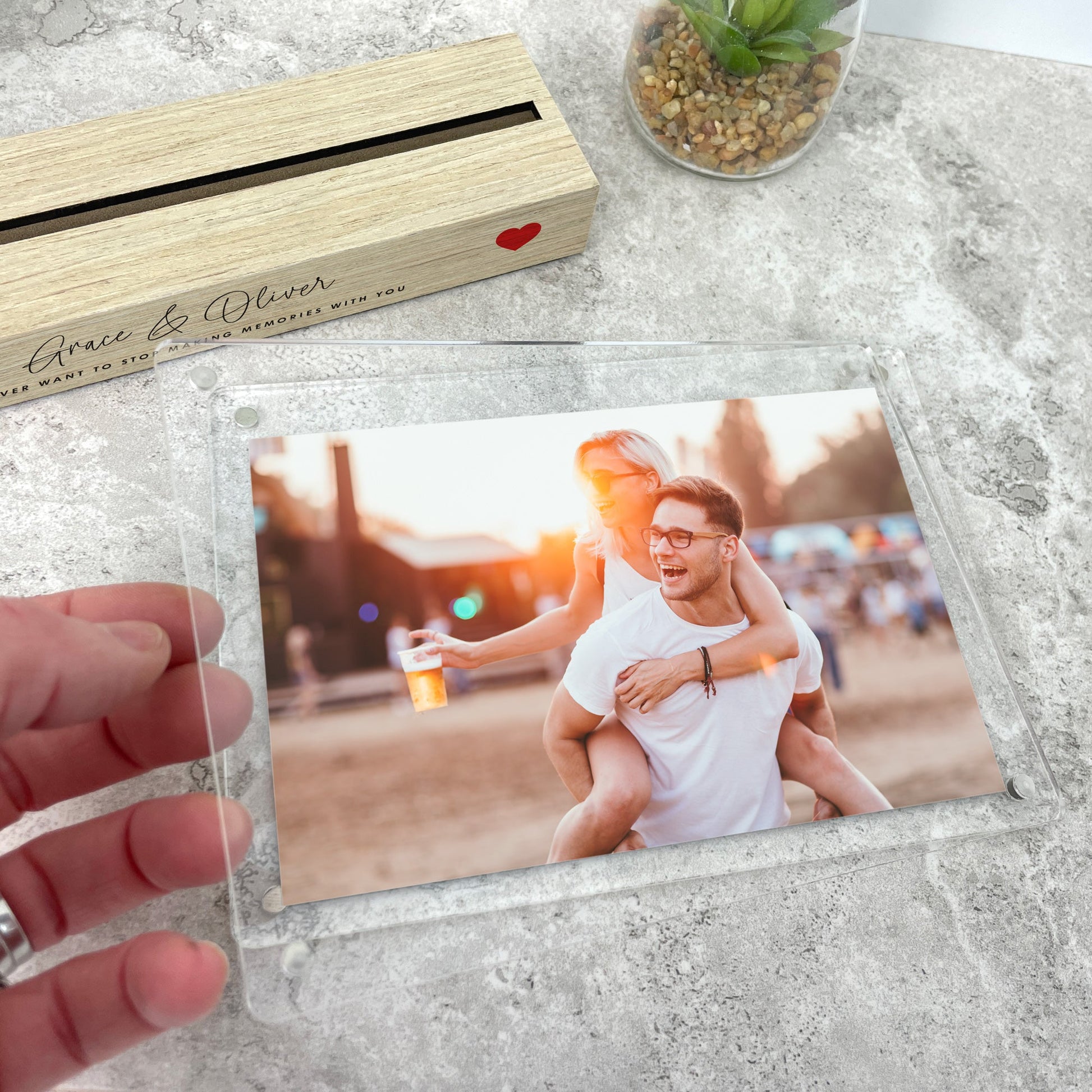 Easily insert a cherished photograph into the detachable acrylic photo holder. The magnetic acrylic panel simply lifts from the base, making it easy to place your chosen photograph inside.