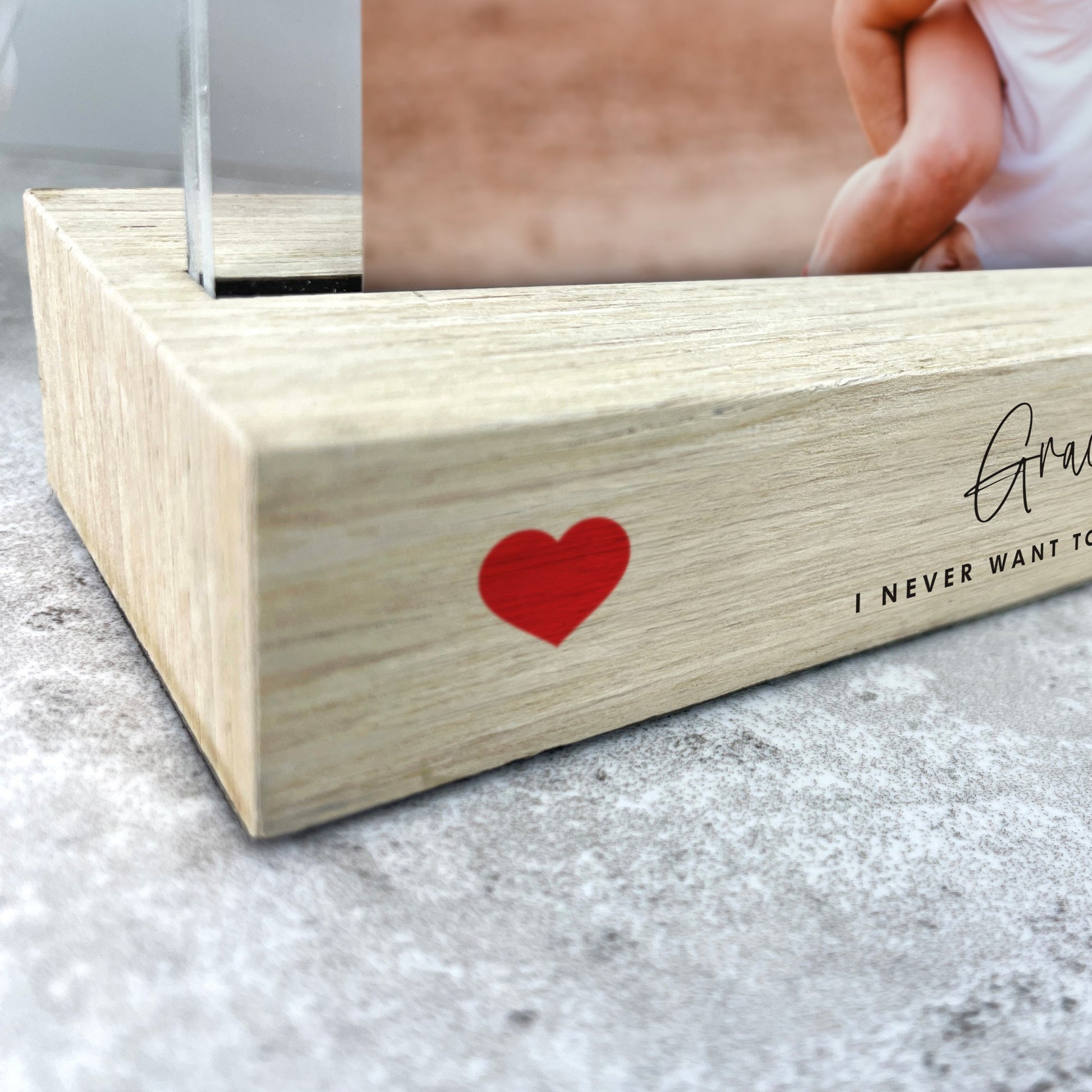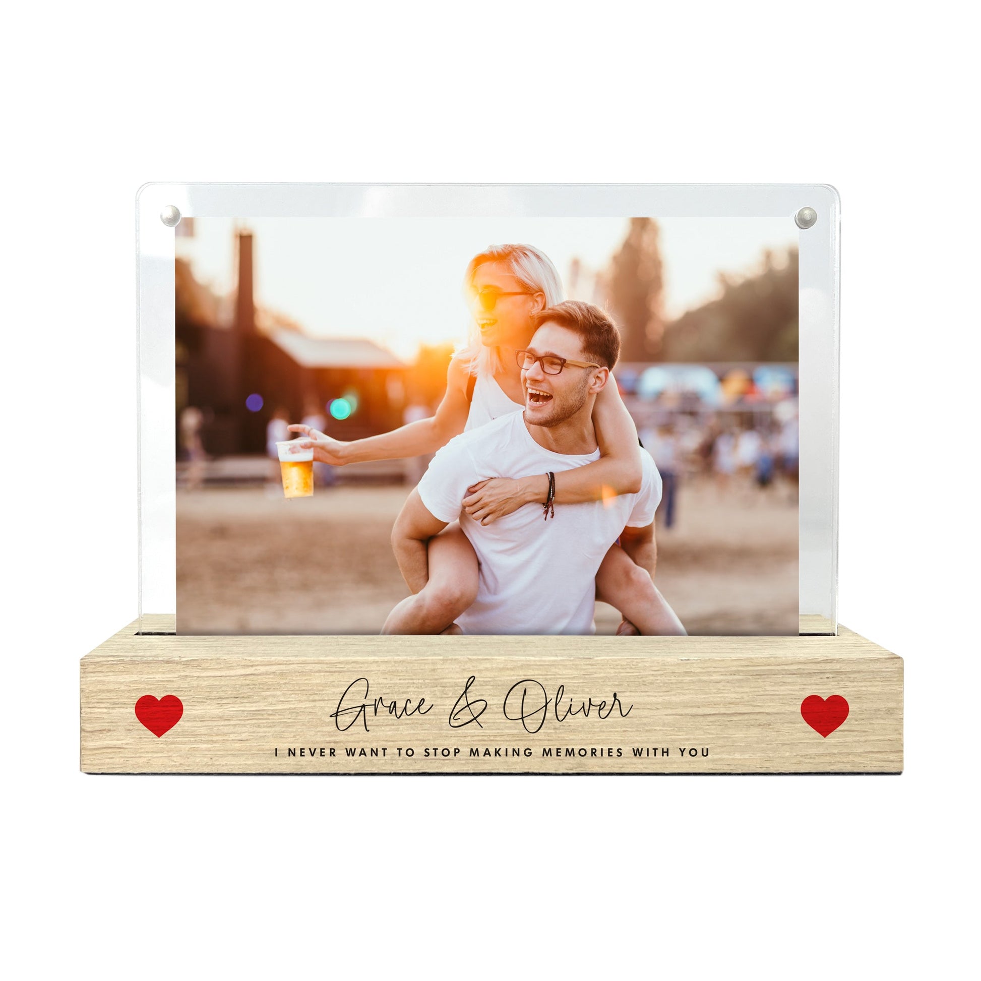 This personalised wooden photo frame is a lovely present for a couple or your partner on Valentine's Day. It's also a great wedding day or anniversary gift. Personalise it with two names and a message underneath. The red love hearts are always included.