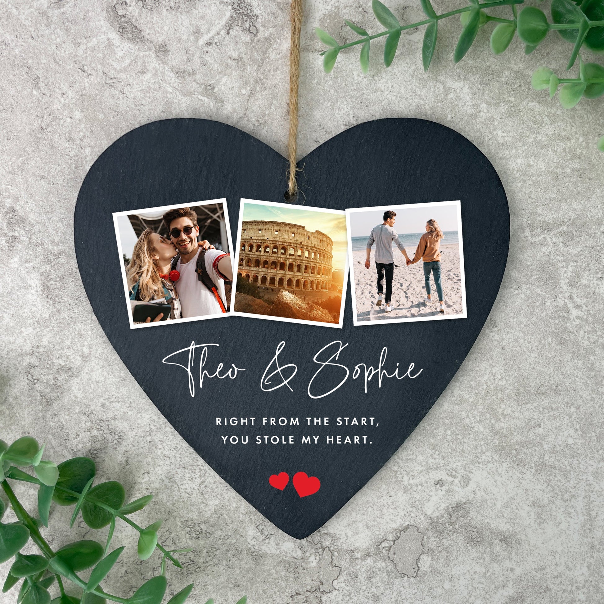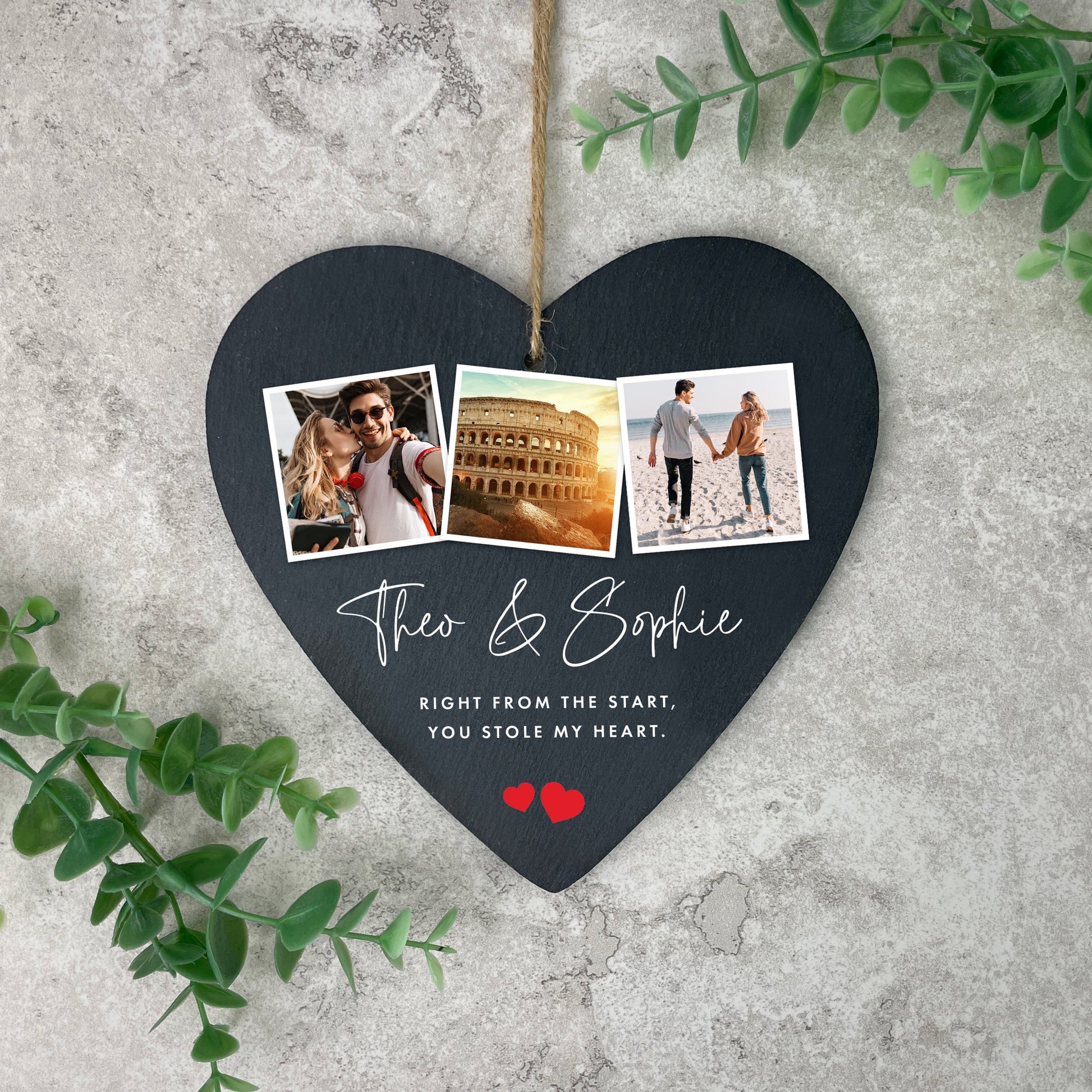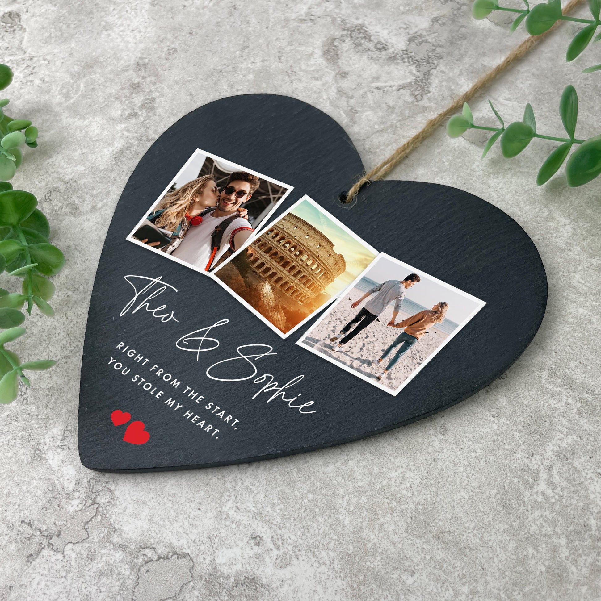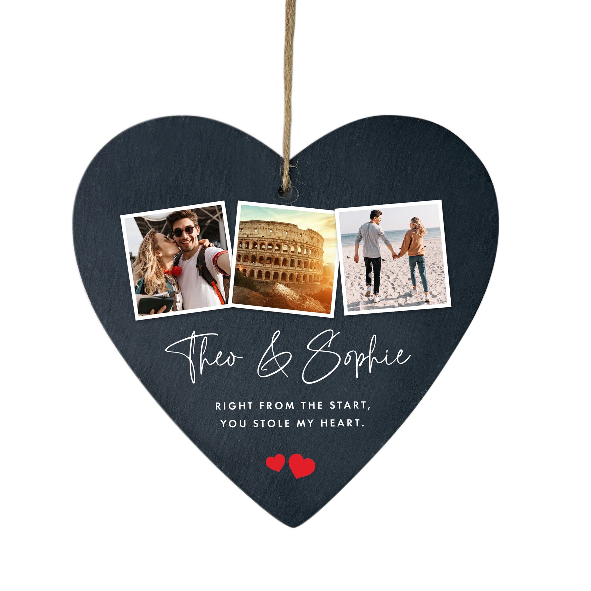 This slate heart hanging decoration, featuring three of your favourite photos together, is a lovely present for Valentine's Day, a wedding anniversary, a wedding day, or just to say 'I love you' to your partner. Personalise it with your names and two lines of your own message. The two red heart designs are always included.