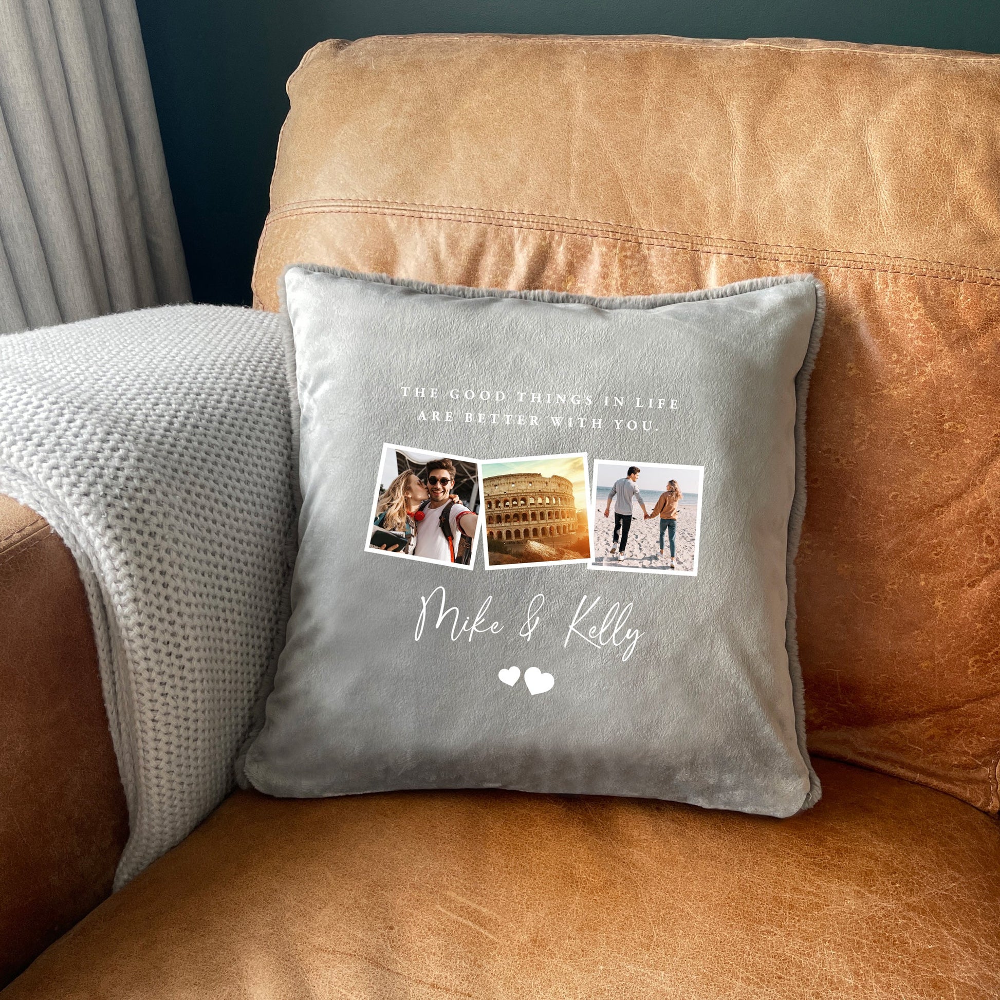 This personalised photo cushion is a lovely gift for a partner or a couple. Add your names, three favourite photos, and a special message on one side, while the other side is made of soft, plush material perfect for snuggling.