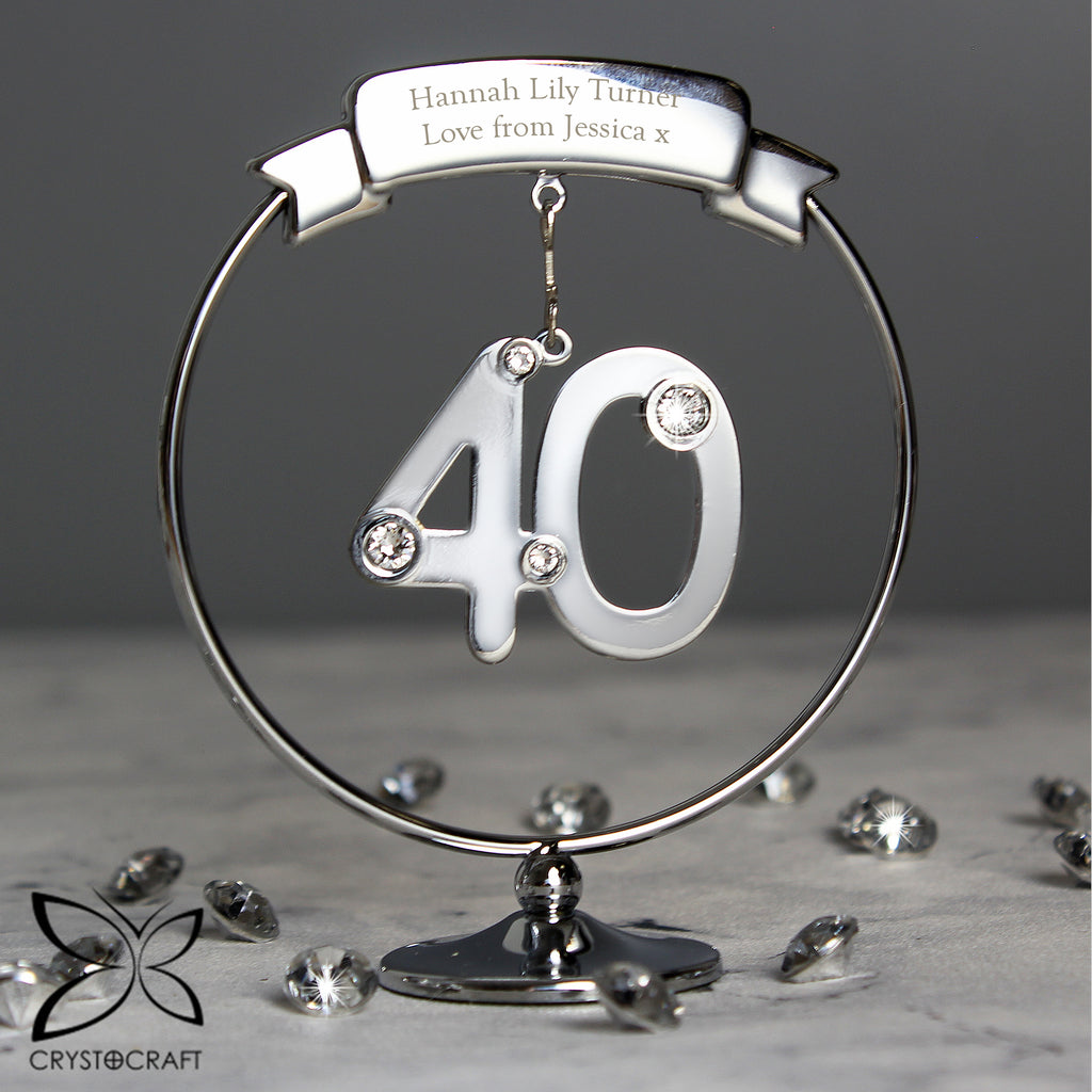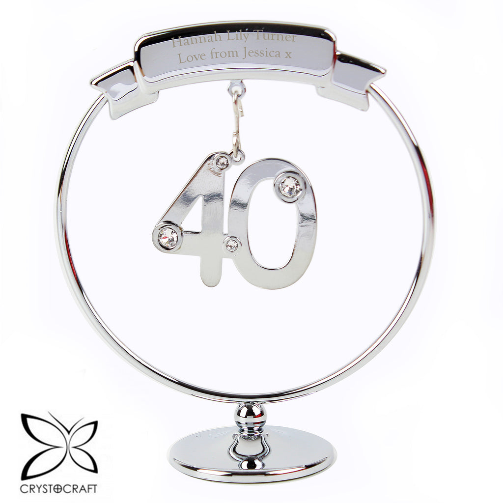 Mark their 40th Birthday or Wedding Anniversary with this elegant Crystocraft ornament. Dangling from a personalised round silver stand is a crystal clad 40. This will catch the light and bring a smile to the recipients face.