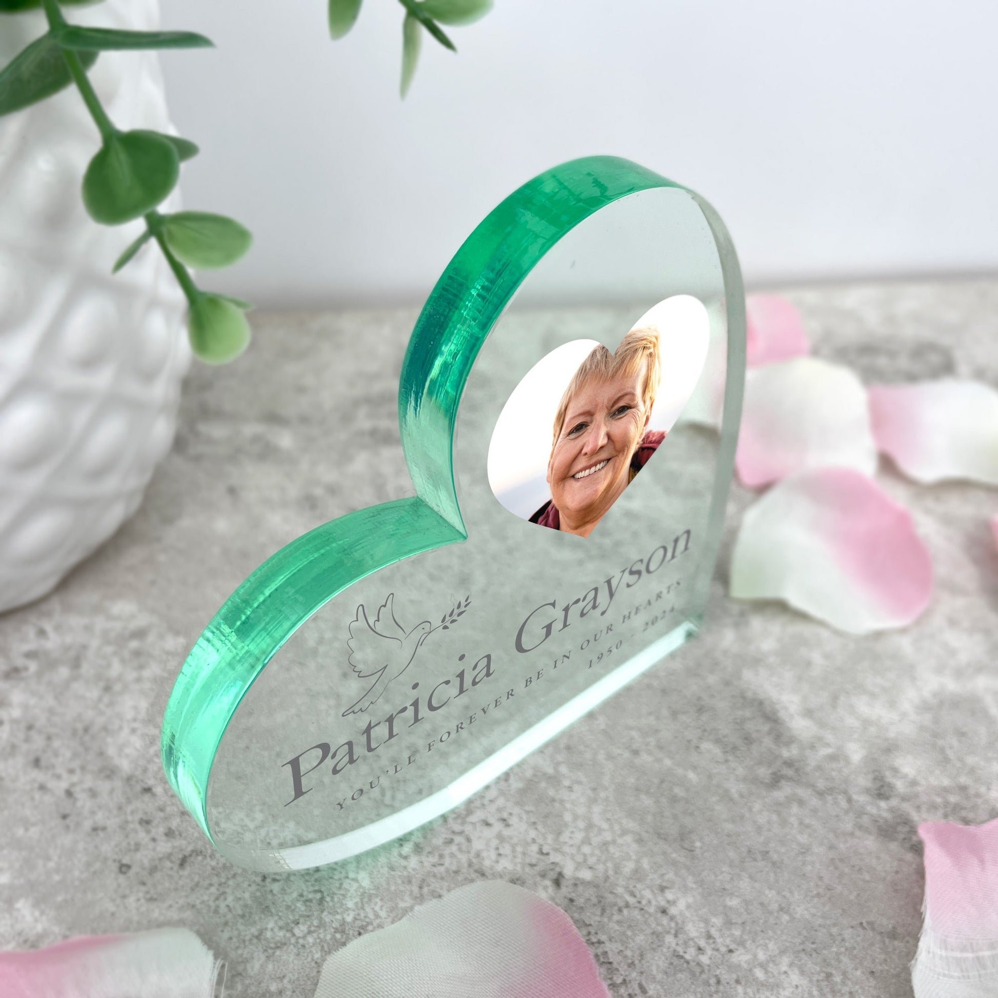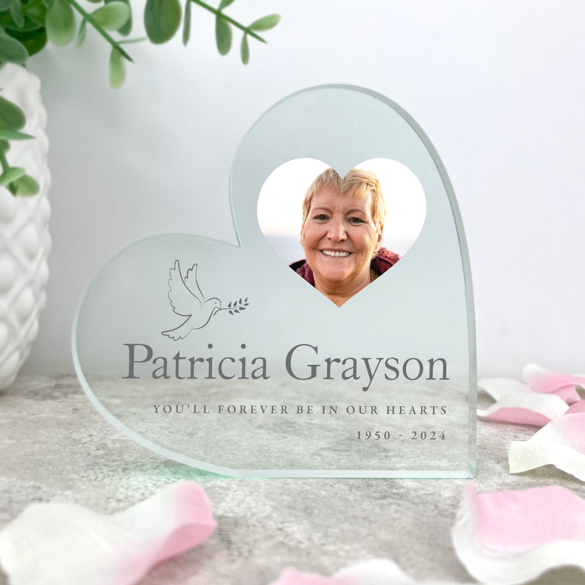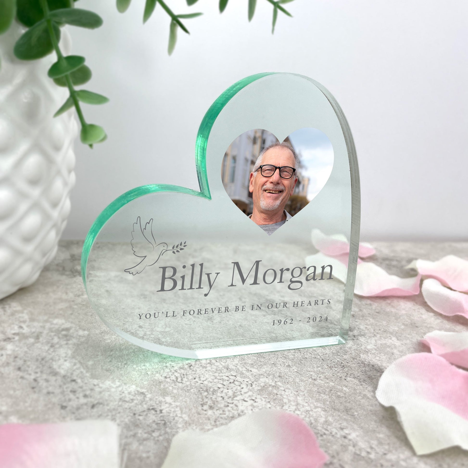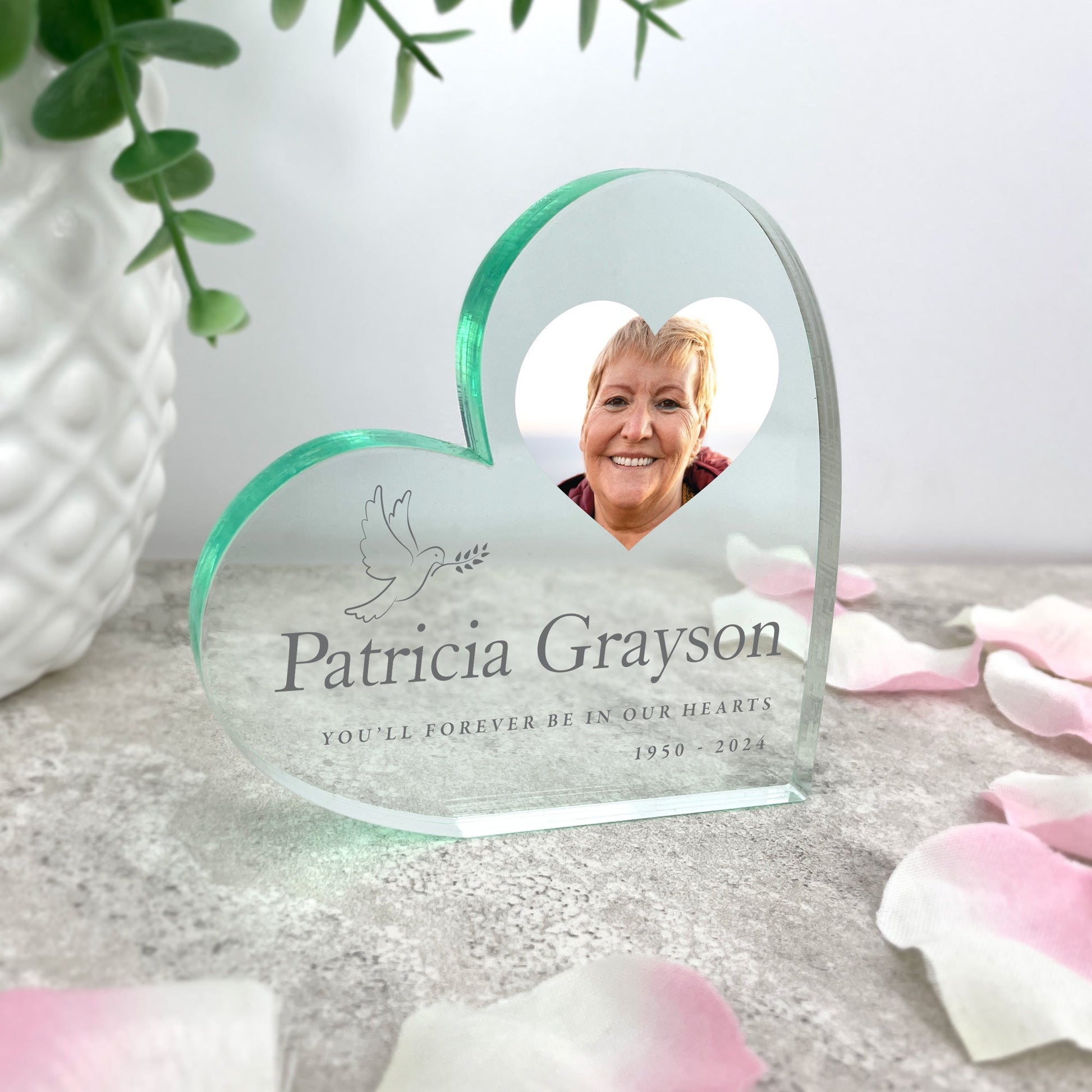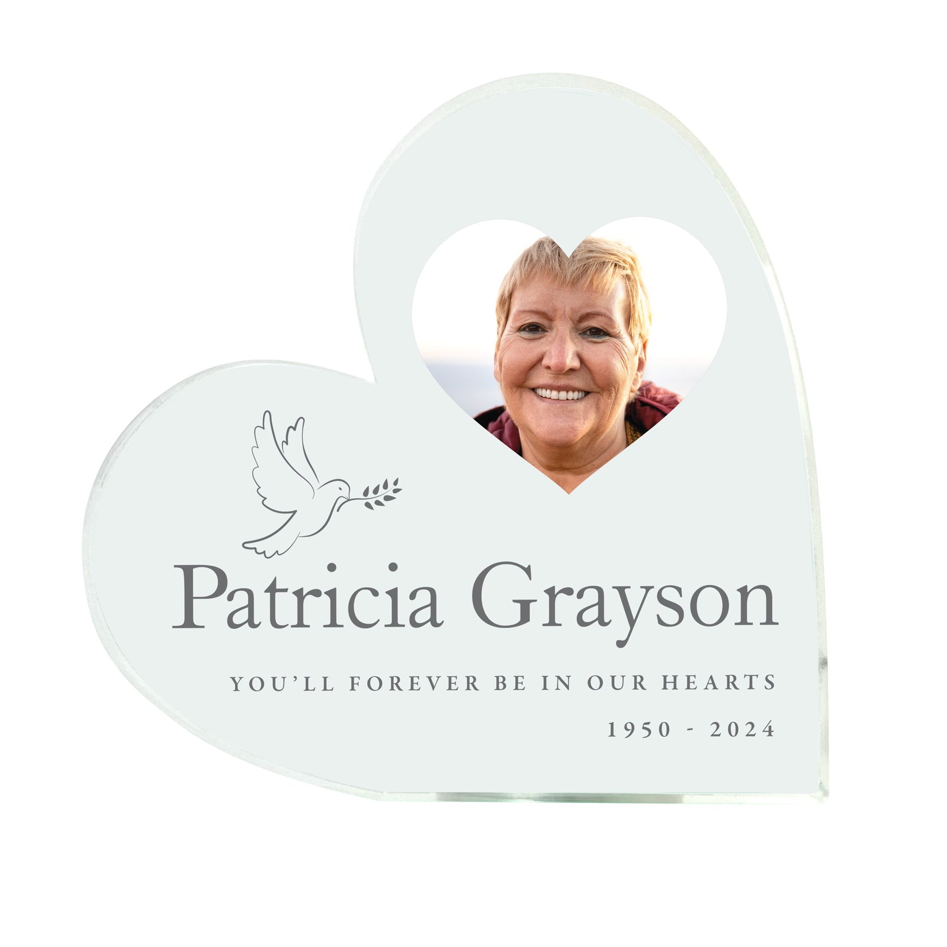 A beautiful memorial keepsake to honour someone you dearly miss in your home. This freestanding acrylic heart features a delicate dove design and lets you display your favourite photo of your loved one, along with their name, a line of text, and dates.