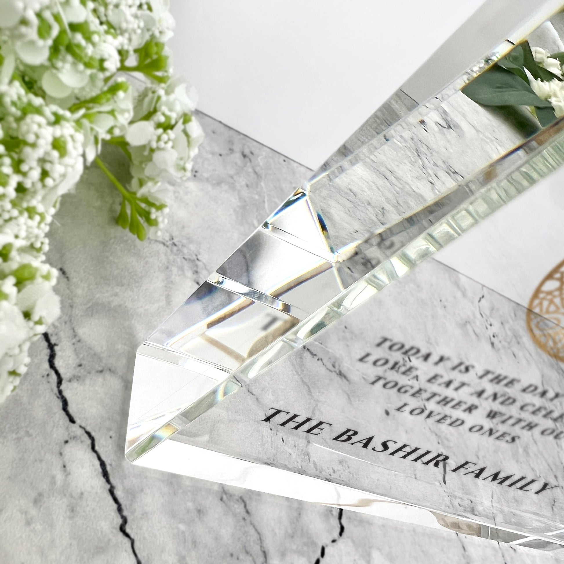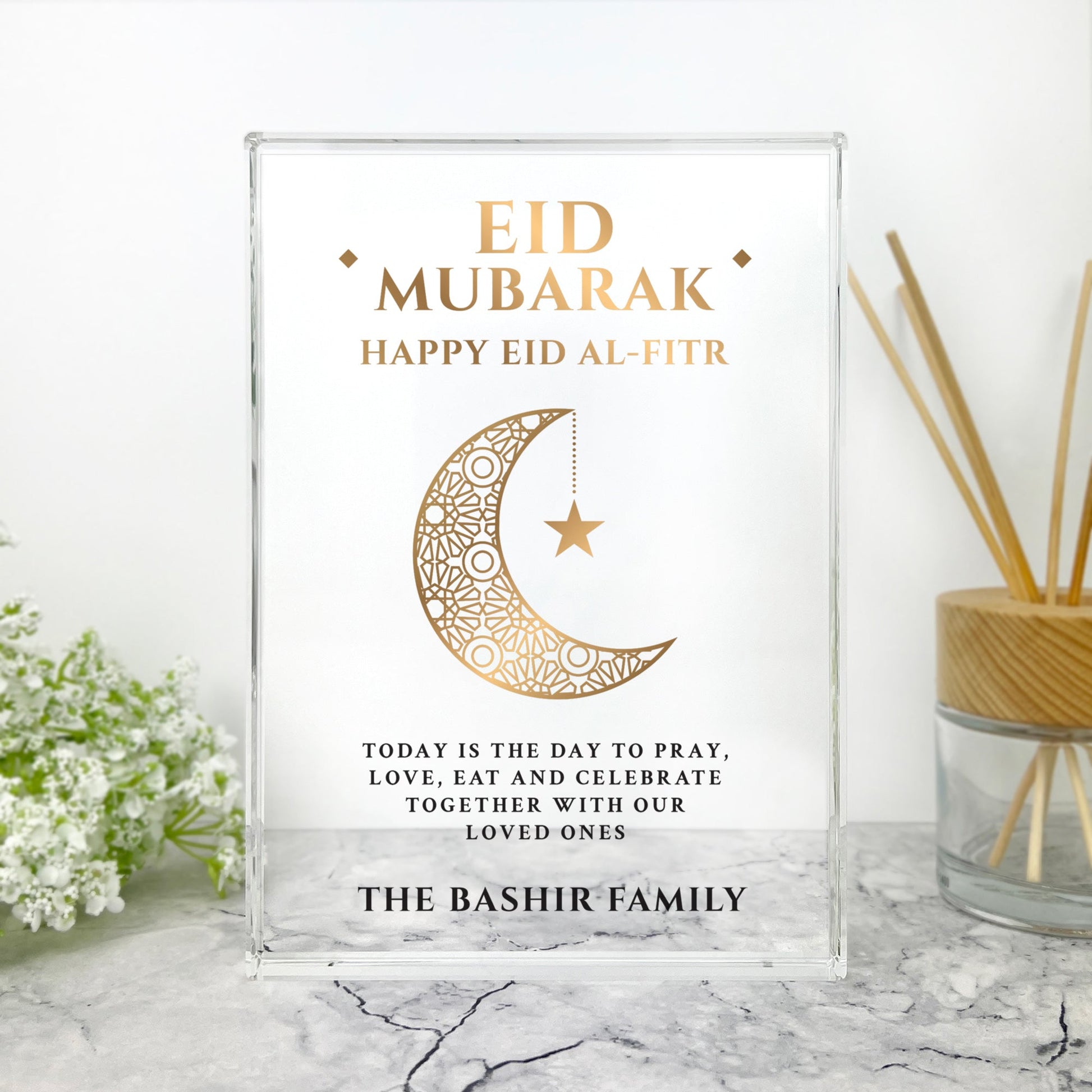 Celebrate Eid al-Fitr with this stunning luxury crescent moon crystal ornament. Expertly crafted from high-quality optical crystal with exceptional clarity and a flawless polished finish, it beautifully reflects light and symbolises faith, gratitude, and renewal. Personalise with your own custom message, family name, or special date to create a bespoke keepsake. The refined Eid al-Fitr inscription makes it a perfect decorative accent for Islamic homes, prayer rooms, and seasonal displays. A meaningful gift that will be treasured for years to come.