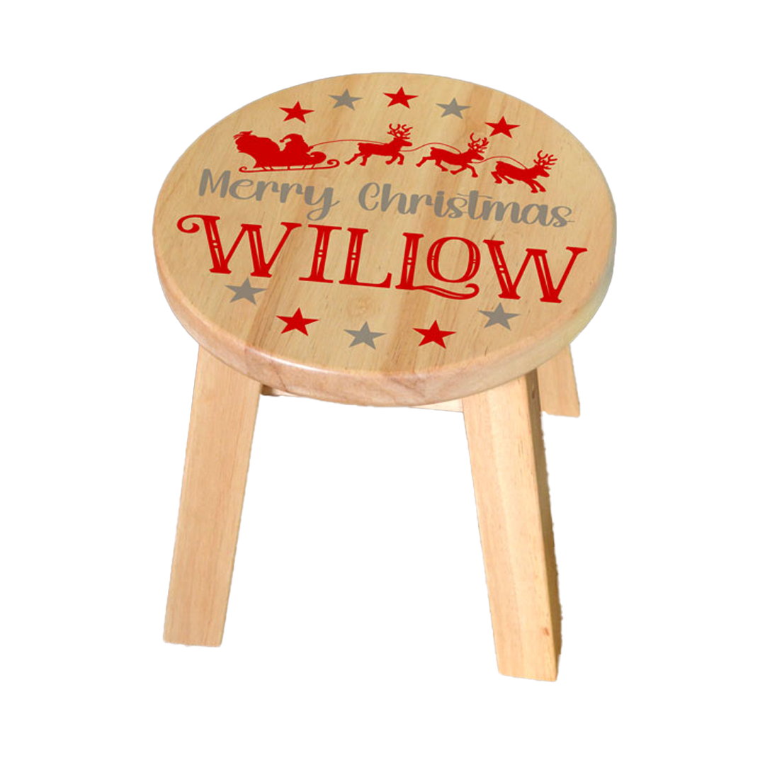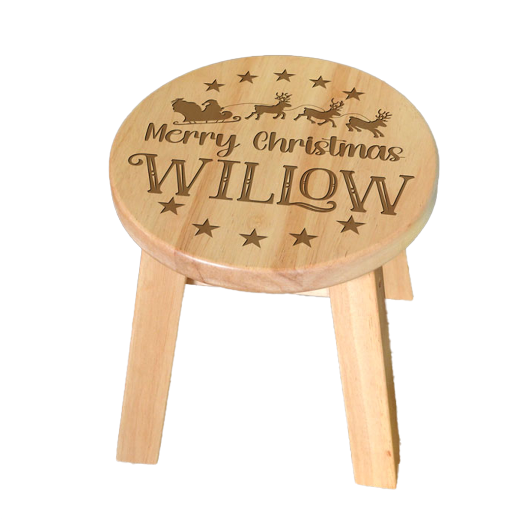 - Personalised Festive Design: Our Custom Christmas Stool offers the choice between engraved or full-colour printed designs. The delightful design features Santa and his reindeer soaring above the heartwarming words "Merry Christmas," followed by your child's name. It's a cherished keepsake that captures the spirit of the season.