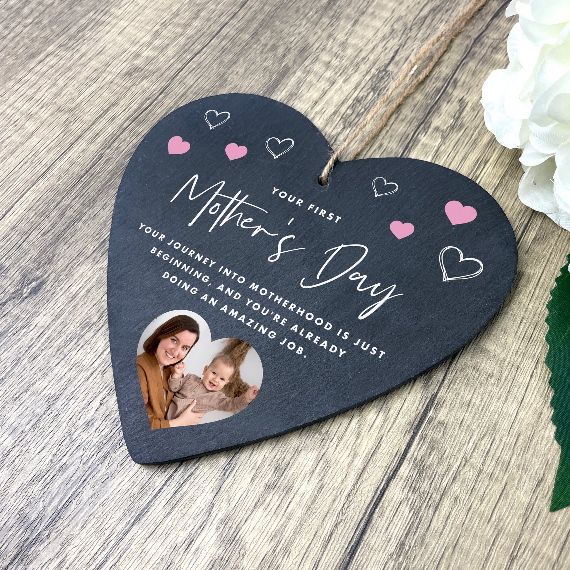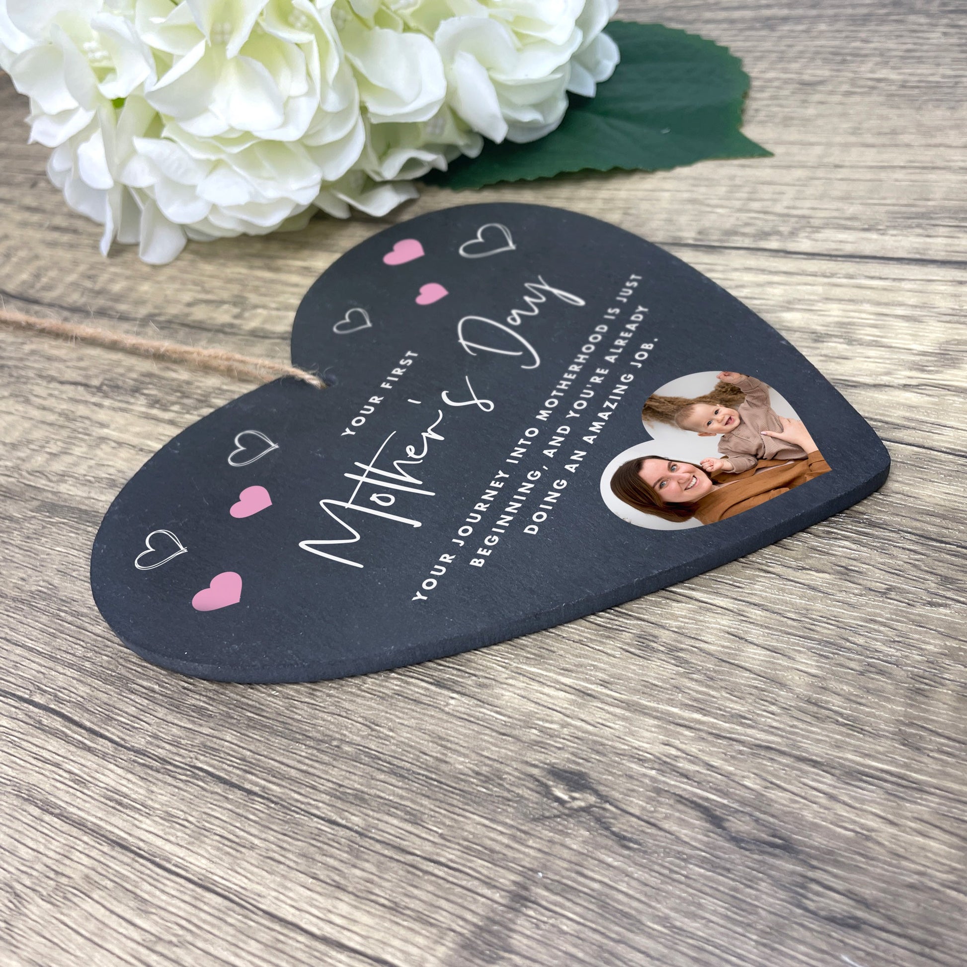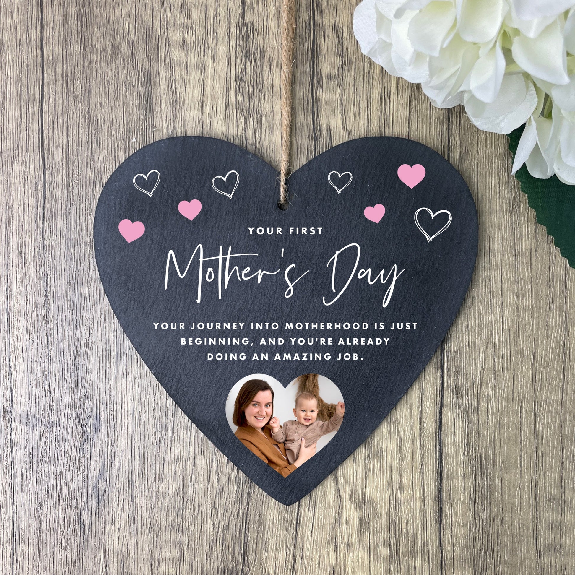 Personalised First Mother's Day Photo Slate Hanging Heart