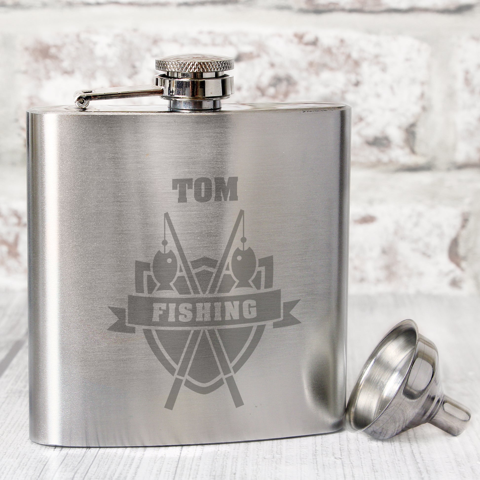 You can personalise this Hip Flask with a name up to 12 characters which will appear at the top. The word 'FISHING' is fixed text.