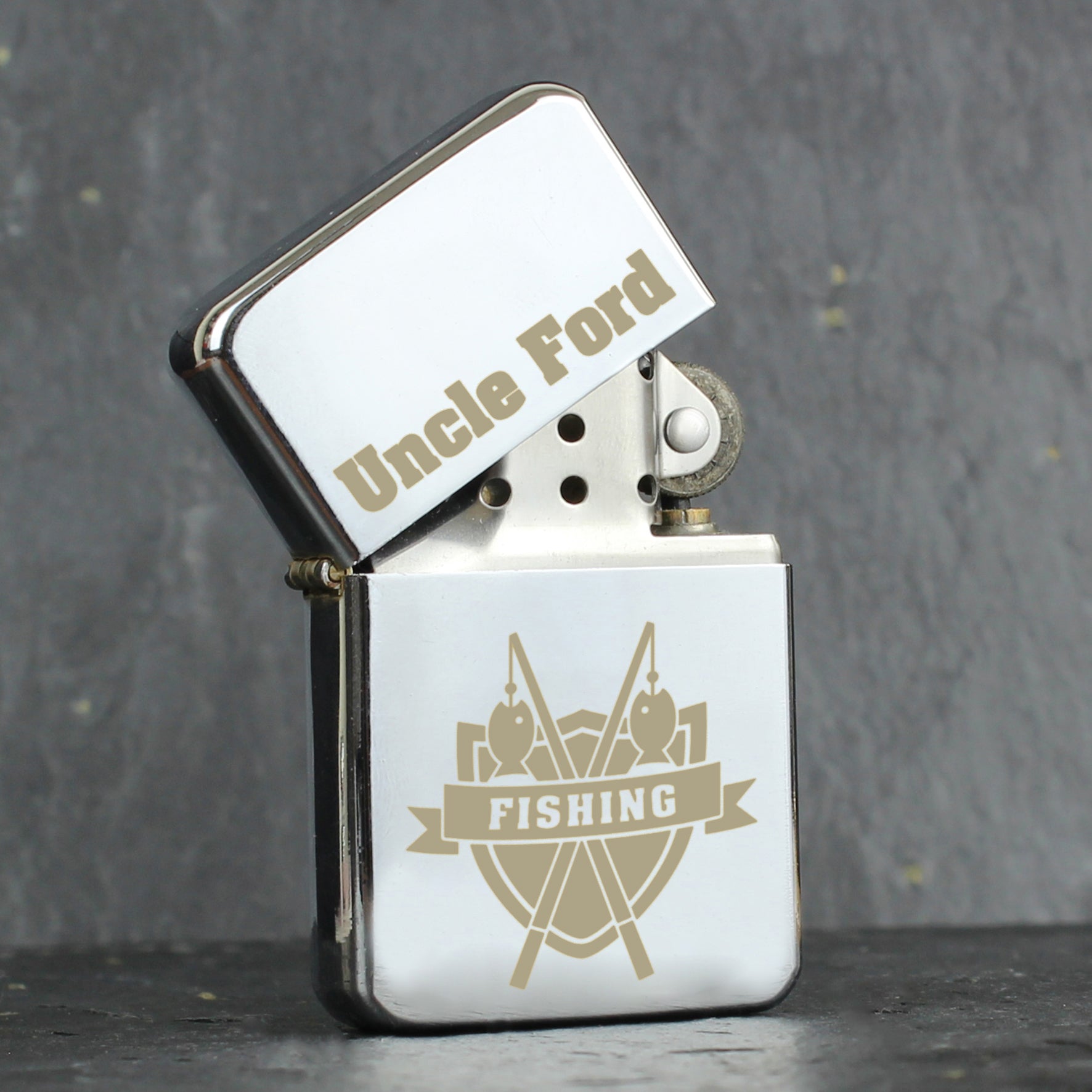 You can personalise this Lighter with a name up to 12 characters which will appear at the top. The word 'FISHING' is fixed text. All personalisation is case sensitive and will appear as entered. If you require UPPERCASE then please enter in UPPERCASE.
