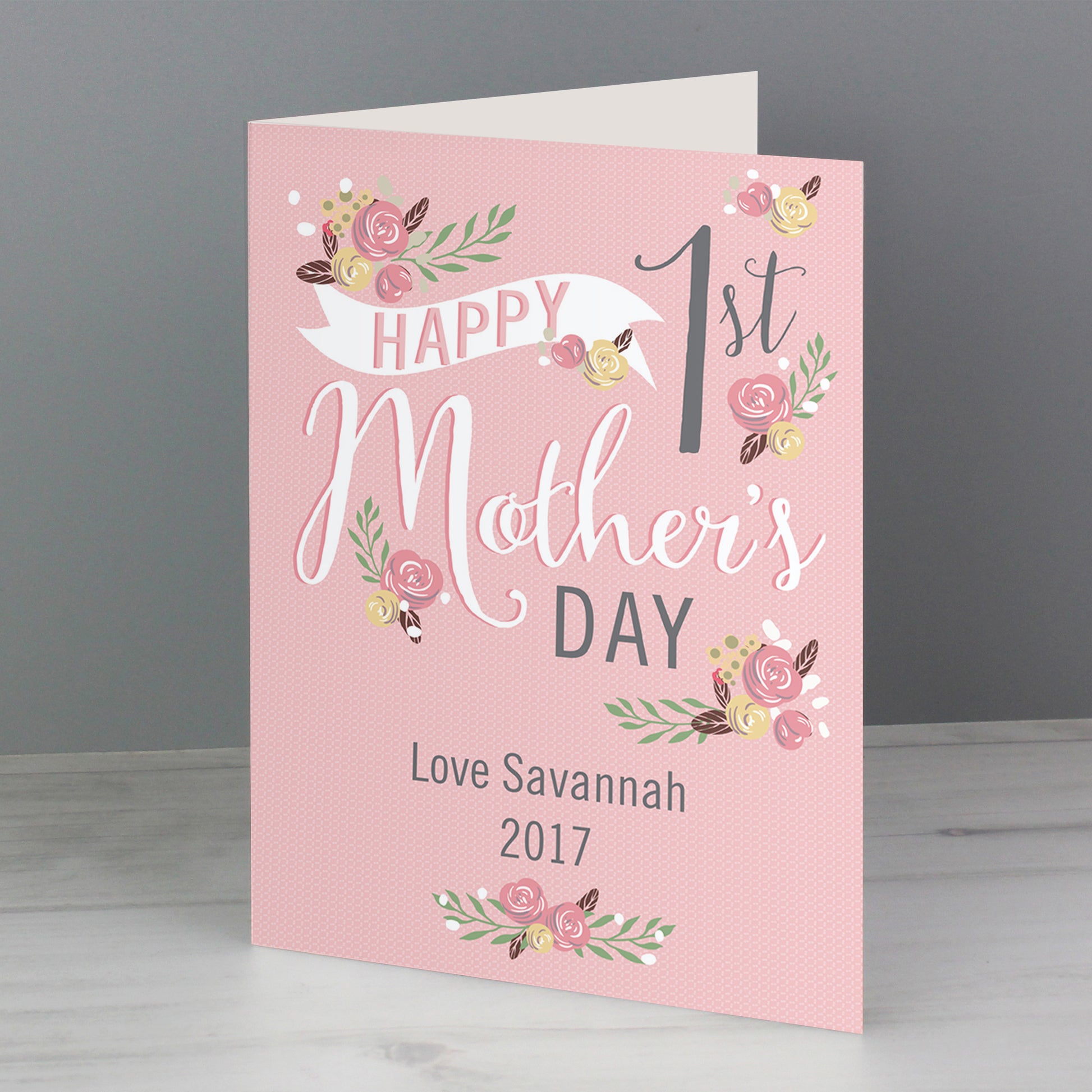 Personalise the front of this card with 2 lines of text up to 15 characters per line. The words 'HAPPY 1st Mother's DAY' are fixed.