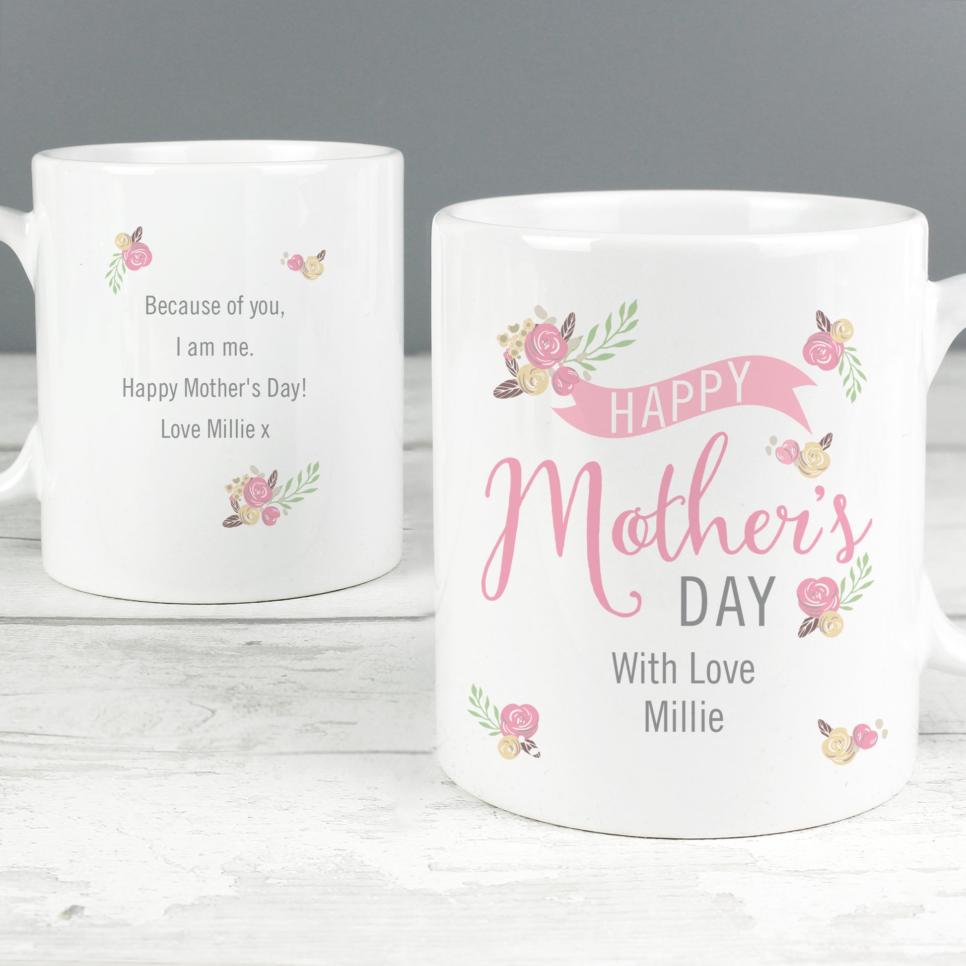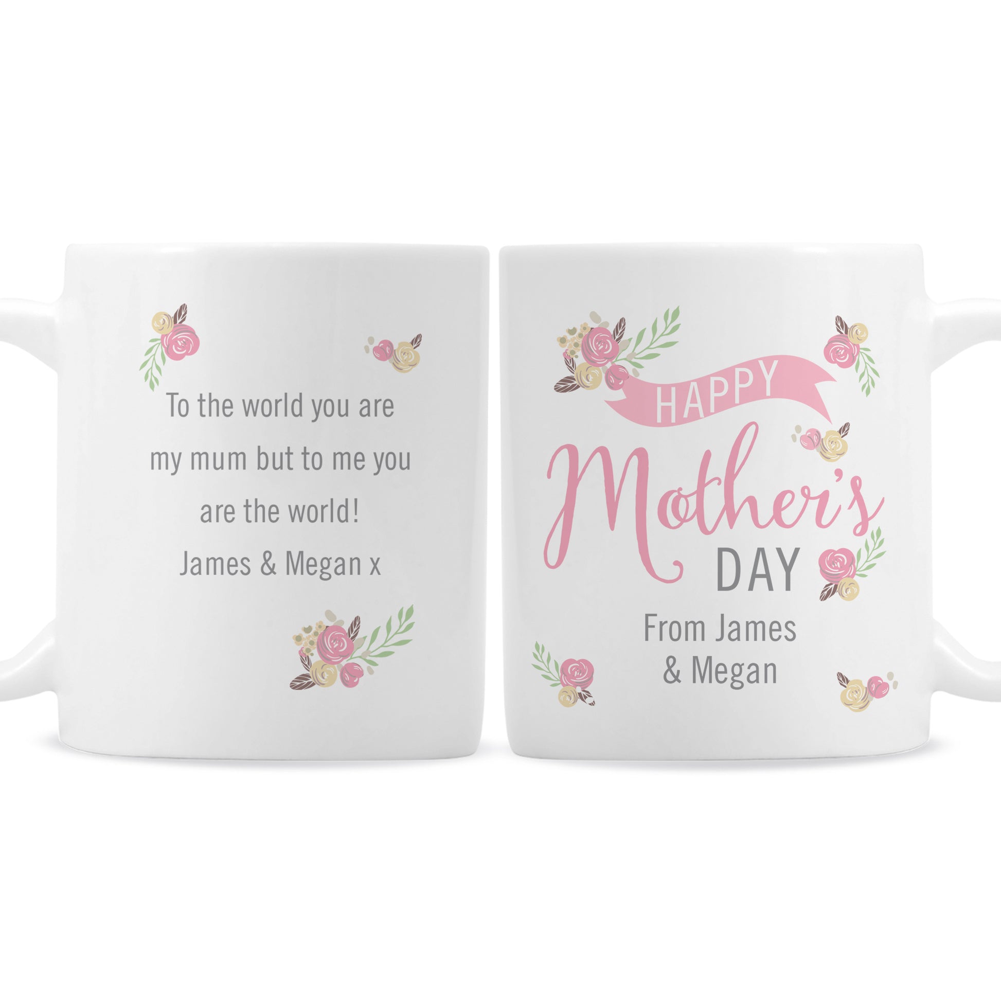 Personalise the front of this slim mug with 2 lines of text up to 15 characters per line. The words 'HAPPY Mother's DAY' are fixed.