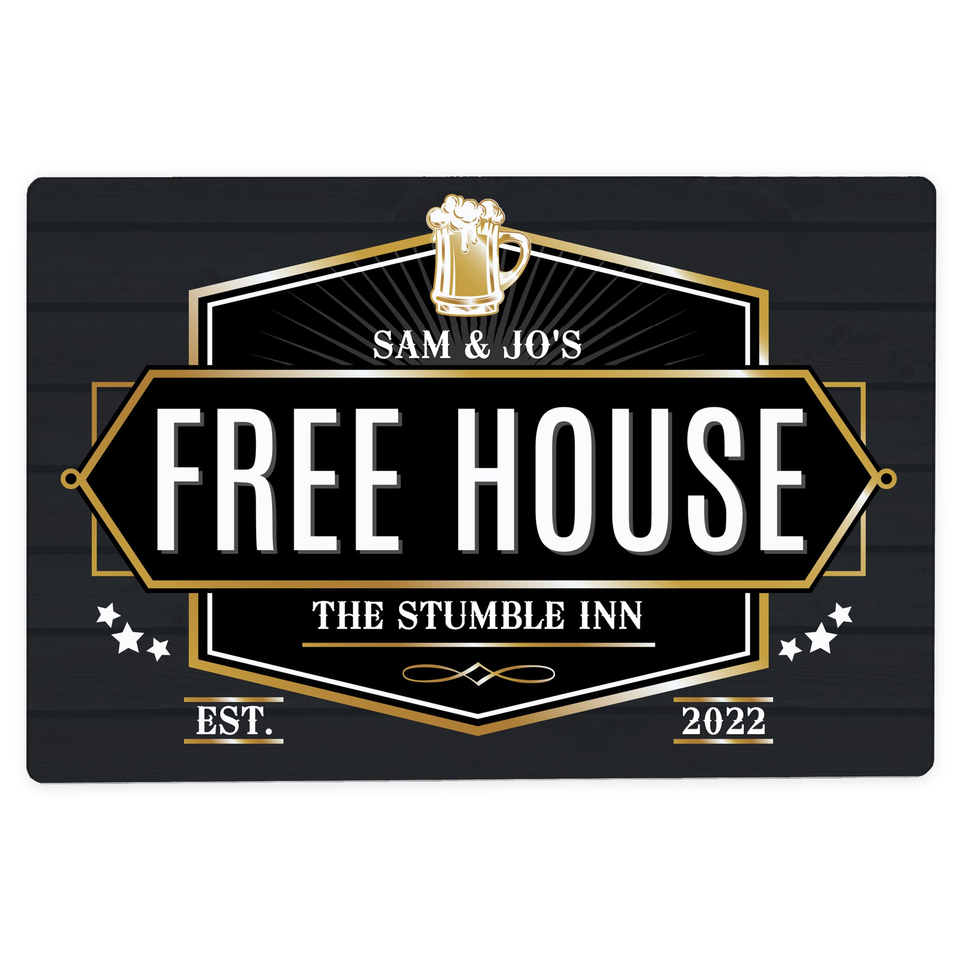 Personalise this sign with 2 lines of 20 characters per line and a year up to 4 characters long. "Free House" & "EST." is fixed text.