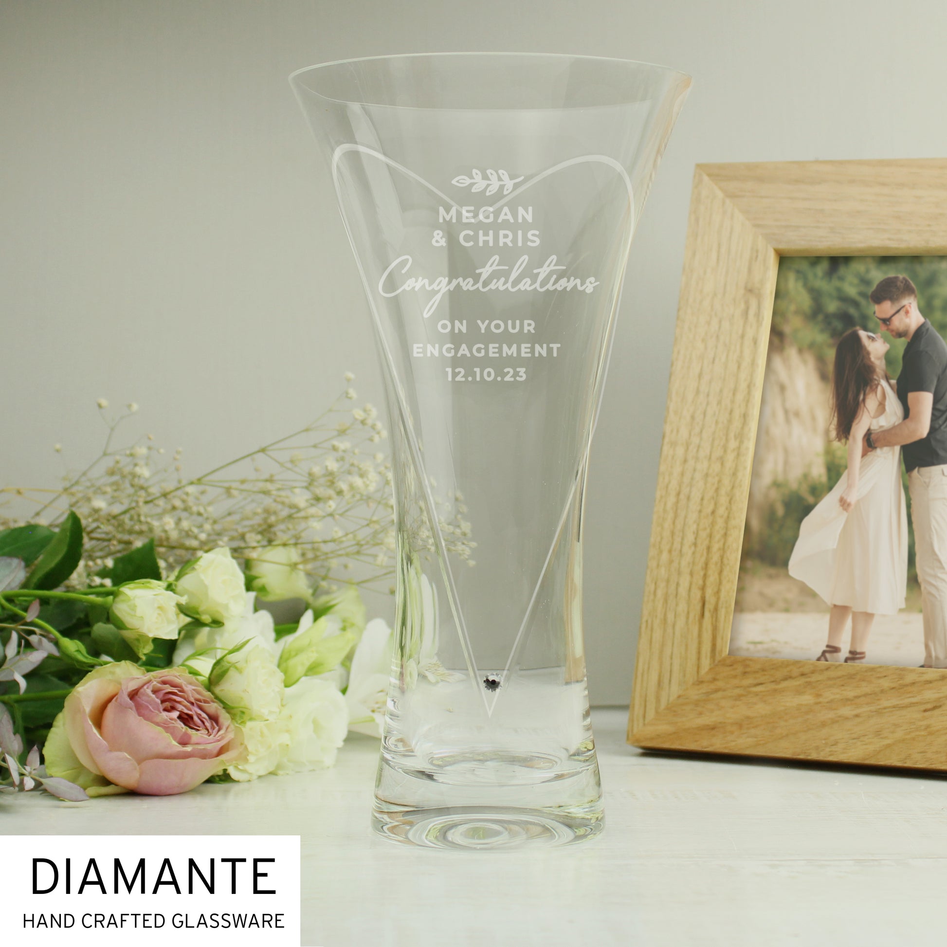 This diamante vase features a cut heart swirl design. It also features a small hearts design underneath the personalisation.