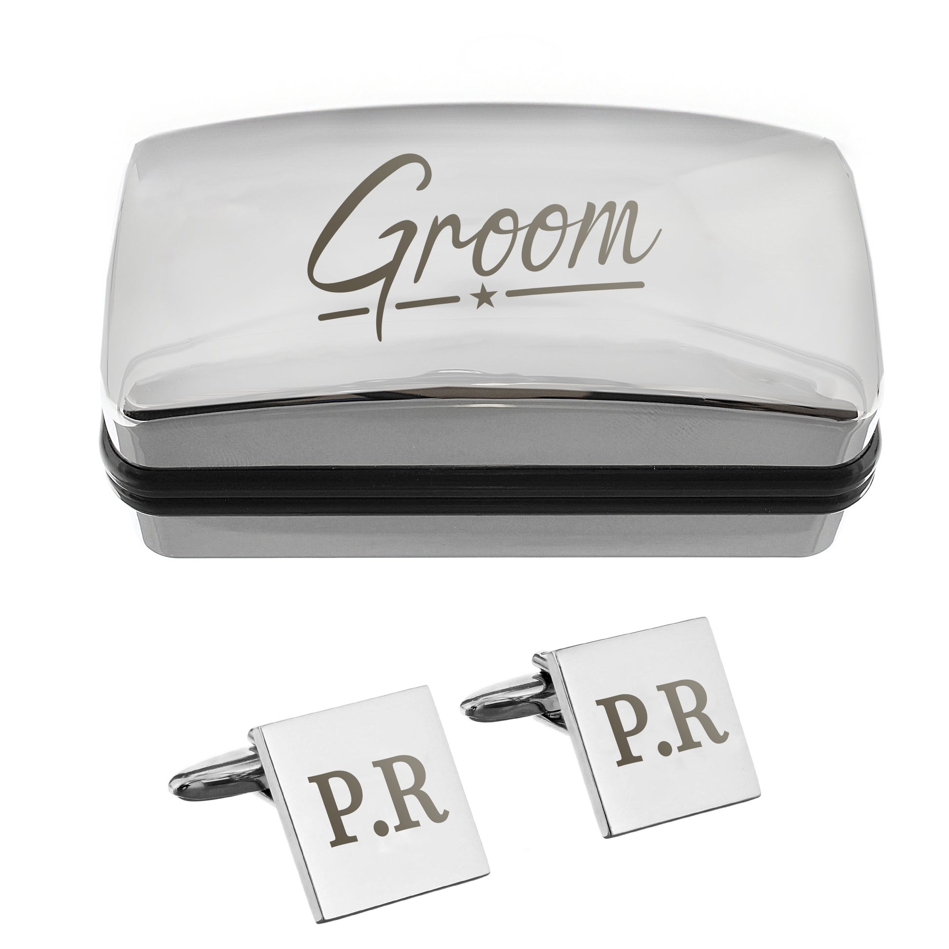Presented in a sleek chrome-effect box, the word "Groom" is engraved on the lid.